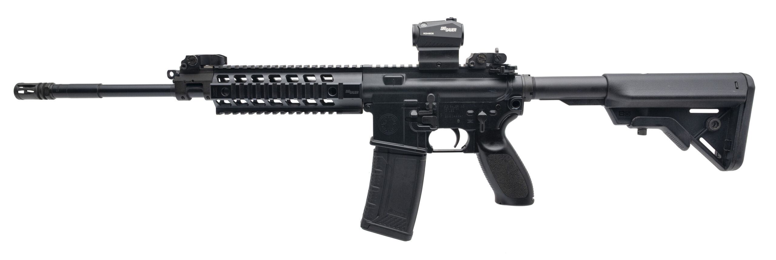 SN: 20K049641. Modern production. Semi-auto rifle chambered in 5.56 Nato with a 16" barrel. Overall condition is great with some light handling wear. Piston driven system, ambi safety and magazine release. Has a Sig Romeo5 red dot sight. Comes with one magazine.