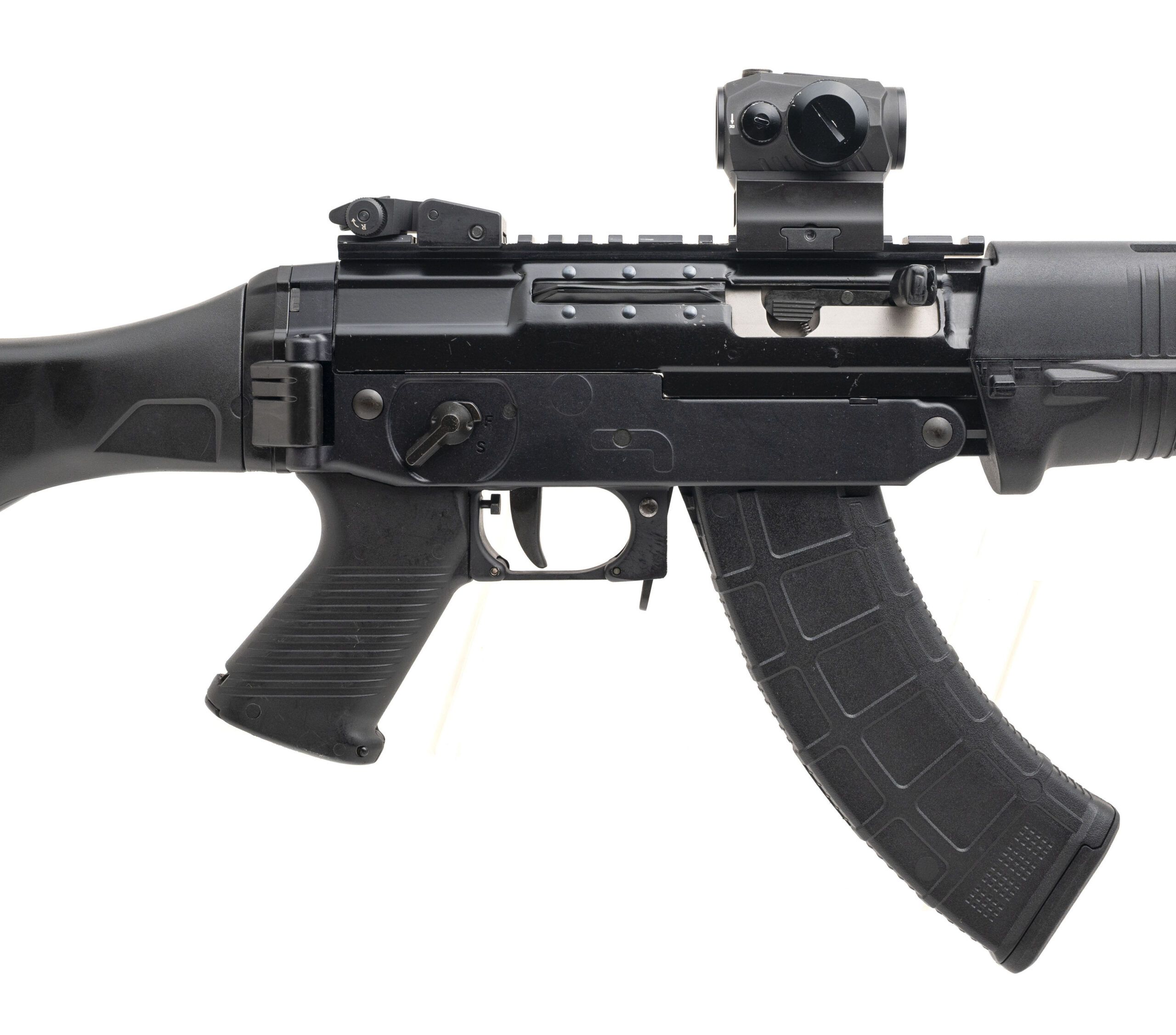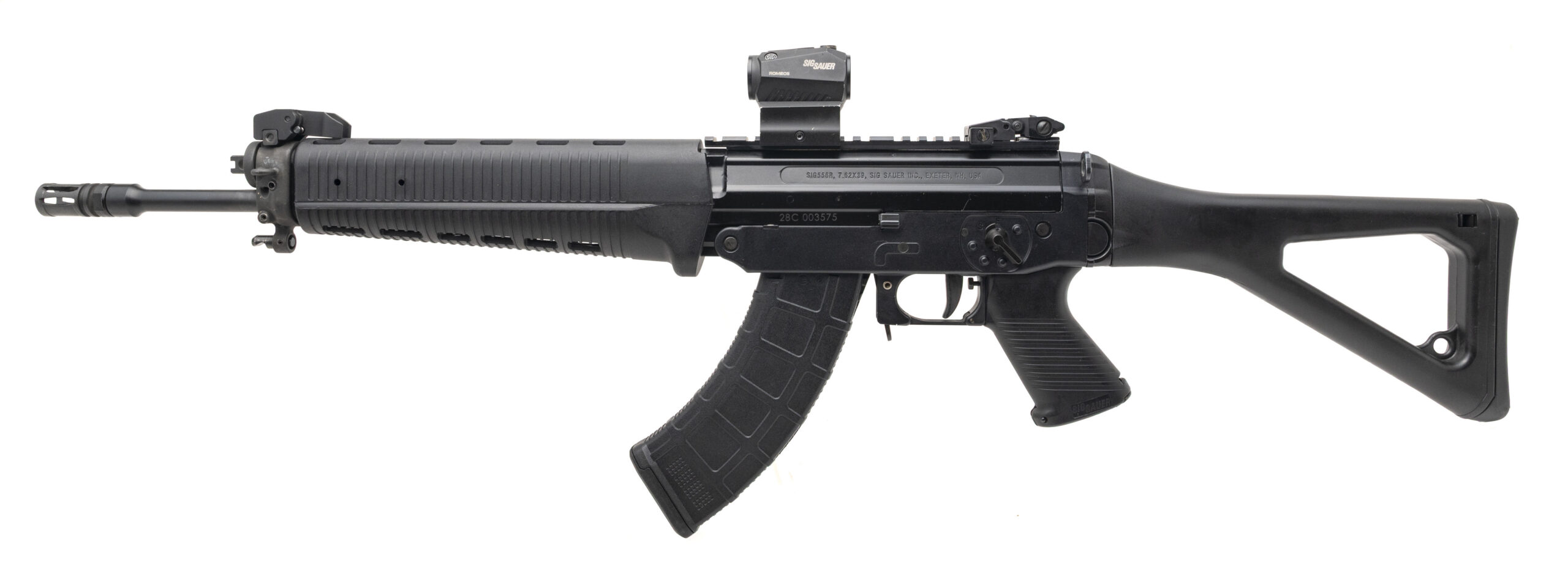 SN: 28C003575. Modern production, 7.62x39mm with a 16" barrel. Bore is very good. Piston driven tactical Sig Sauer Romeo5 red dot optic, flip-up iron sights, and a side-folding stock. Very good condition overall.