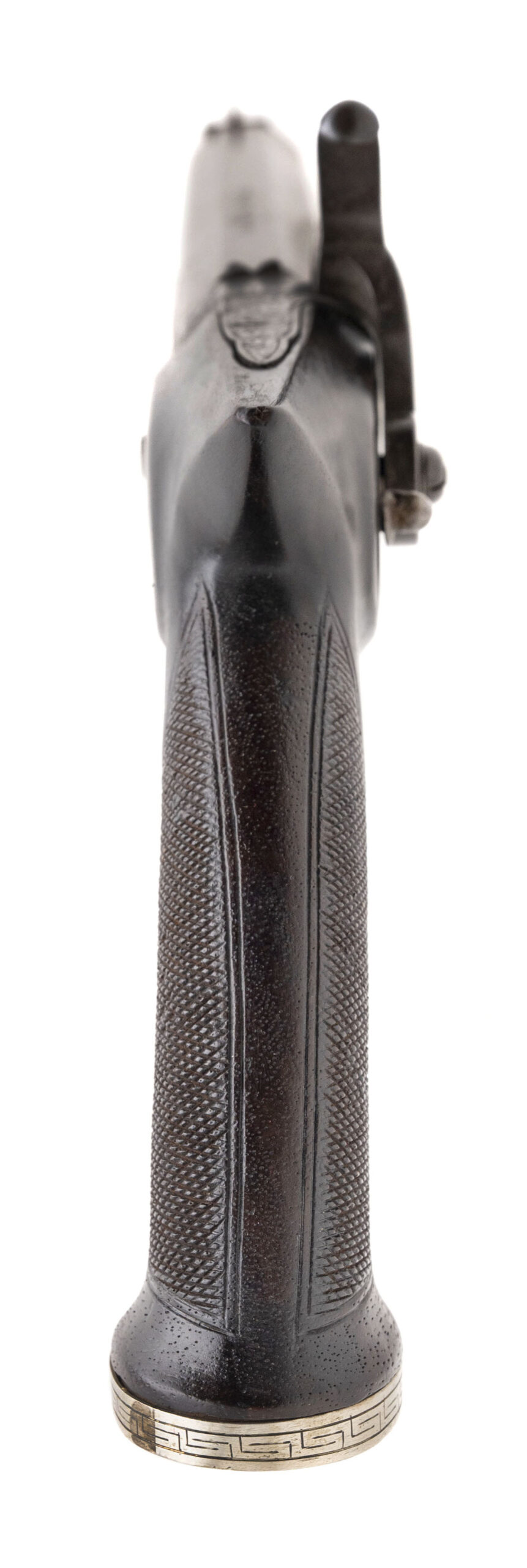 NSN. Made Circa 1840. 55 caliber with a 9.5” barrel. Barrel has a smooth light gray to brown patina. Wood is very good as refinished. The breech plug and upper tang is nicely engraved as well as the lock. The lock is marked “RICH. HOLLIS & SONS” and is nicely engraved. The trigger guard has silver hall marks. The top of the barrel is marked “VAN WIRT SON & CO LONDON” The hammer has a lock safety. This gun also has a set trigger. Van Wirt Son and Company purchased guns and exported them to the United States. This is a very nice gun with some deluxe features.