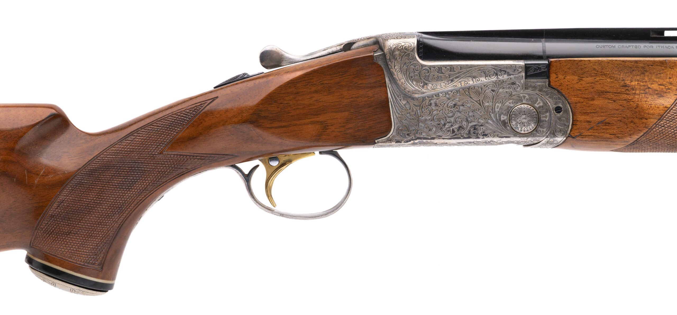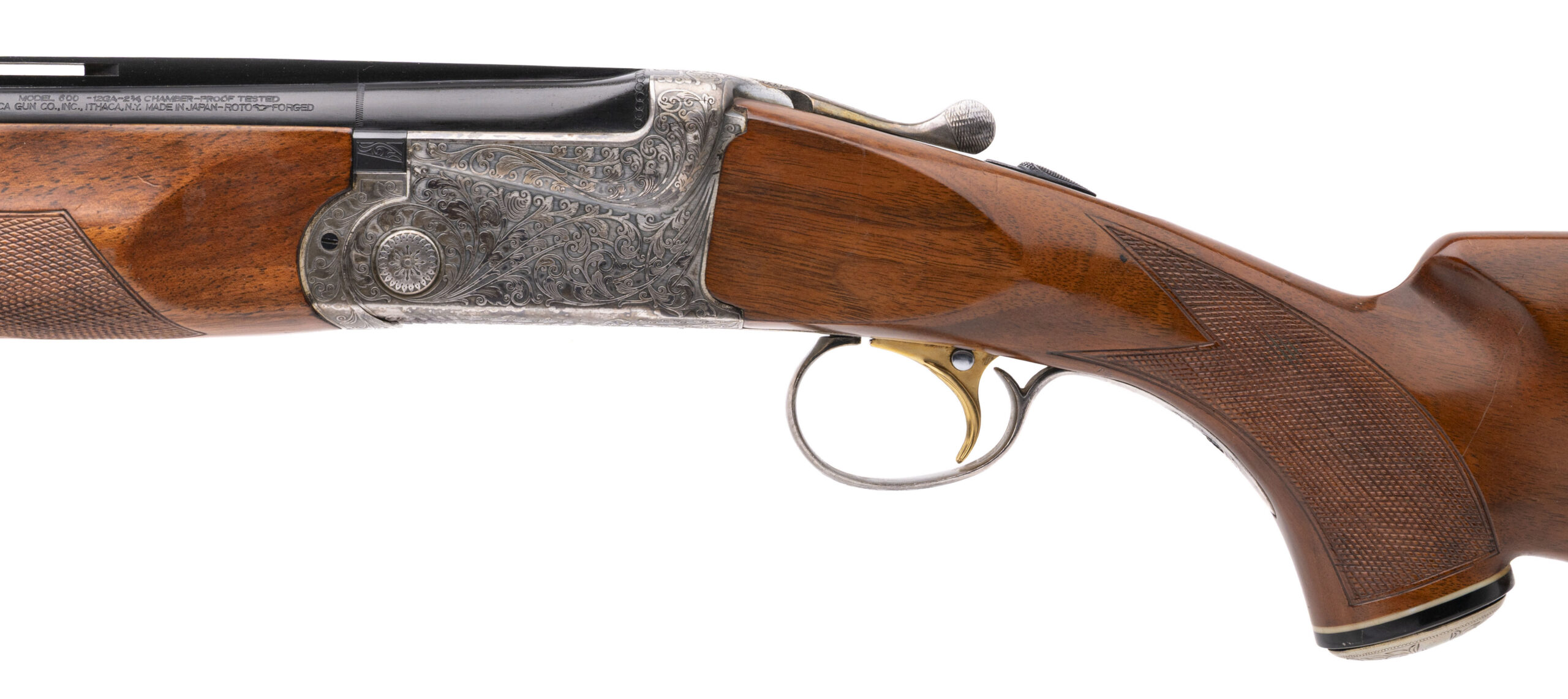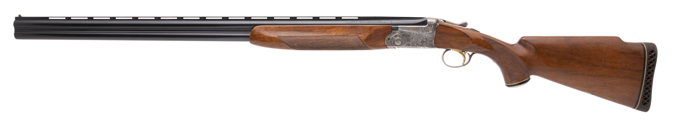 SN: S5617512 made in Japan circa 1980's. 12 gauge over under Trap & Sporting shotgun with 32" vent rib blued barrels, 2 3/4" chambers and fixed chokes MOD/FULL. Coin finished engraved receiver with a gold plated selective single trigger, ejectors and a manual safety. Checkered walnut furniture with a monte carlo stock, 14.25" LOP to the original pad and an engraved custom pistol grip cap. Moderate handling marks on the furniture and some wear on the receiver, barrels are in very good condition and bores are excellent.