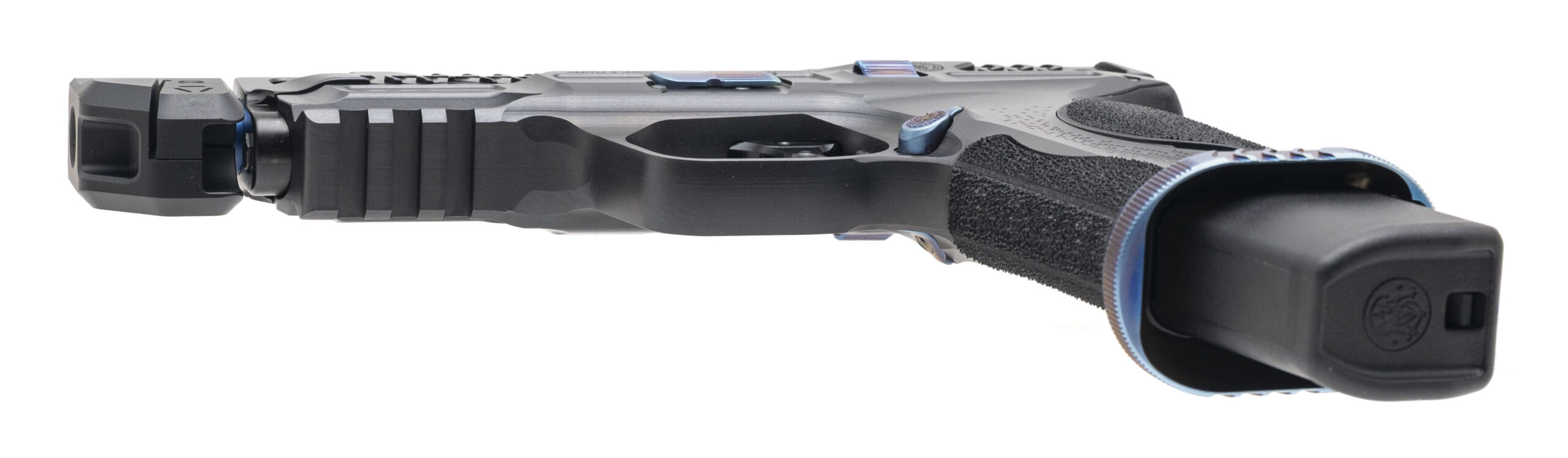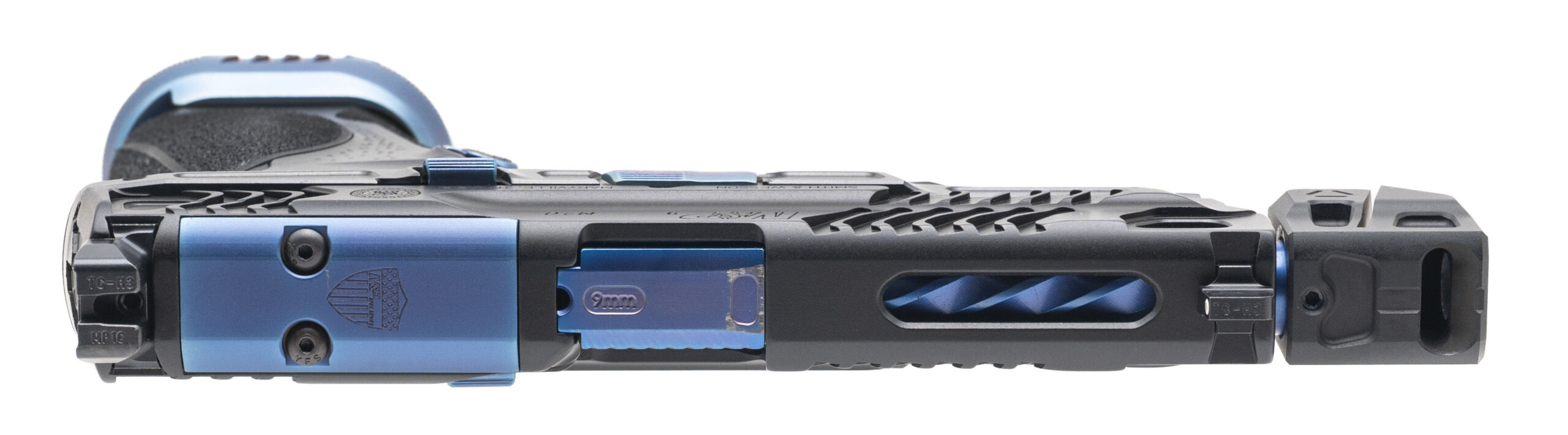 SN: SDT1462. Modern production, 9mm with a 4.875" spiral fluted blue PVD finished barrel w/Strike Industries compensator. Bore is excellent. Full size steel frame striker-fired pistol with an optics ready/lightening cut slide, co-witnessed front & rear night sights, ambidextrous slide release, flat faced trigger, accessory rail, flared magwell, and matte gray finish. Overall condition is excellent. Includes 2 additional magazines, pocket knife, challenge coin, and original case.