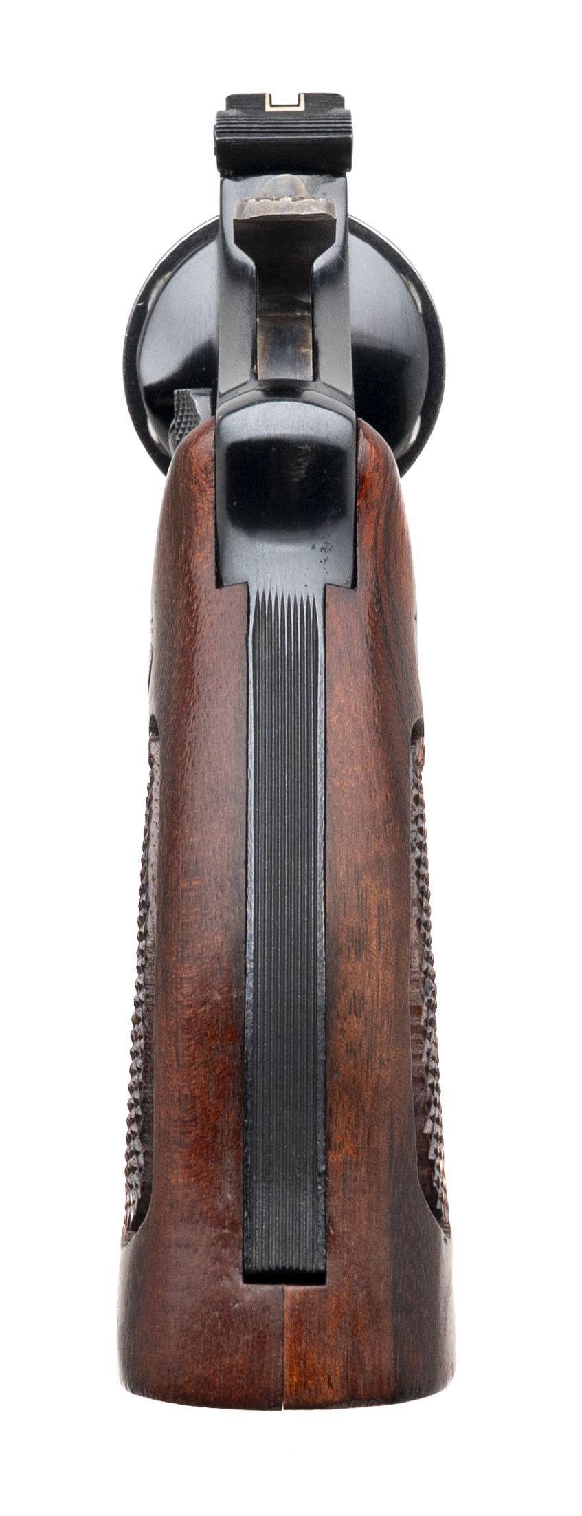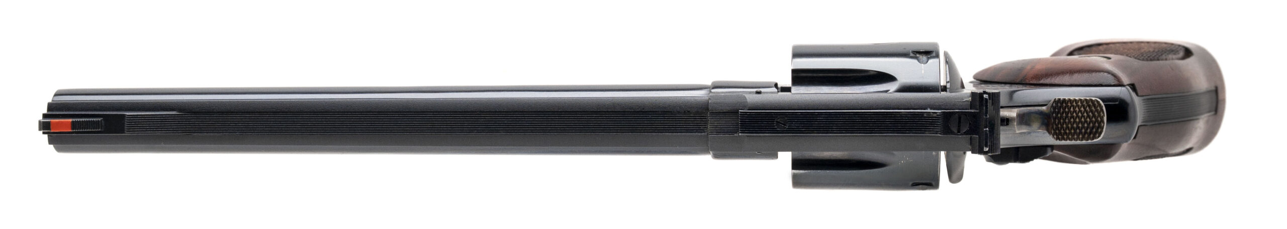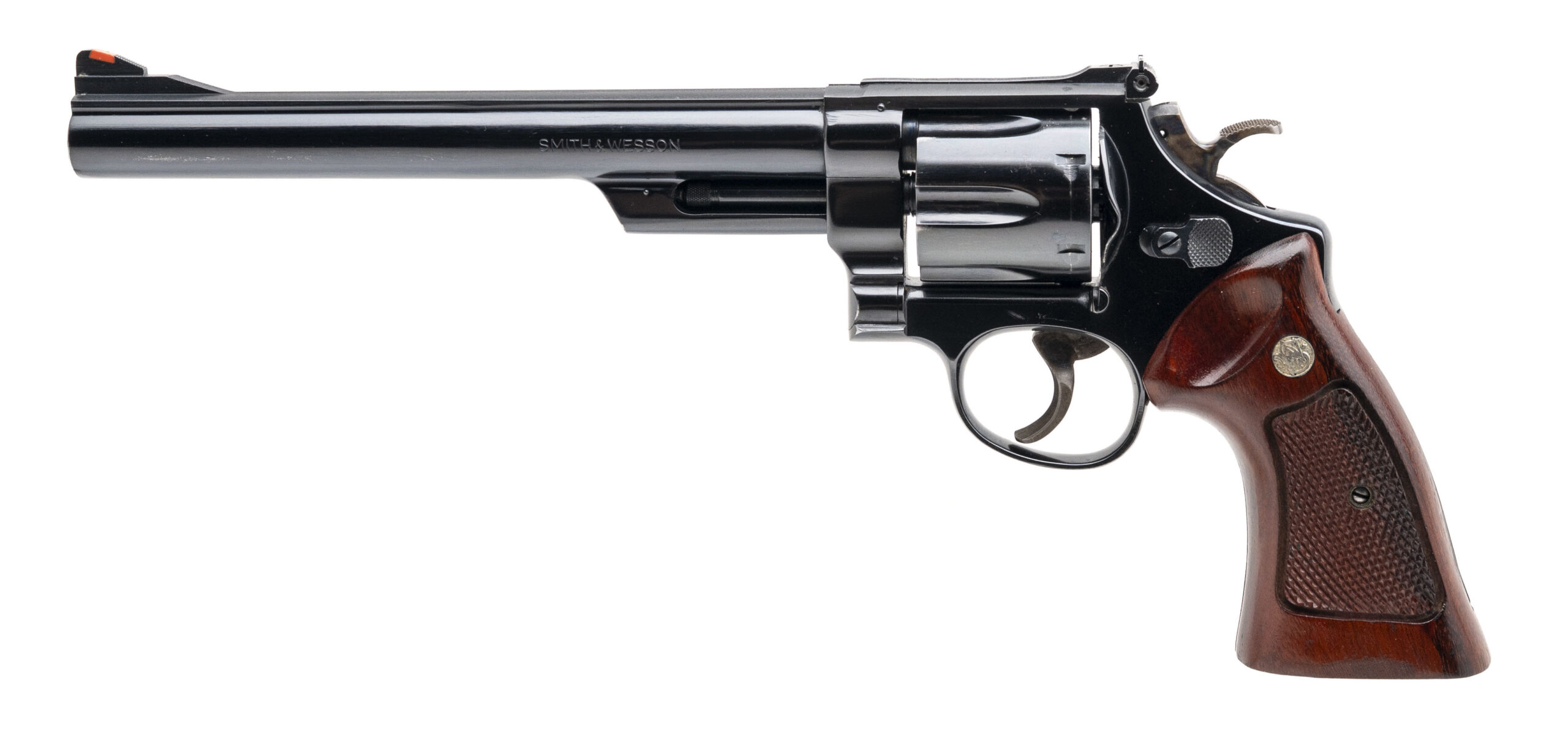 SN: N714787. Made in 1980, .45 Colt with a 8.375" pinned barrel. Bore is bright with strong rifling. Scarce N-frame revolver with a blued finish and checkered wood grips. Metal shows minor handling wear. Overall condition is very good. Comes with presentation style case w/blue liner and tools.