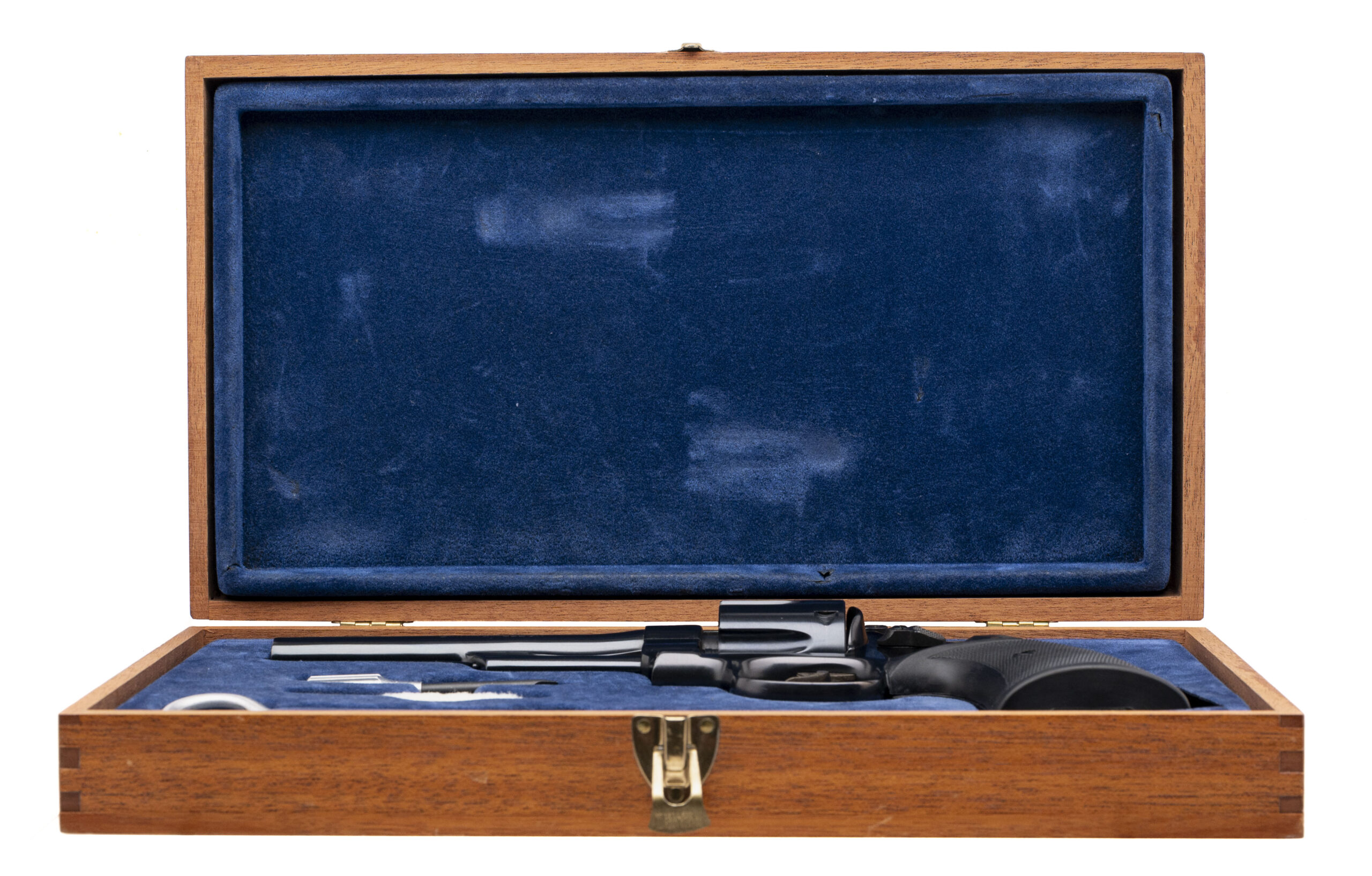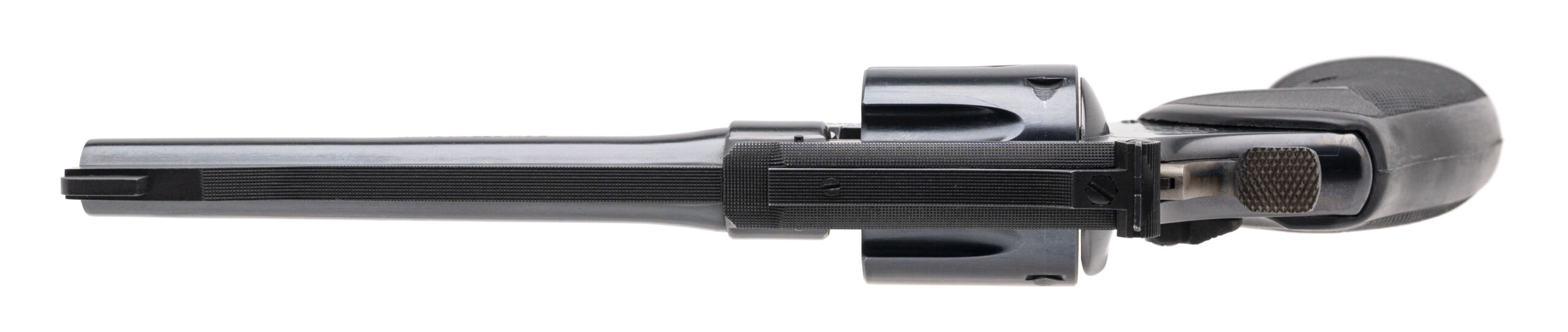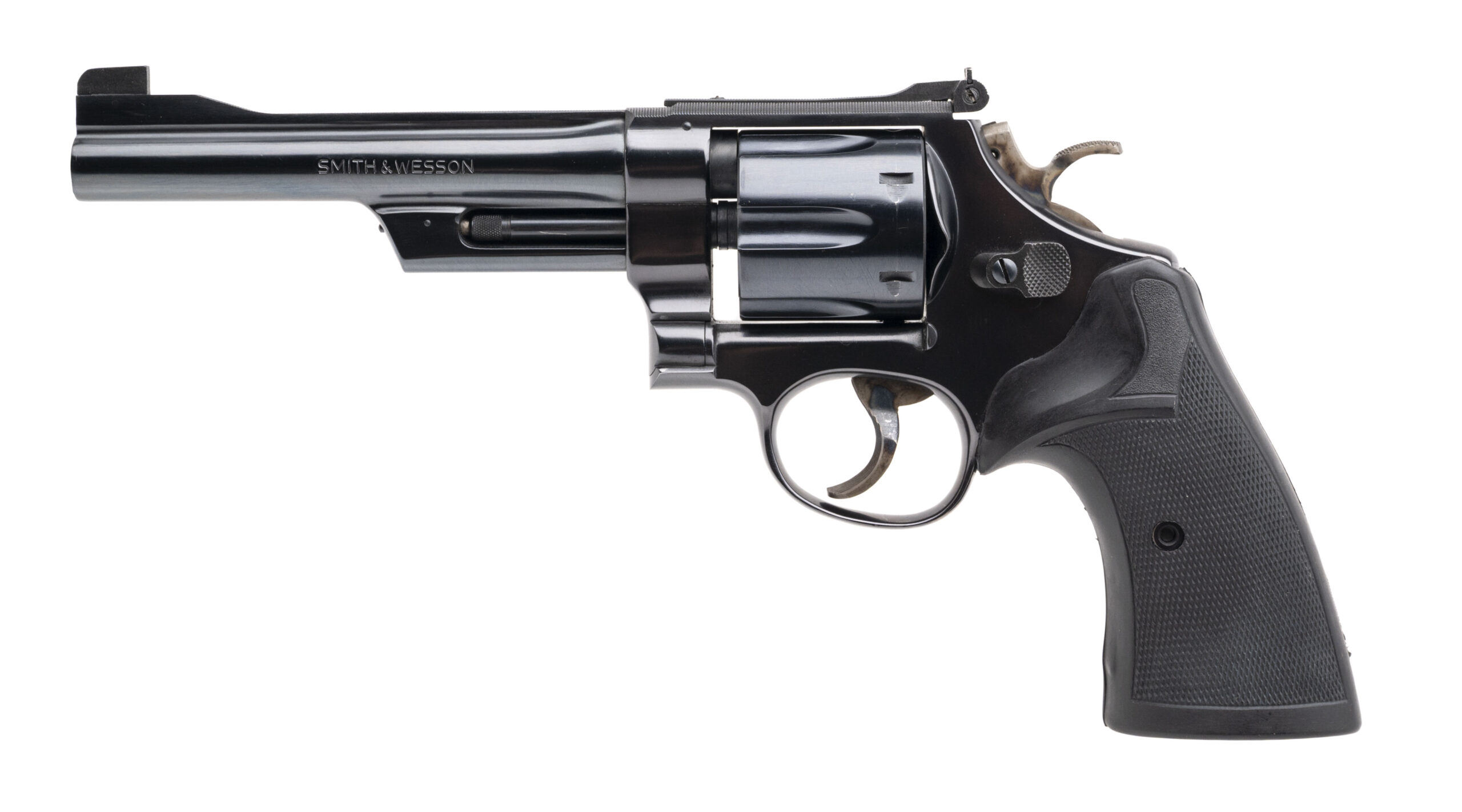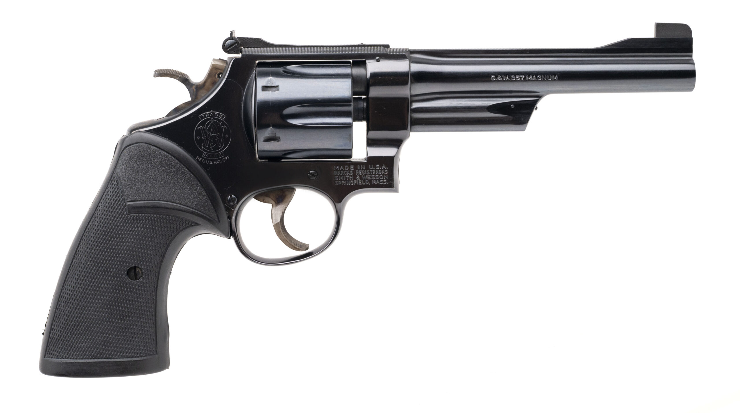 SN: N422754. Made in 1977, .357 Magnum with an 6" barrel. Bore is bright with strong rifling. Desirable N-frame revolver, pinned & recessed with blued finish and rubber grips. Overall condition is excellent. Comes with wooden presentation case w/blue outliner, tools, and papers.
