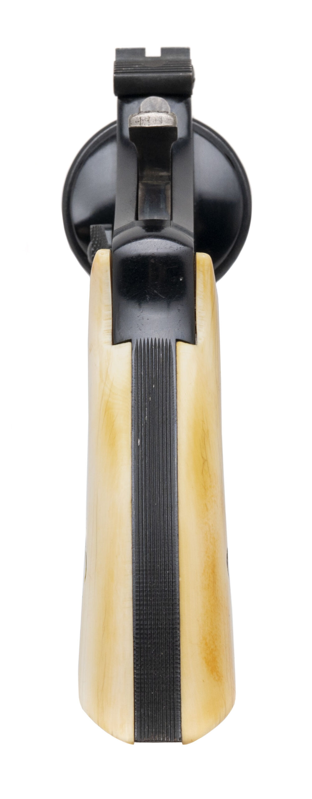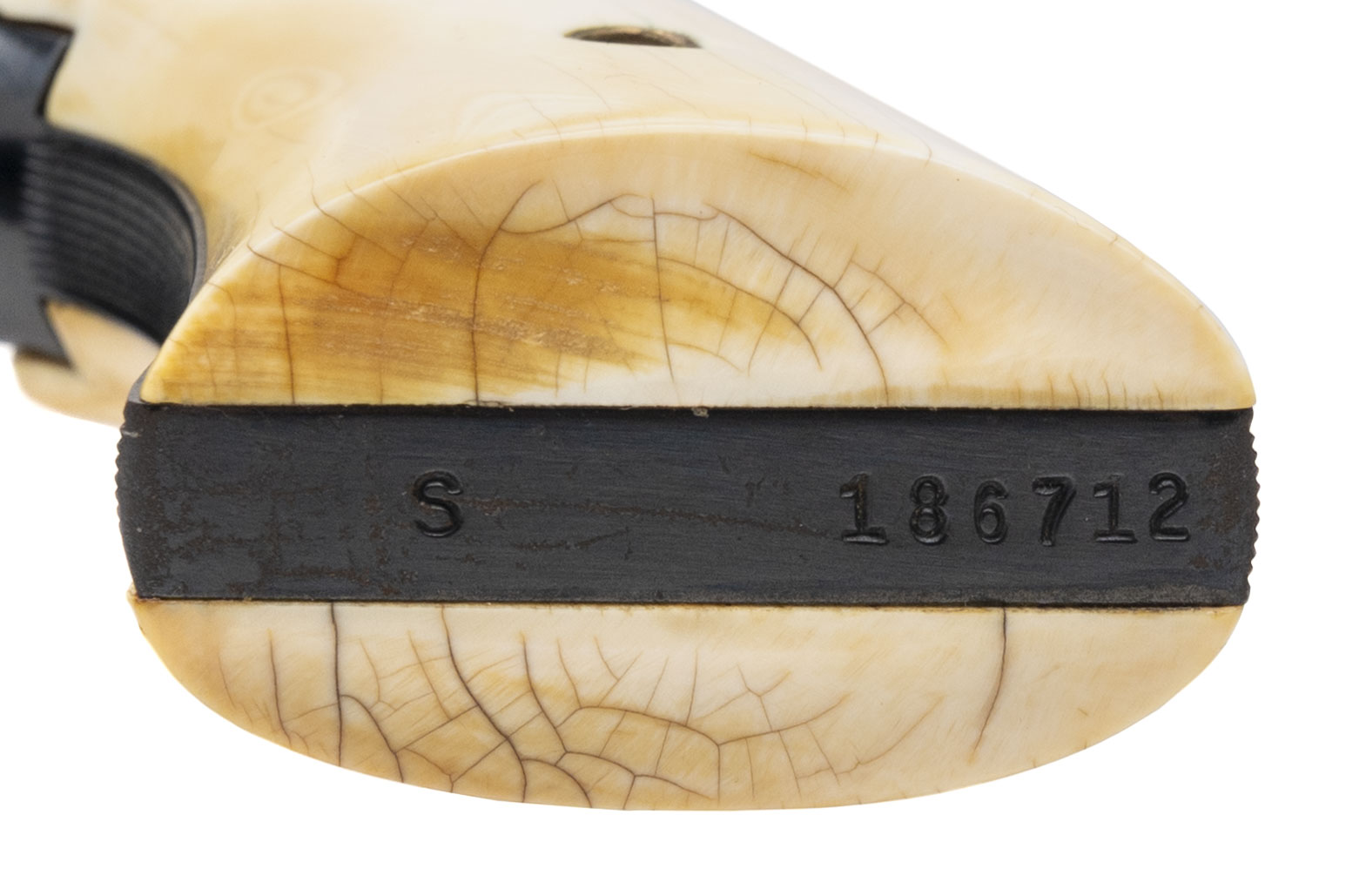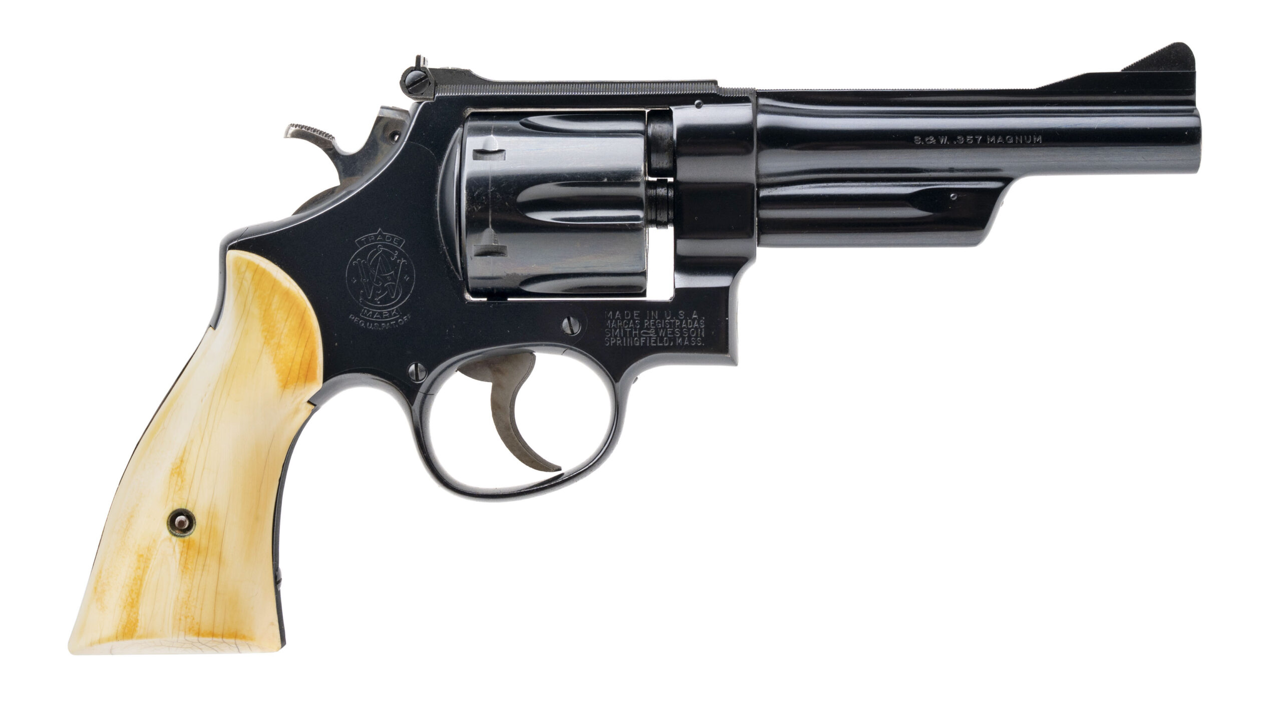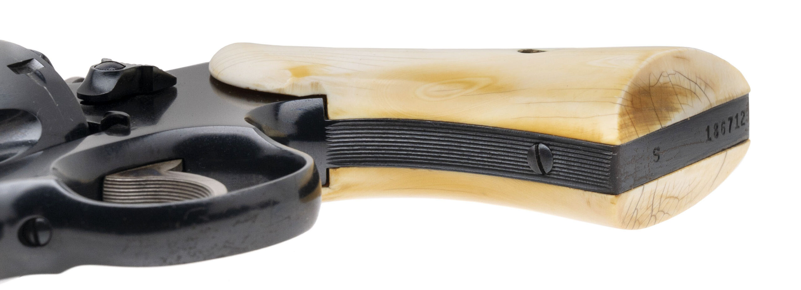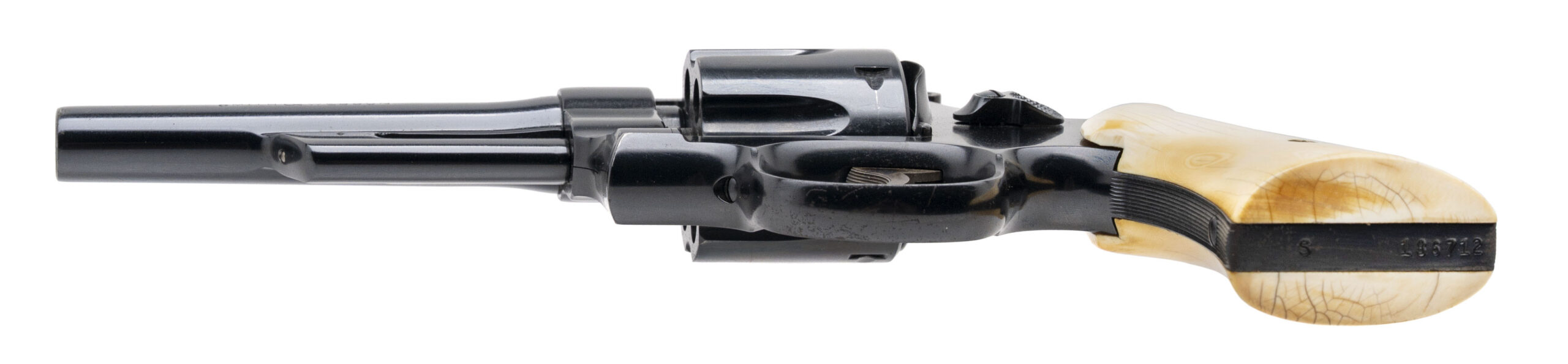 SN: S186712. Made circa late 1950's. .357 magnum with a 5" pinned barrel. Bore is bright with strong rifling. Blued double action no dash S&W revolver with pinned barrel and recessed cylinder. Finish is in very good condition with a light blemish noted on the cylinder and is adorned with beautiful ivory stocks. Ivory grips are in excellent condition with a yellow patina. Overall very good condition.