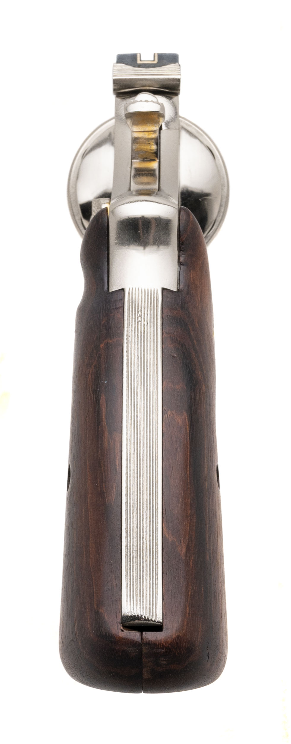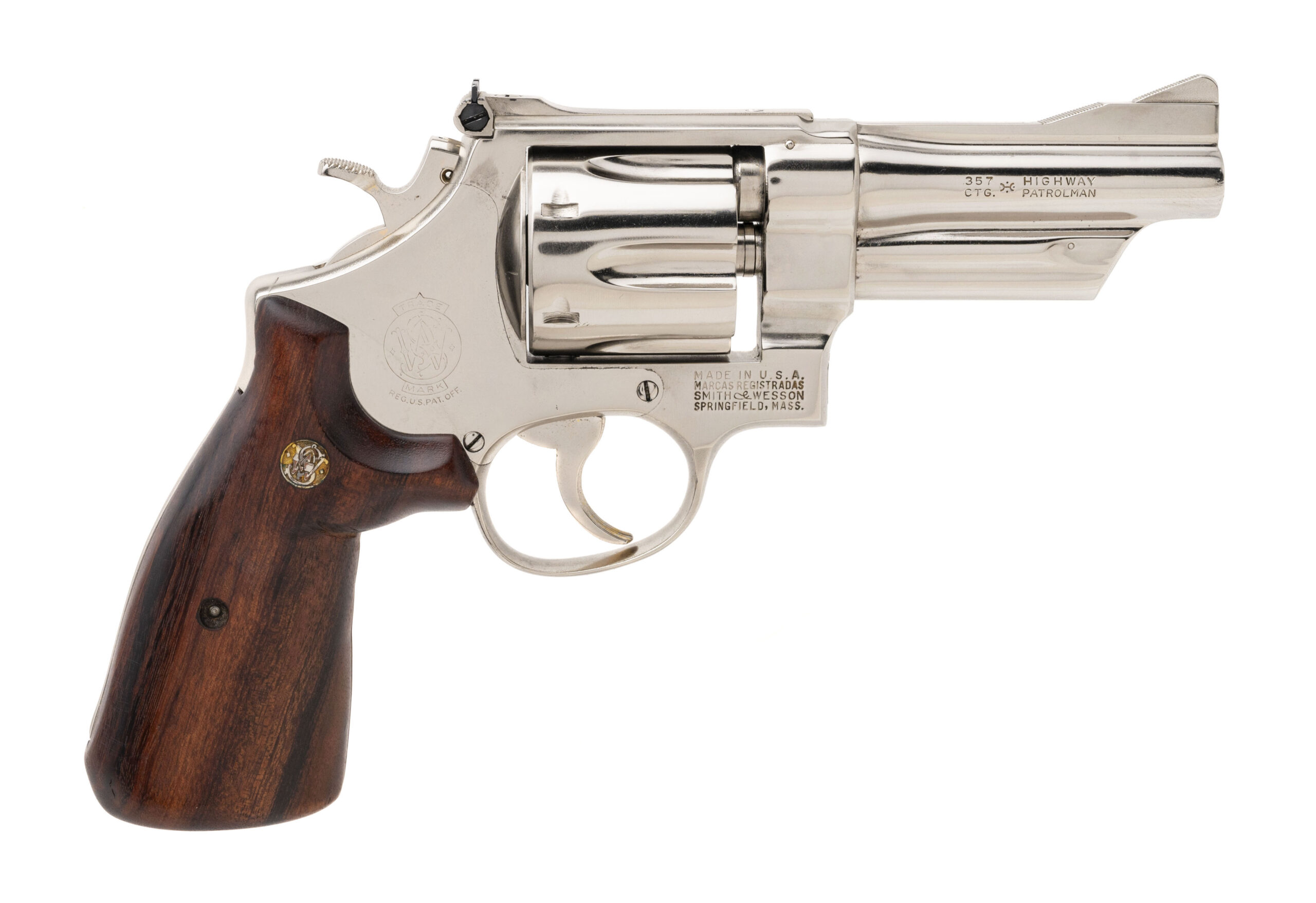 SN: S302398. 1960’s vintage .357 Mag with a 4” barrel. N-frame revolver with pinned barrel and recessed cylinder. Has been custom nickel plated and has custom wood grips. Excellent condition.
