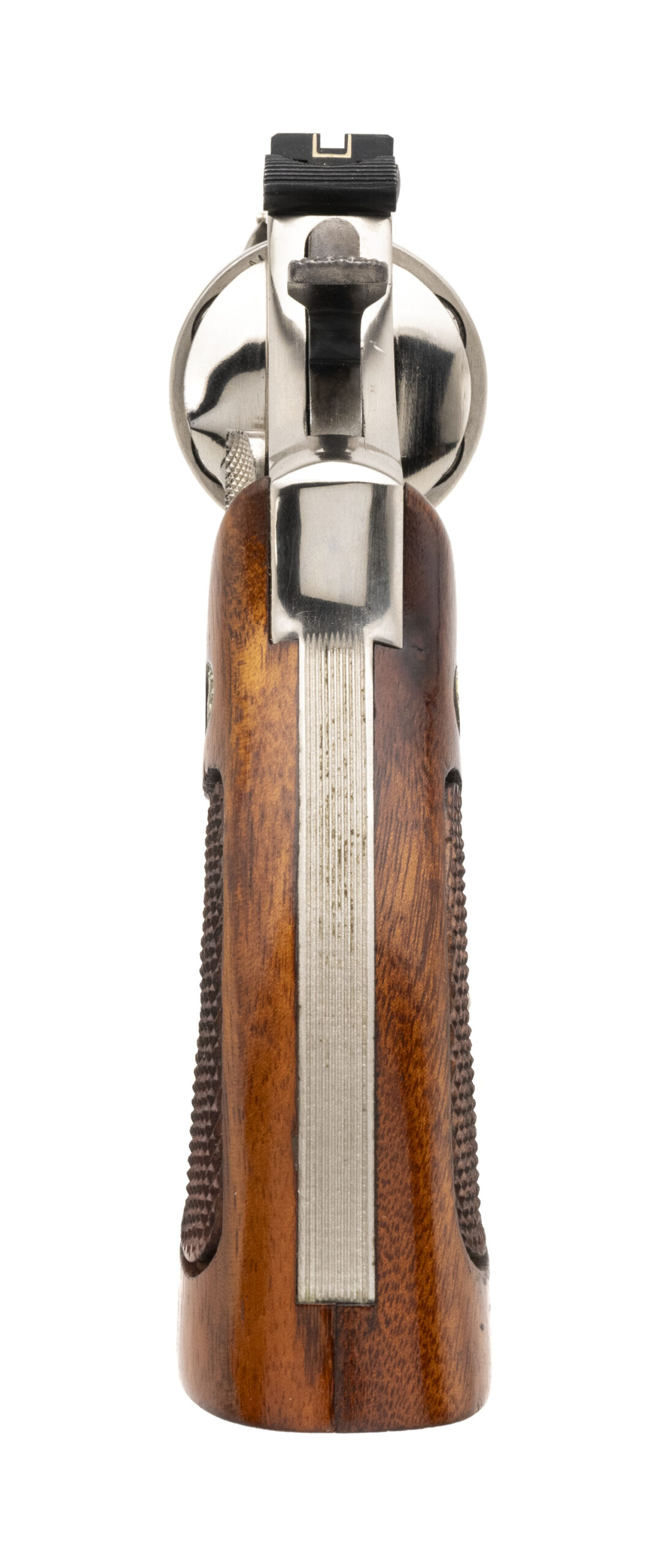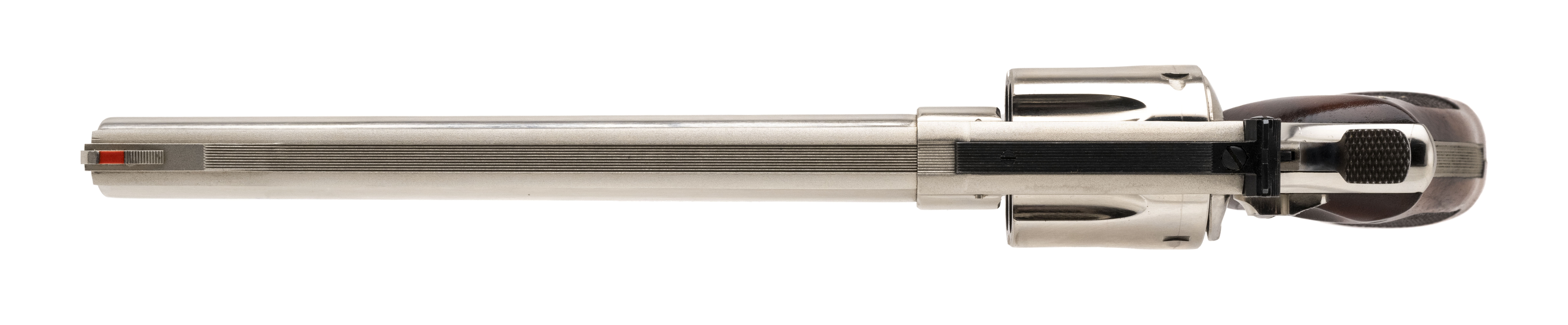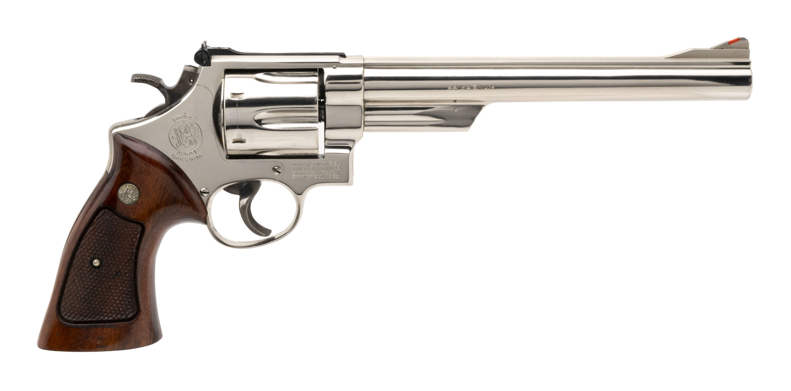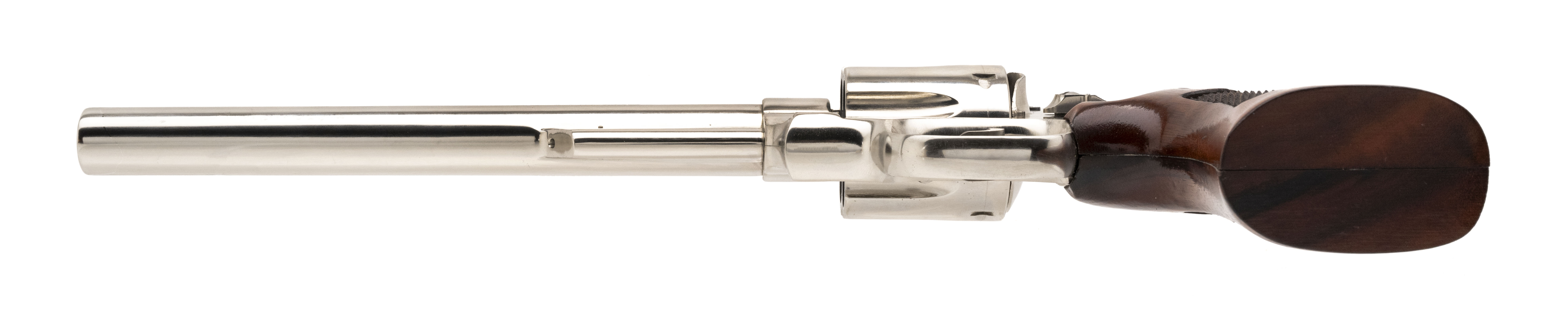 SN: N127203. Made circa early 1970's, .44 Magnum with a 8.37" barrel. Vintage N-frame revolver with pinned barrel & recessed cylinder. Nickel finish shows light marks underneath the barrel but is in very good condition. Checkered wood grips are in very good condition.
