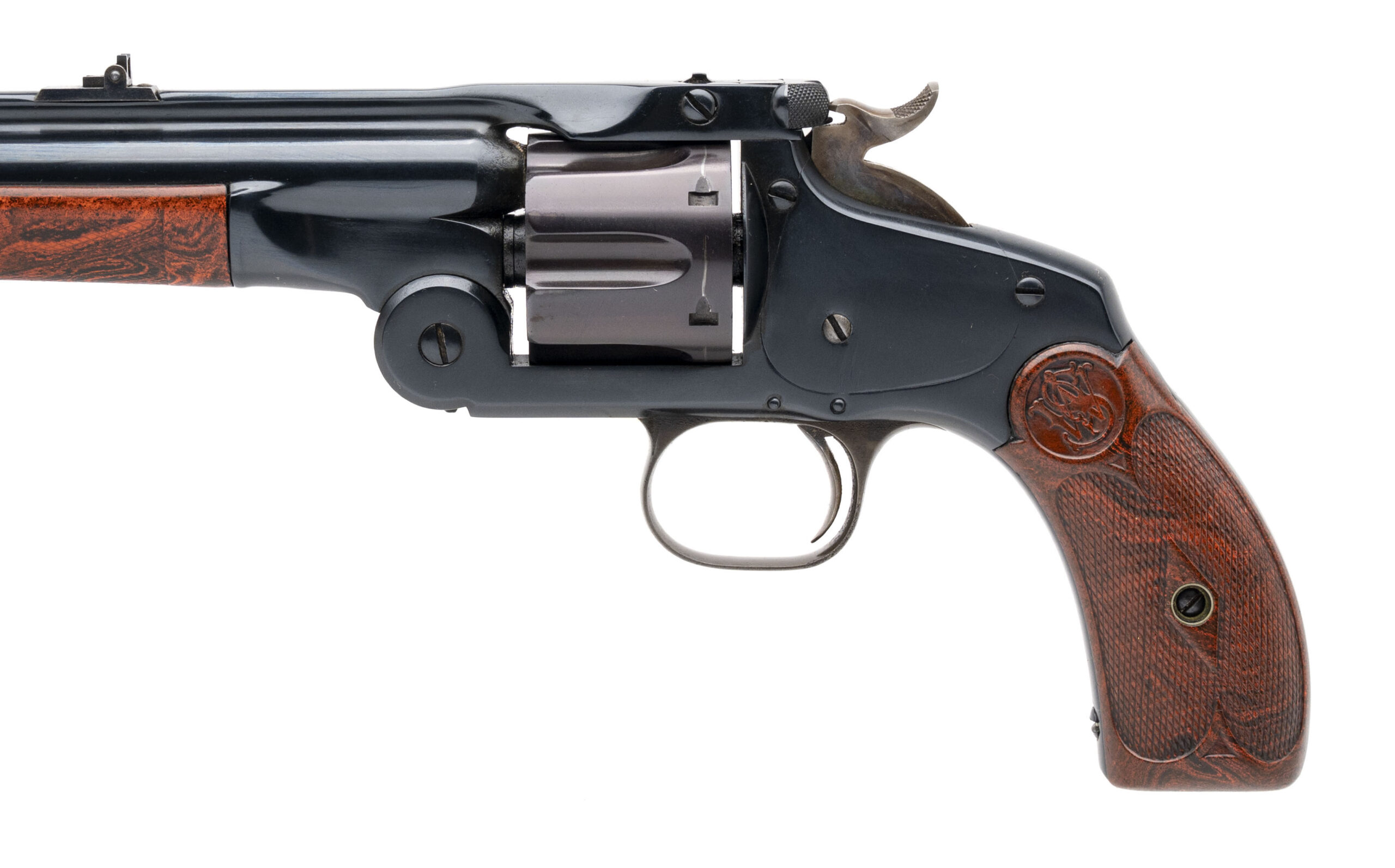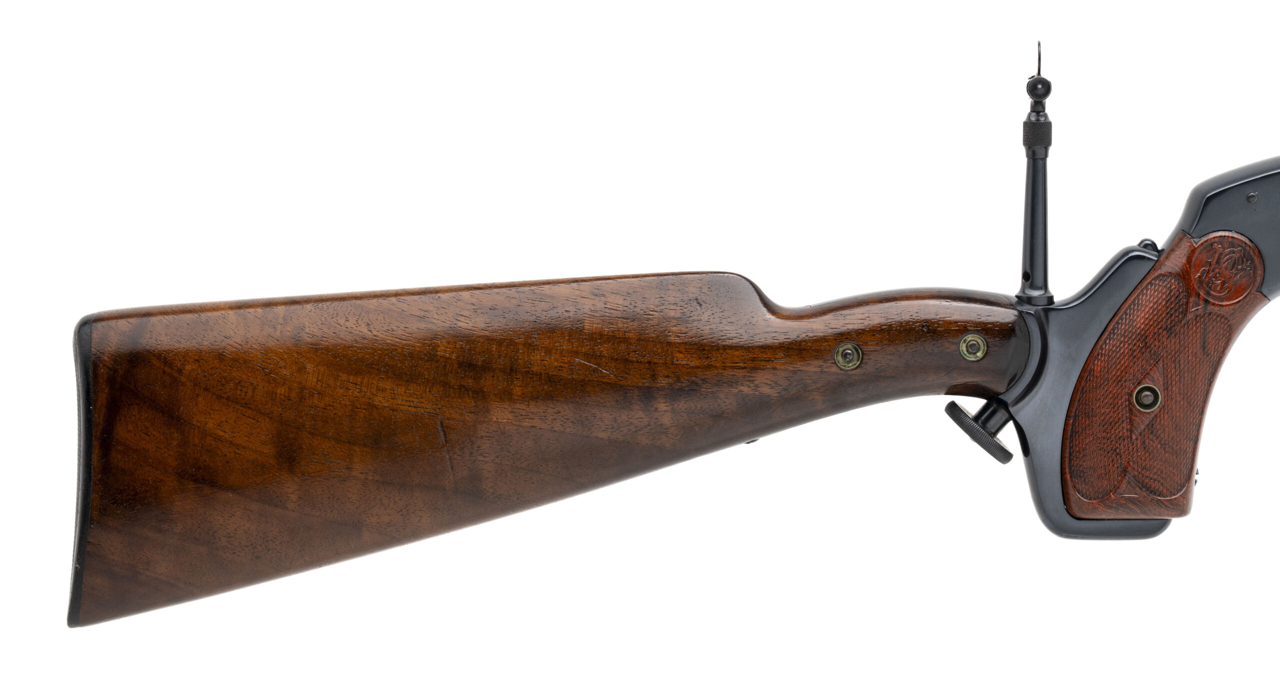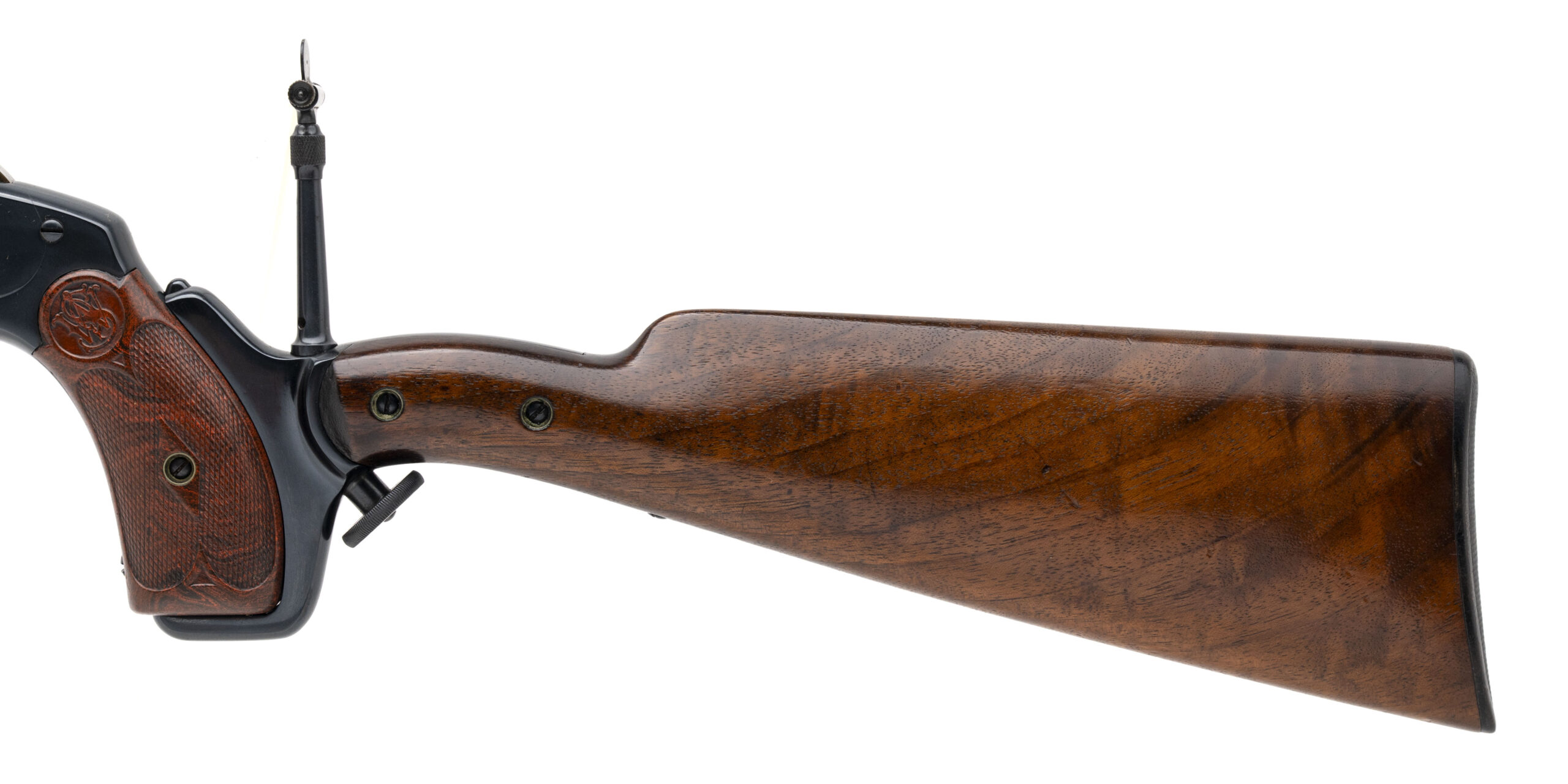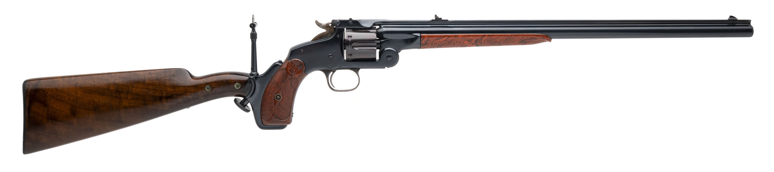 Serial 628. Made circa 1880s. 320 S&W rifle caliber with a 18” barrel. This gun has been refinished. There is a star by the serial number which indicates a factory refinish. This gun comes with the original stock with the original sight. The grips and forearm are excellent.