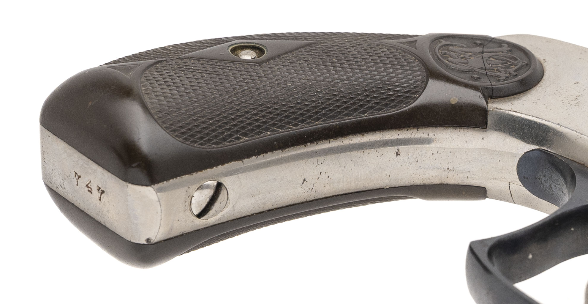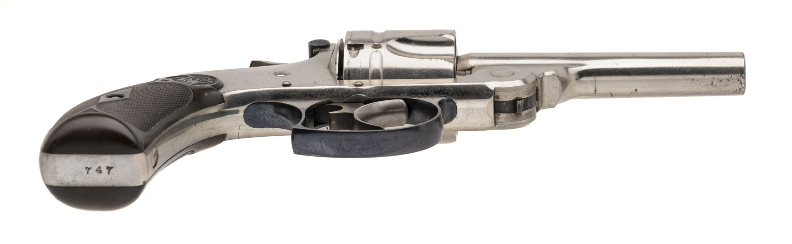 Serial number 747. Made in 1880. 38 S&W caliber with a 3.25” barrel. This gun is in excellent condition with 95% of the original nickel finish. The grips are excellent as well. Case colors still remain on the hammer and trigger and the trigger guard retains most off the original blue.