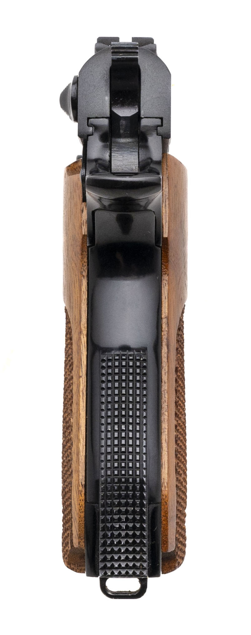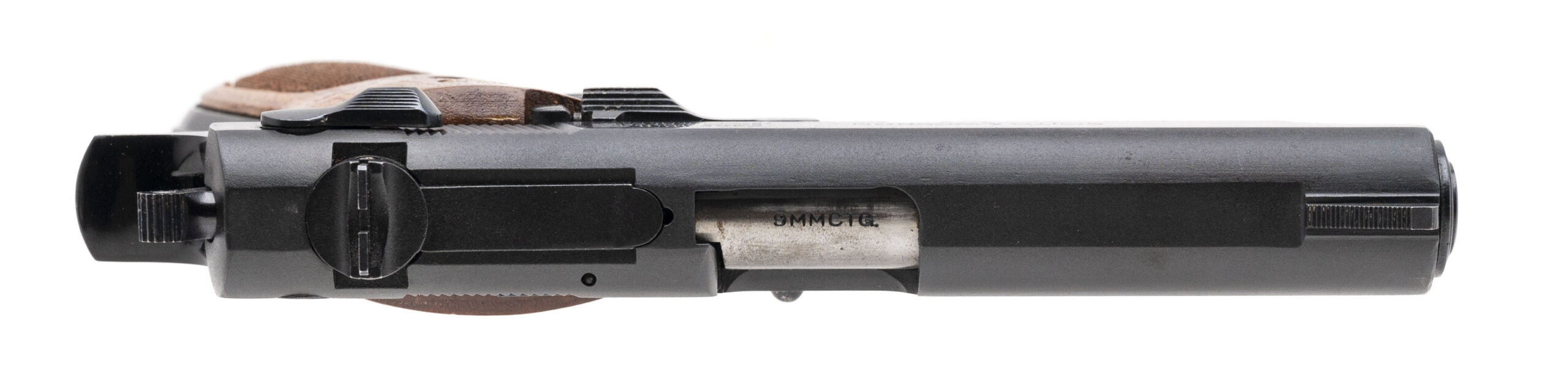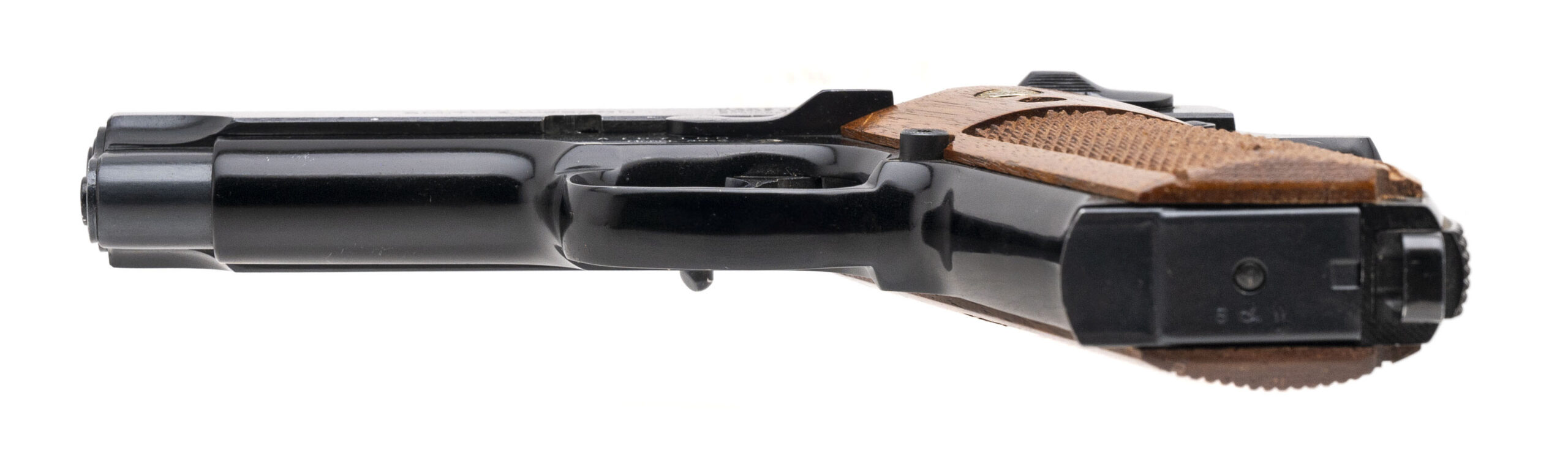 SN: A187180. 1970's vintage, 9mm with a 4" barrel. 1st Gen single stack pistol with alloy frame, blue finish, and wooden grips. Very good overall condition.