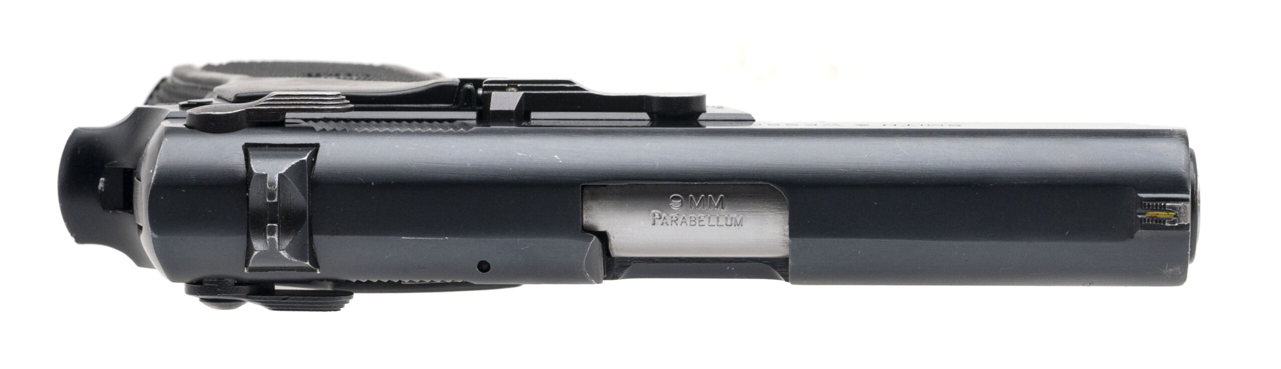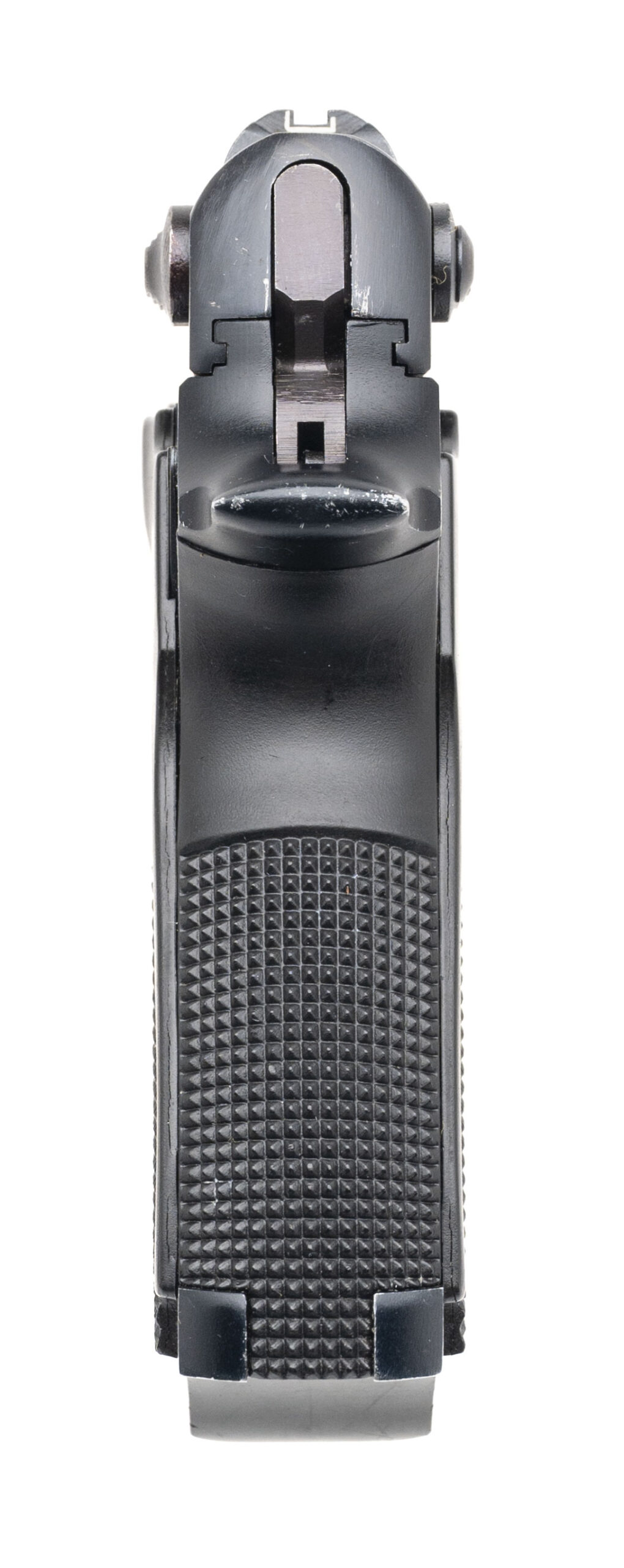 SN: TAY2453. 1980s vintage, 9mm with a 3.5" barrel. Bore is very good. Scarce compact hammerless pistol with a manual thumb-safety/decocker, blued finish, and checkered polymer grips. Finish shows minor marks and holster wear throughout. Overall condition is very good.