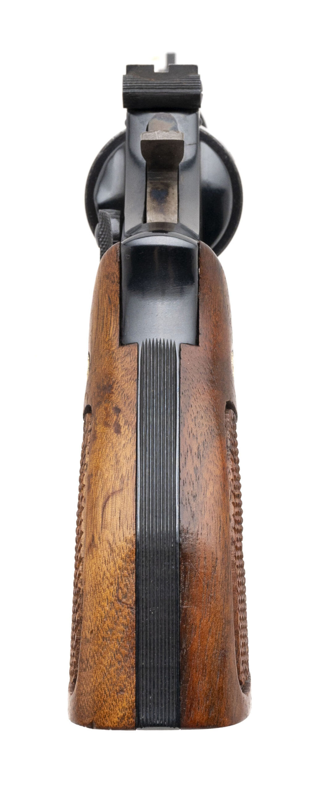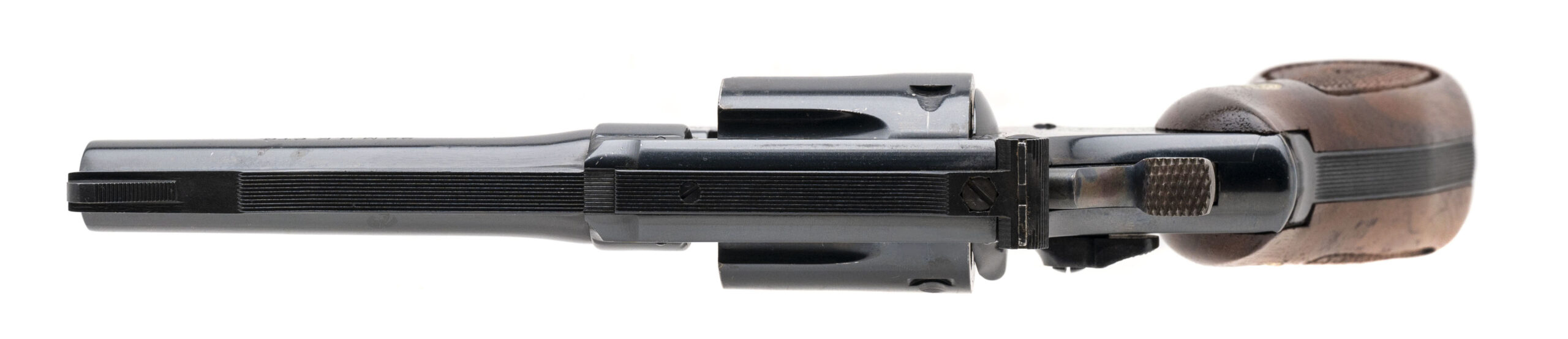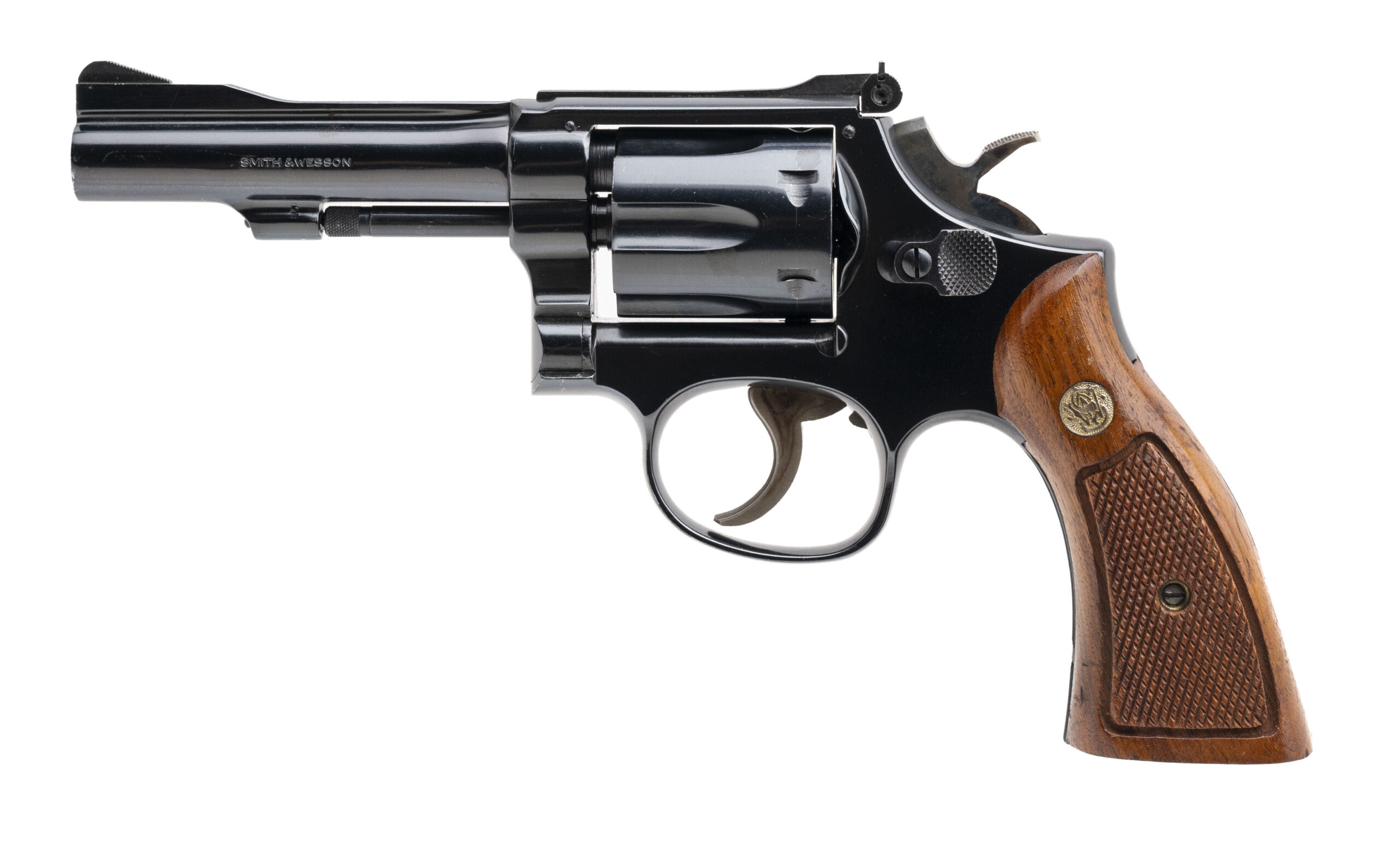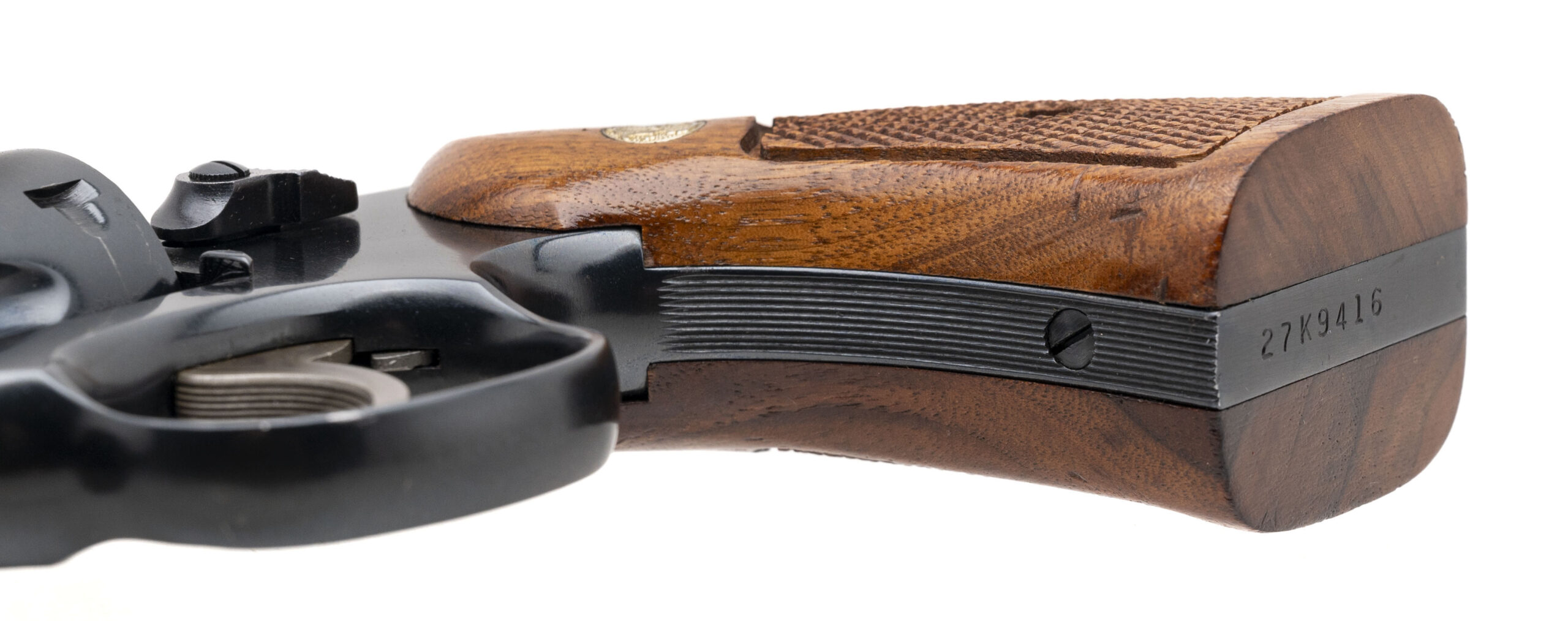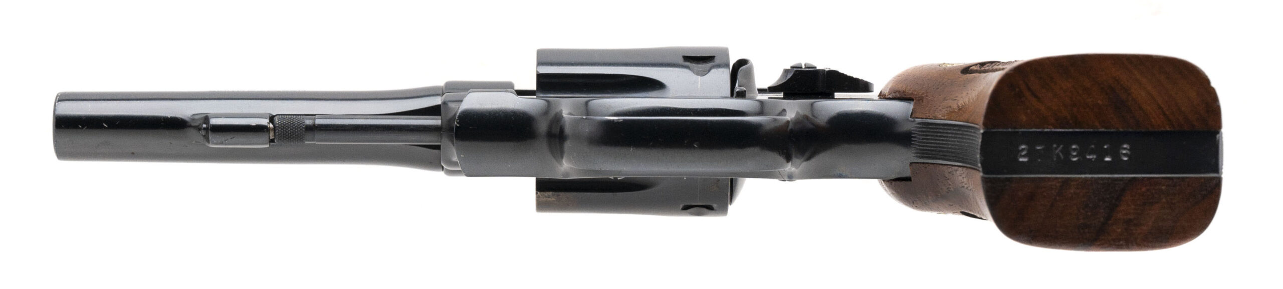 SN: 27K9416. Made circa 1970s, .22 Magnum, with a 4" pinned barrel. Bore is bright with strong rifling. Scarce K-frame revolver with pinned barrel and recessed cylinder. Cylinder shows wear but blued finish is in good condition. Checkered wood grips are in very good condition. Overall condition is good.