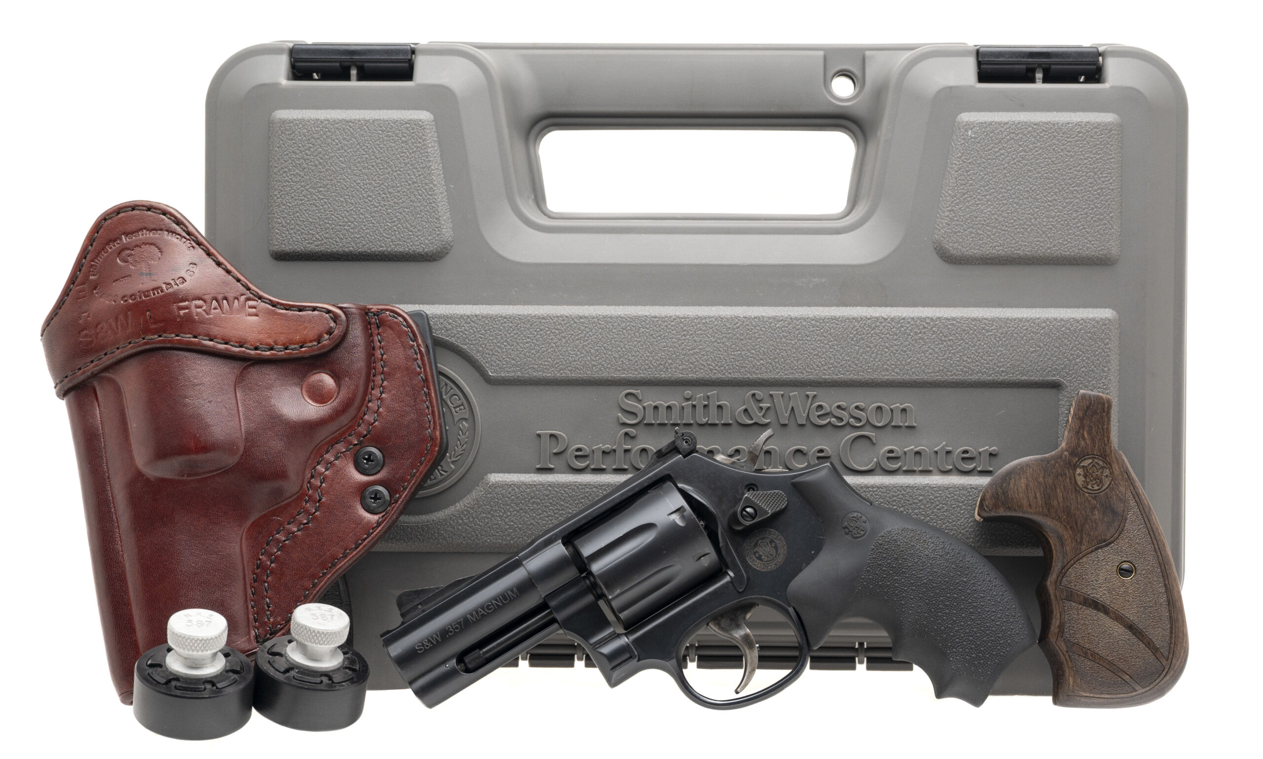 SN: EEF8436. Modern production, .357 MAG. with a 3" ported PowerPort barrel. Bore is excellent. Performance center tuned double-action steel L-frame revolver with an adjustable rear sight, 7rd cylinder, matte black finish, and textured rubber grip module. Finish shows light marks throughout. Overall condition is very good. Includes left handed OWB Palmetto Leather Works holster, original grips, and original case.