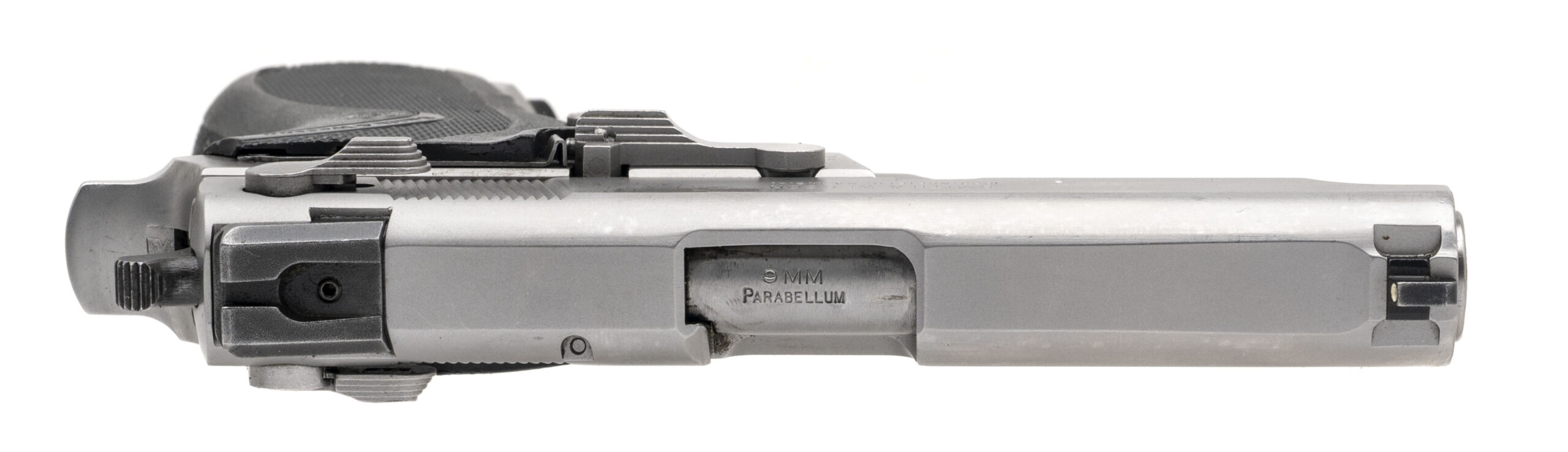SN: VCS6425. 1990s vintage. 9mm with an 4" barrel. Bore is bright with strong rifling. Stainless steel double action pistol with ambidextrous safety/decocker controls and plastic checkered grips. Metal shows wear but the overall condition is very good. Comes with case and extra magazine.