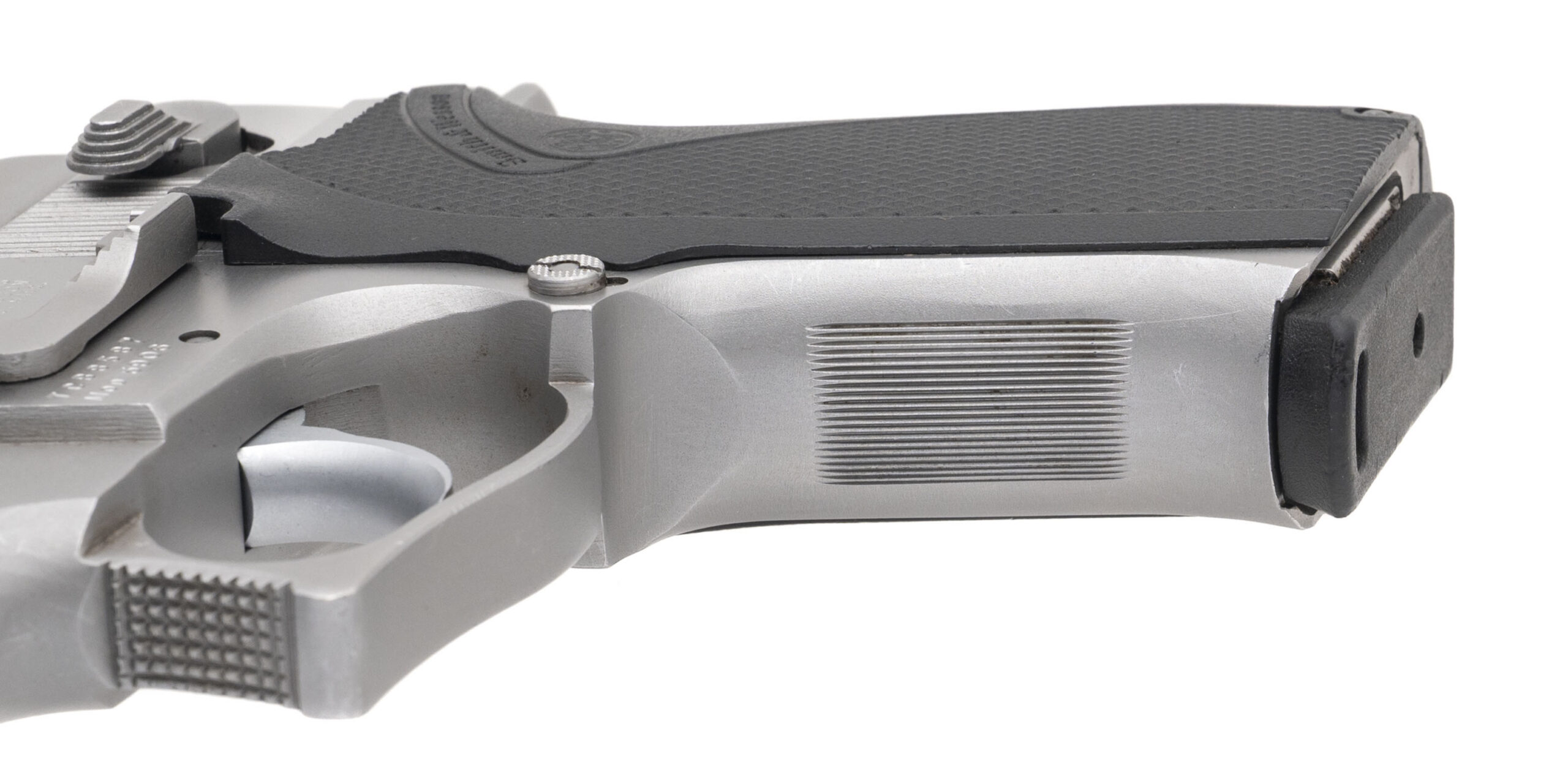 SN: TCB8587. Late 80s vintage, 9mm with a 4" barrel. Bore is very good. Stainless steel double-action pistol with 3 dot adjustable sights, ambidextrous manual thumb-safety, and checkered plastic grips. Metal shows moderate handling marks throughout. Overall condition is very good.