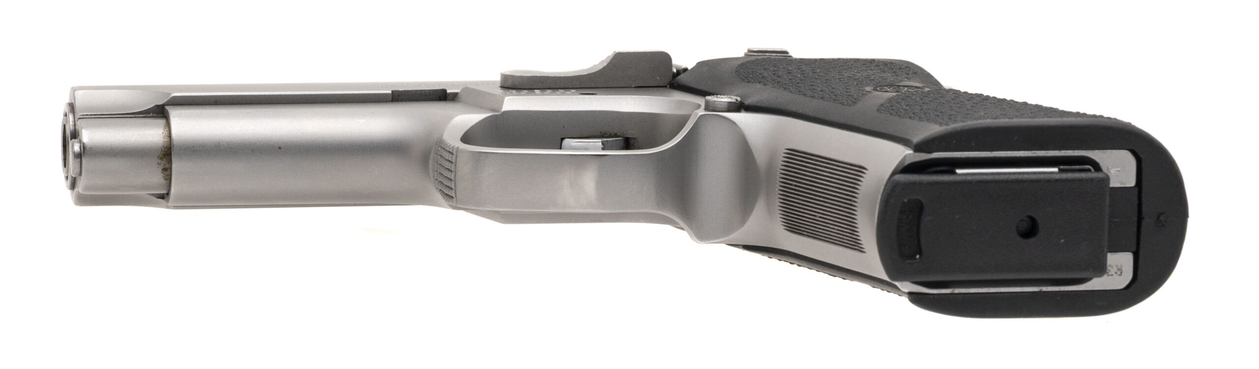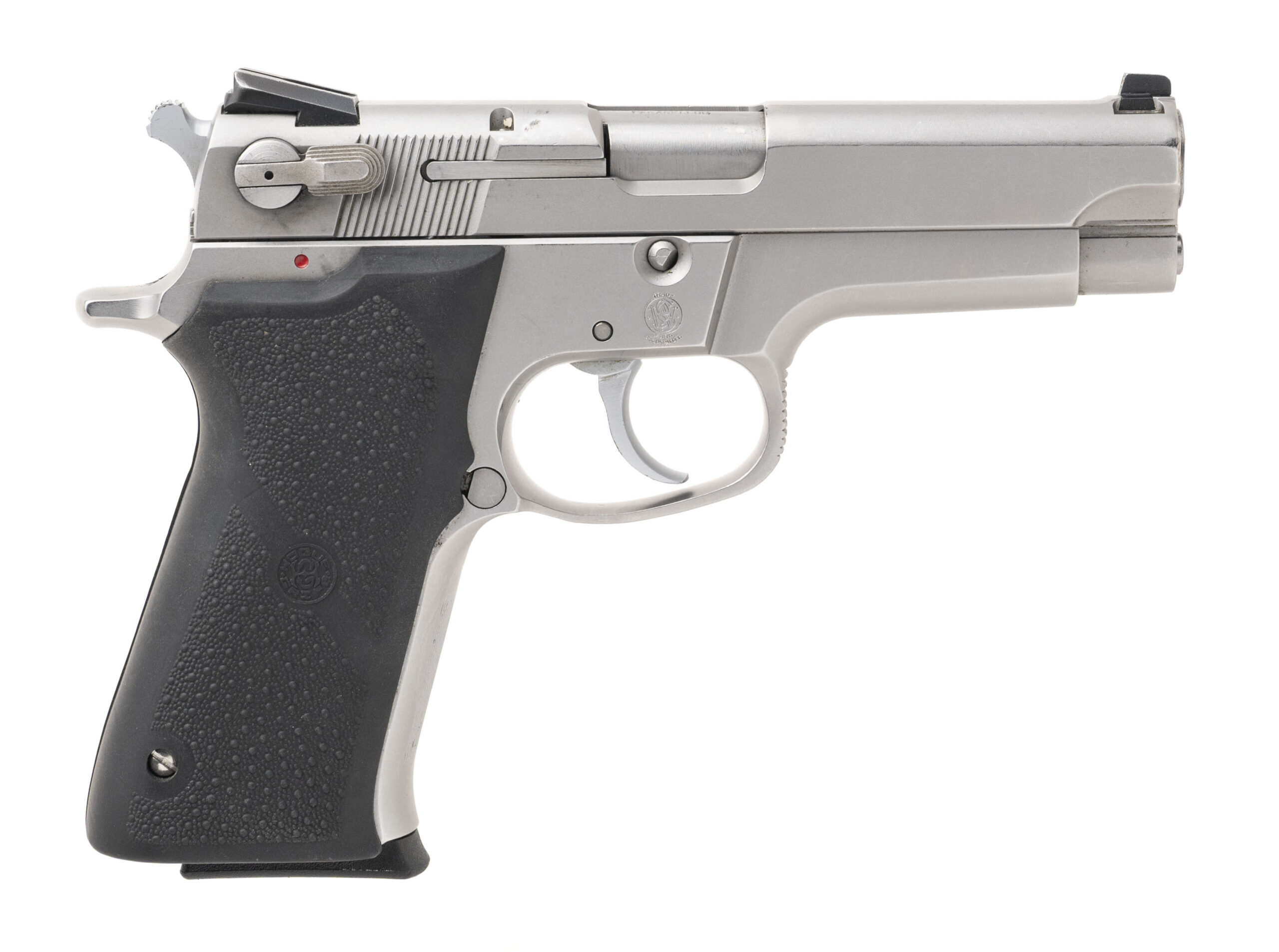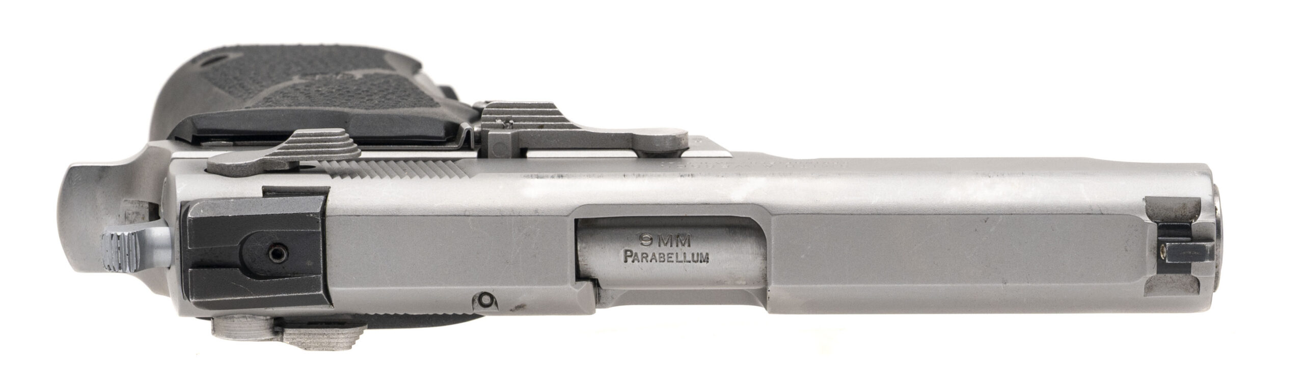 SN: TZ5659S. Early 1990s vintage, 9mm with a 4" barrel. Bore is very good. Scarce third gen stainless steel double action pistol with Hogue grips and ambidextrous safety/decocker. Metal shows light marks but the overall condition is very good.