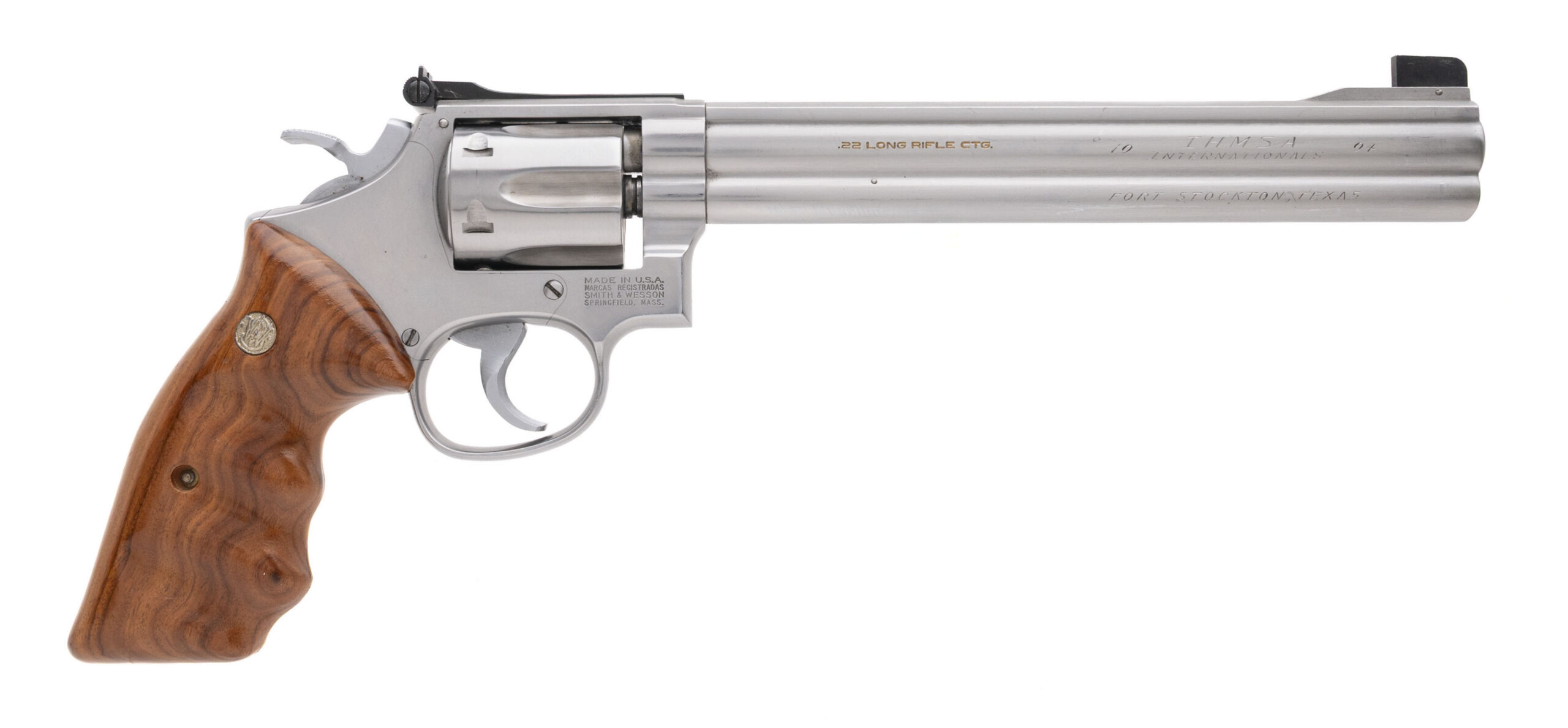 SN: BPK8358. Early 1990s production, .22LR with a 8.375" barrel. Bore is very good. Rare 6-shot K22 target revolver with combat grips. This revolver was a Trophy gun of the International Handgun Metallic Silhouette Association (IHMSA) Internationals of 1994. The metal shows handling marks but the overall condition is very good.