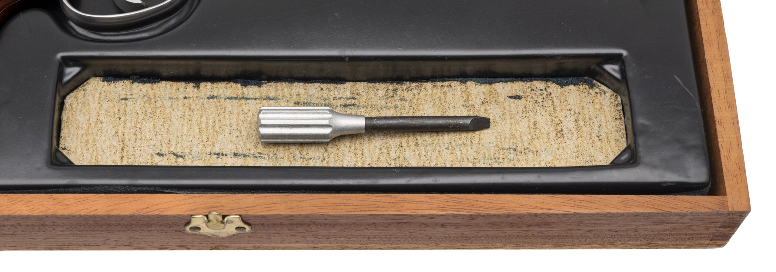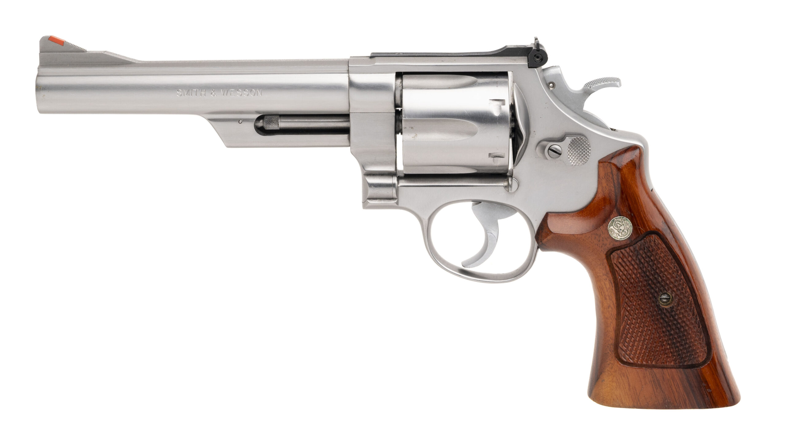 SN: AEA2420. Made circa 1980’s. S&W 44 magnum stainless steel double action N frame revolver with a 6” barrel and original checkered walnut target grips in very good overall condition. Comes with S&W wood box with fitted plastic insert.