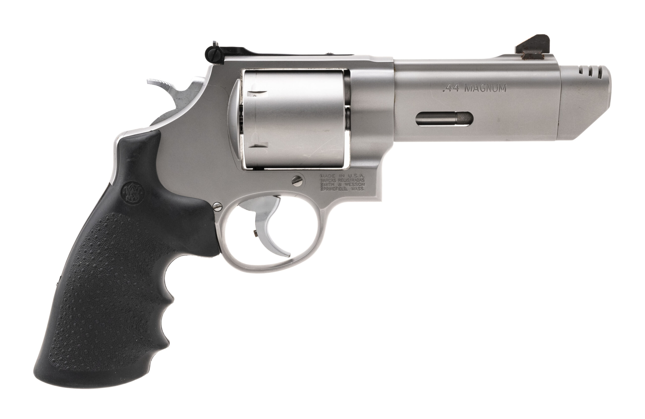 SN: DDA7964. Modern production .44 Mag with a 3.75" barrel with compensator. Stainless steel Performance Center revolver. Shows wear and marks, overall condition is very good.