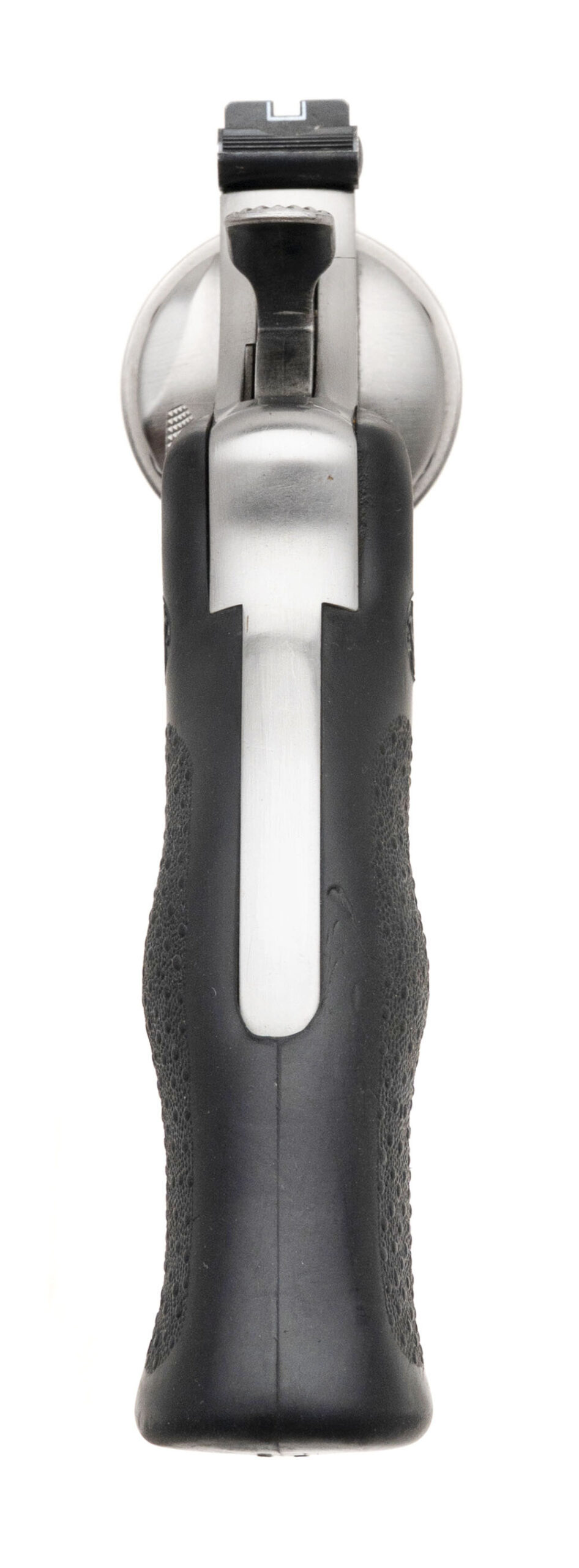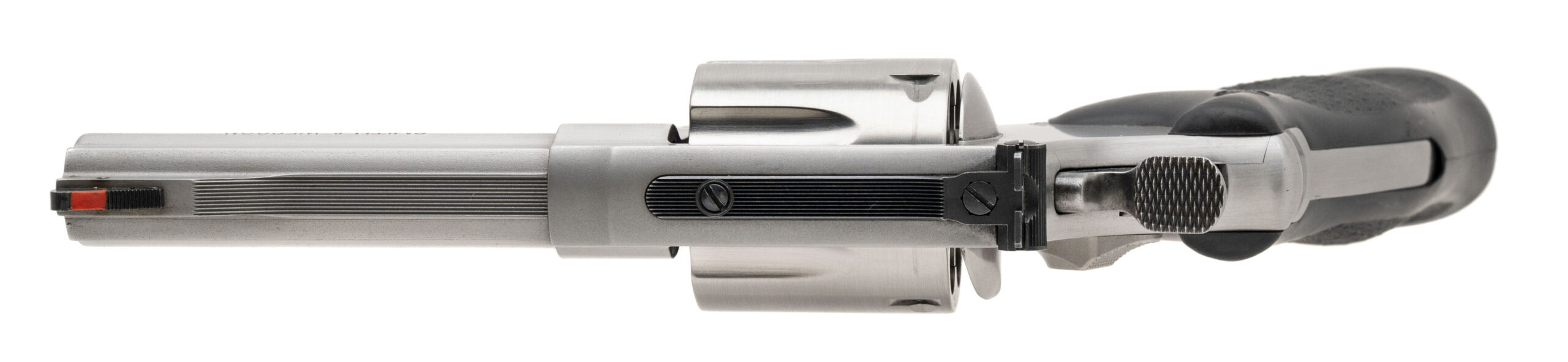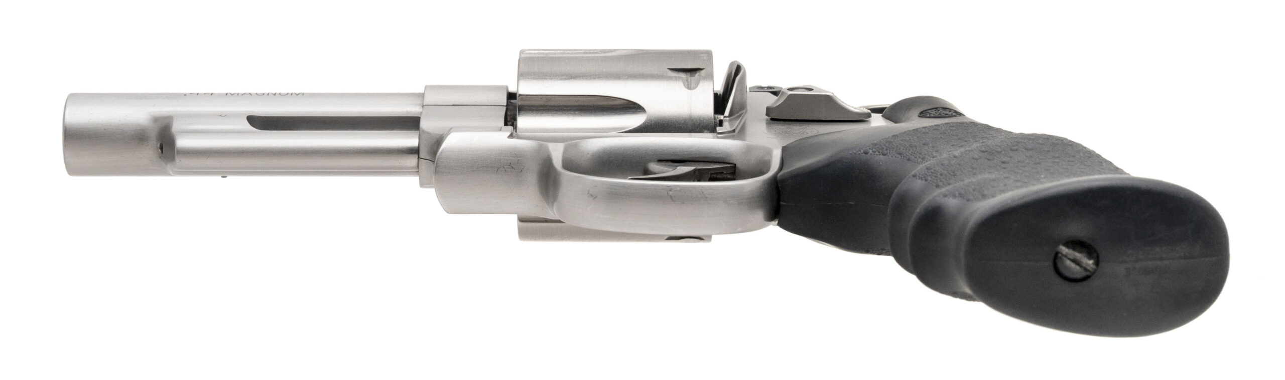 SN: CJX5820. Modern production, .44 Magnum with a 4" barrel. Stainless Steel N-frame revolver with Hogue rubber grips. Metal shows light marks but the overall condition is very good.