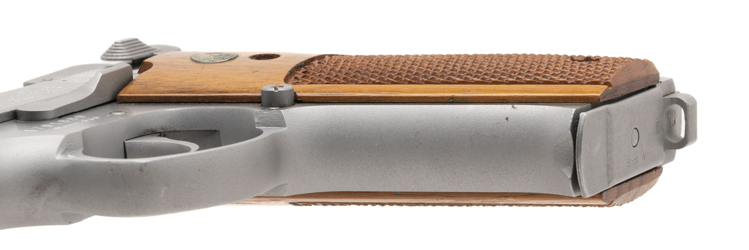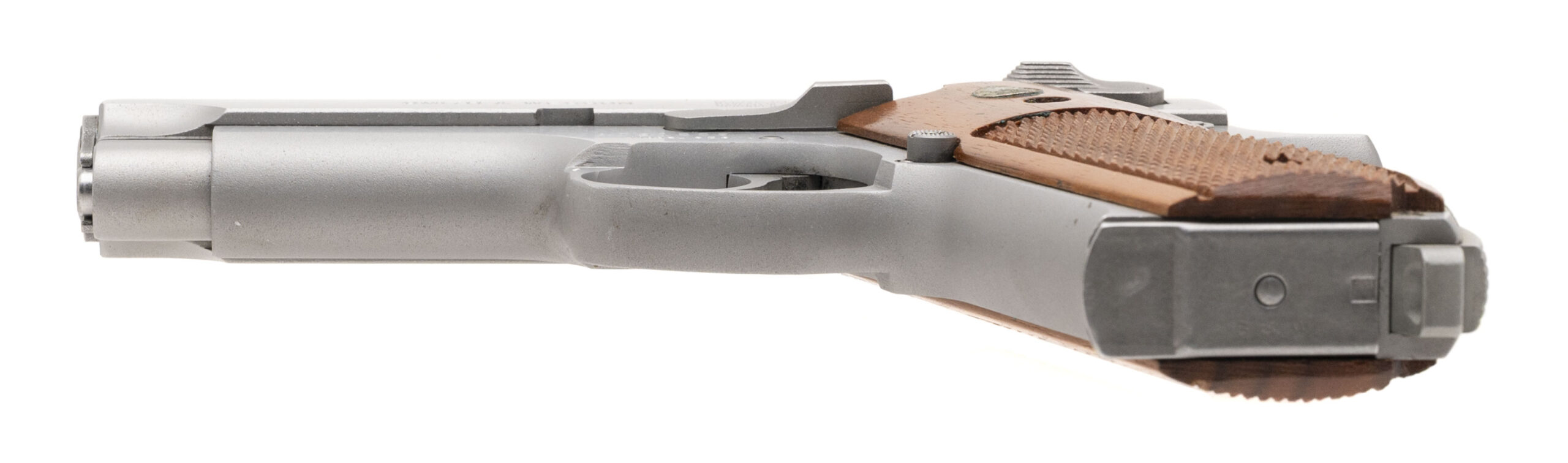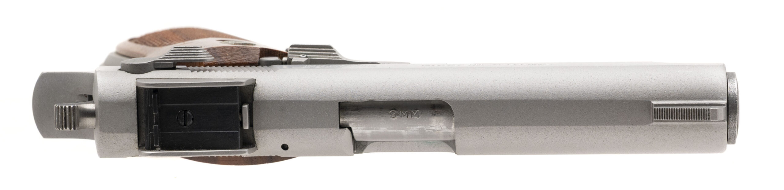 SN: A791889 made circa 1980’s. 9mm stainless steel double action semi-auto pistol with a 4” barrel, adjustable rear sight, decocker and checkered walnut grips in excellent condition for the age. Comes in original box with extra magazine.