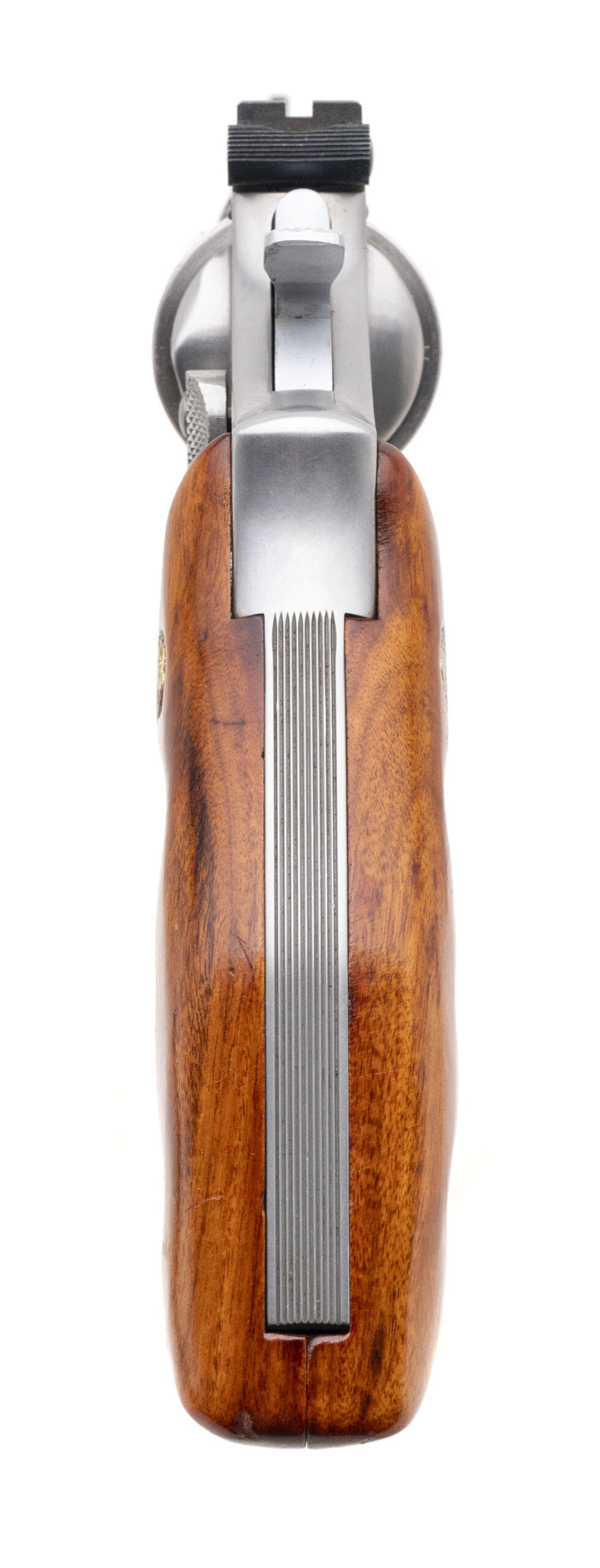 SN: BJH8240. 1990's vintage .22 WMR with a 6" barrel. 6-shot Stainless steel target revolver with wooden combat grips. Very good condition overall.