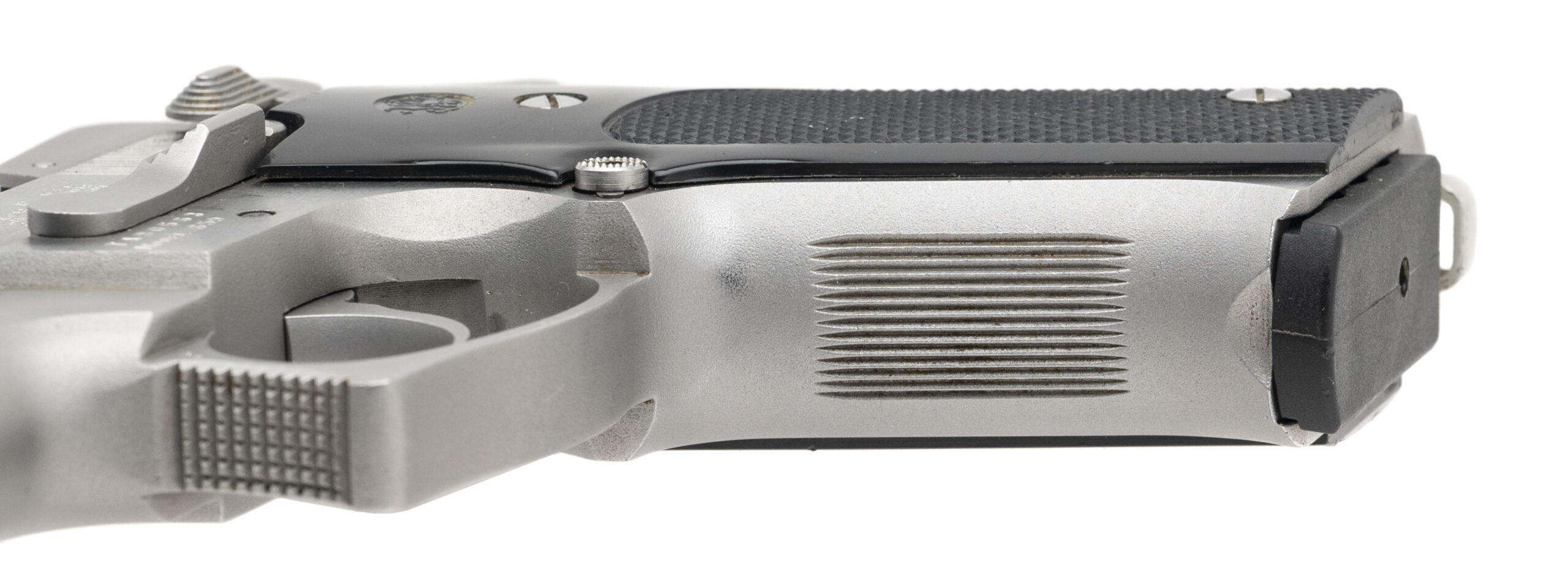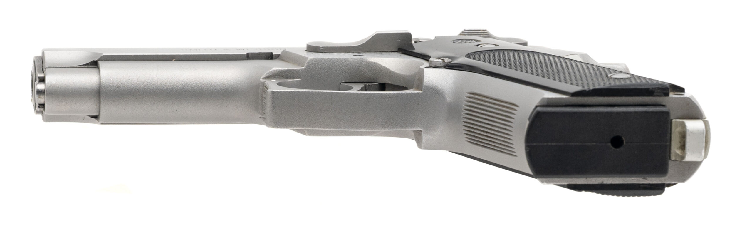 SN: TAB0563. 1980s vintage, 9mm with a 4" barrel. Bore is bright with strong rifling. Scarce gen 2 stainless steel double action pistol with plastic grips. Metal shows light marks but the overall condition is very good. Comes with case.