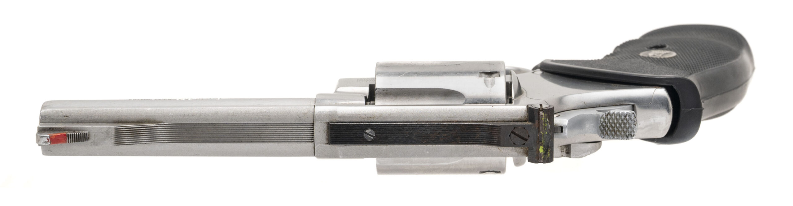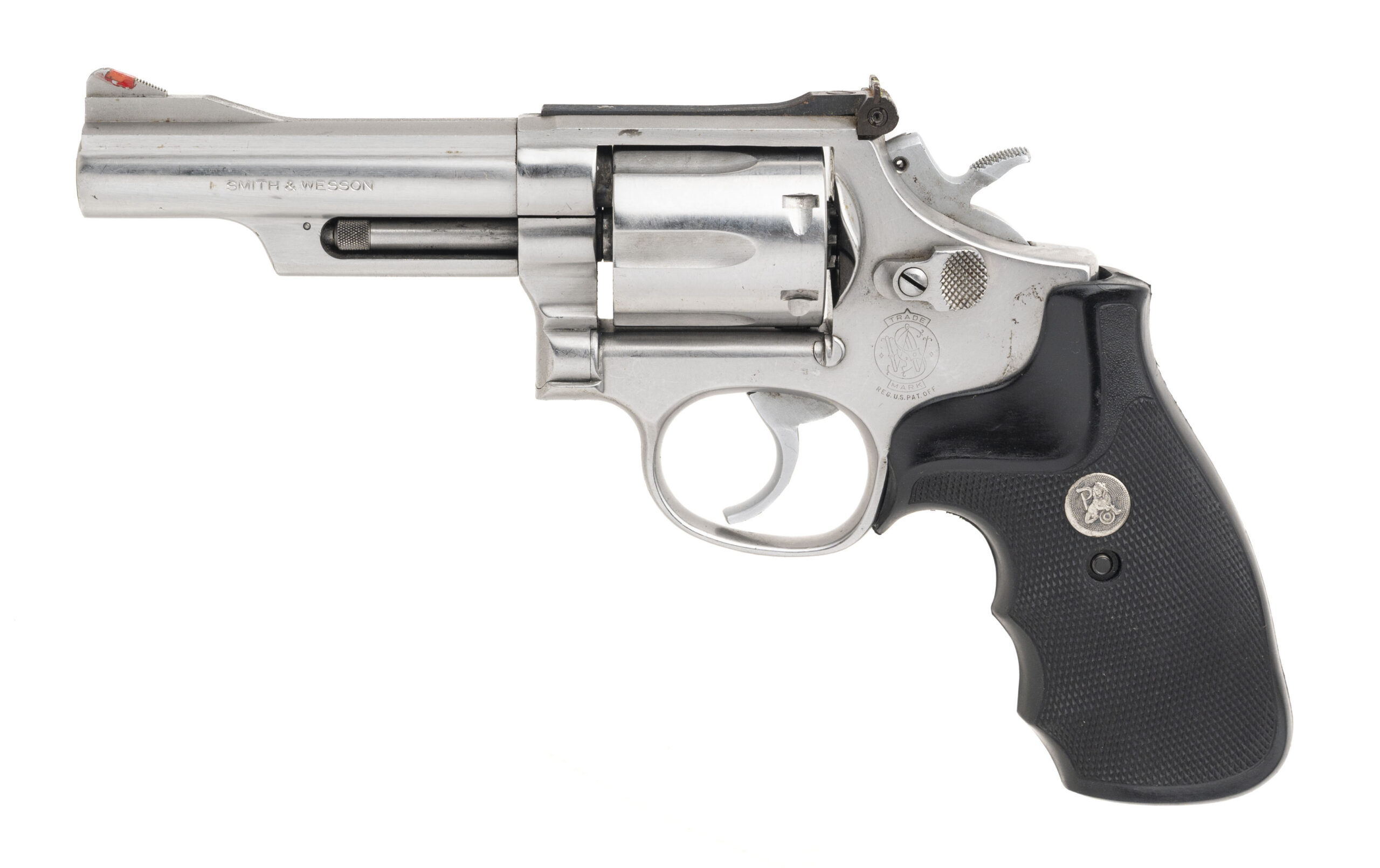 SN: AYC4315. 1980s vintage, .357 Magnum with a 4" barrel. Bore is very good. Stainless steel double action revolver with Pachmayr grips. Metal shows wear but the overall condition is very good.