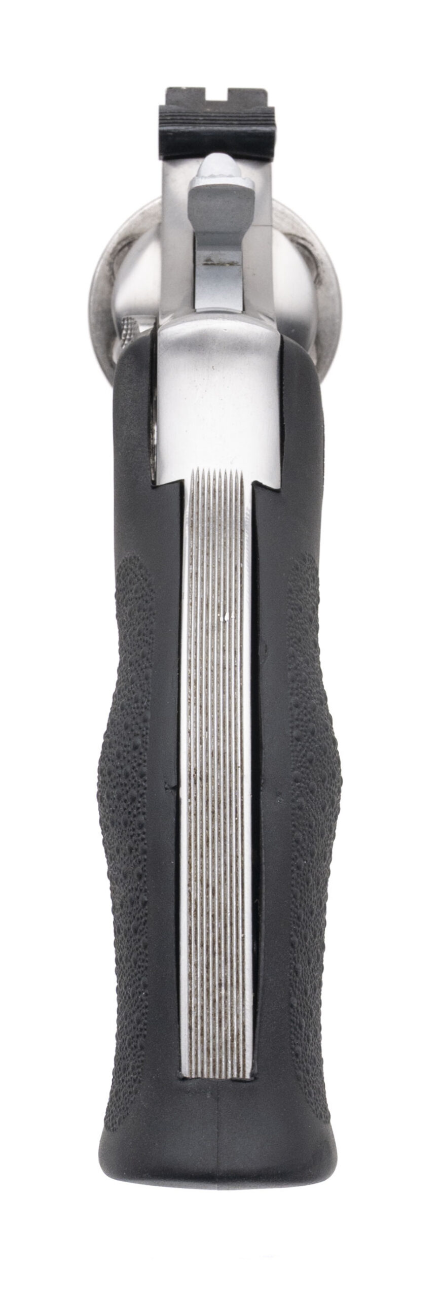 SN: AYD8080 made circa 1980's. Stainless steel 357 magnum double action L-frame revolver with a 6" full lug barrel, adjustable rear sight and fluted 6 shot cylinder with Hogue rubber grips. Some light handling marks overall in very good condition.
