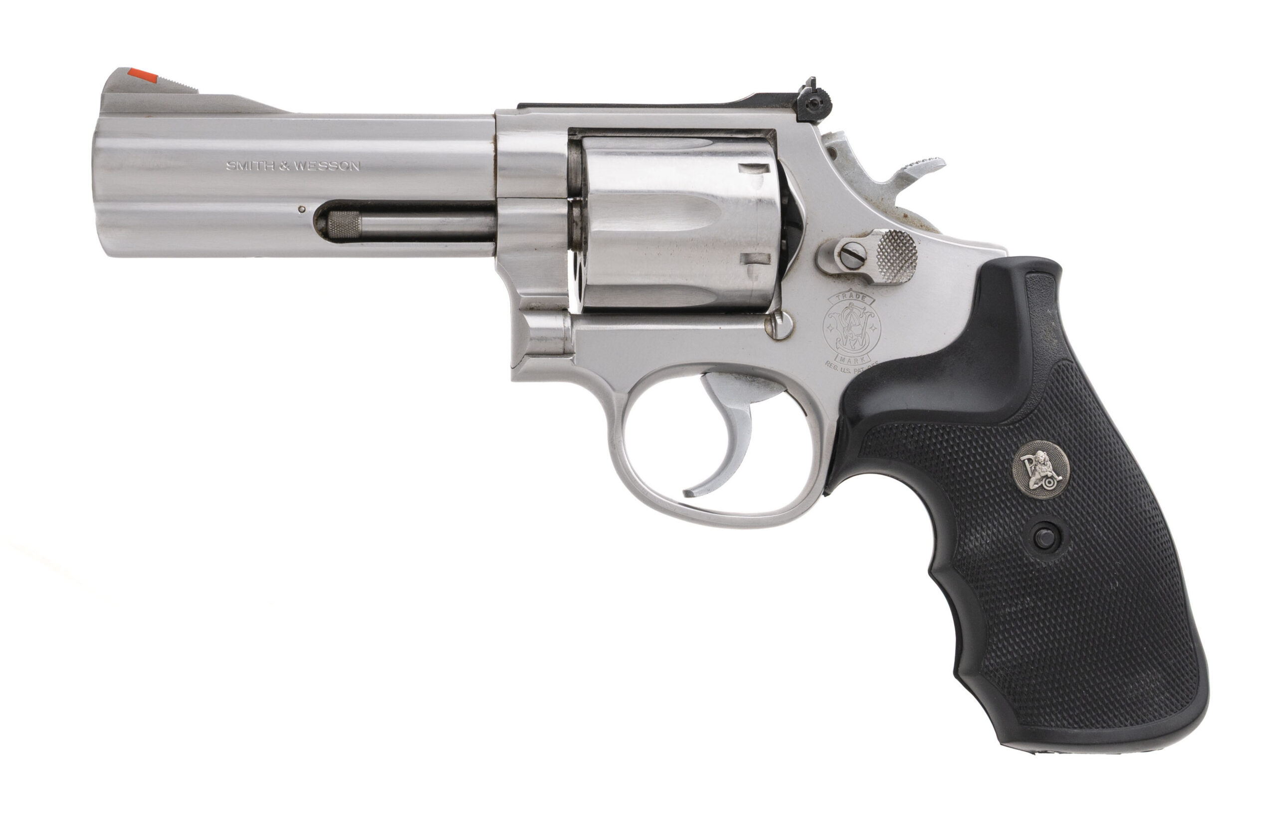 SN: AUS5136. 1980s production, .357 Magnum with a 4" barrel. Bore is very good. Stainless steel double action revolver with Pachmayr grips. Metal show light marks but the overall condition is very good.