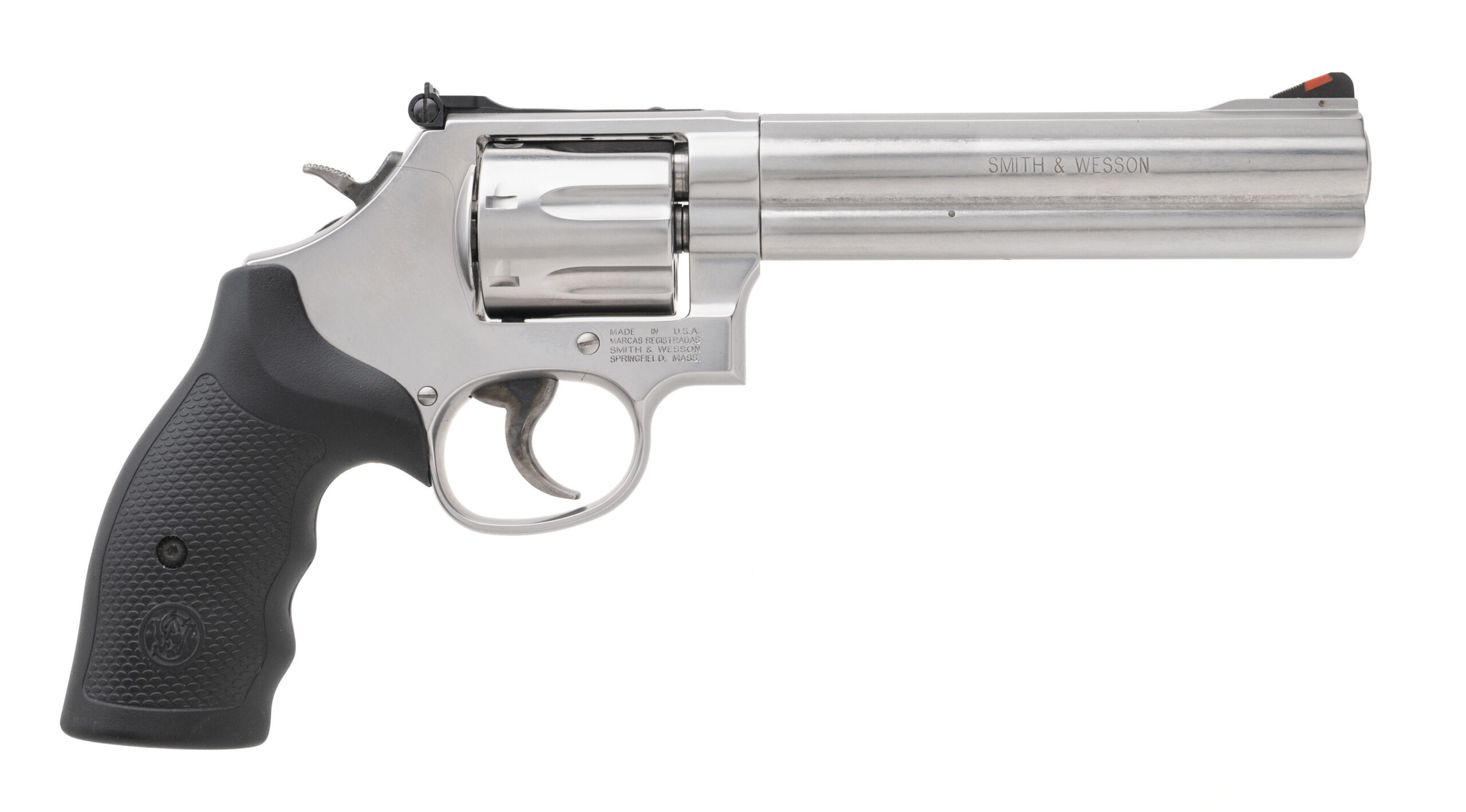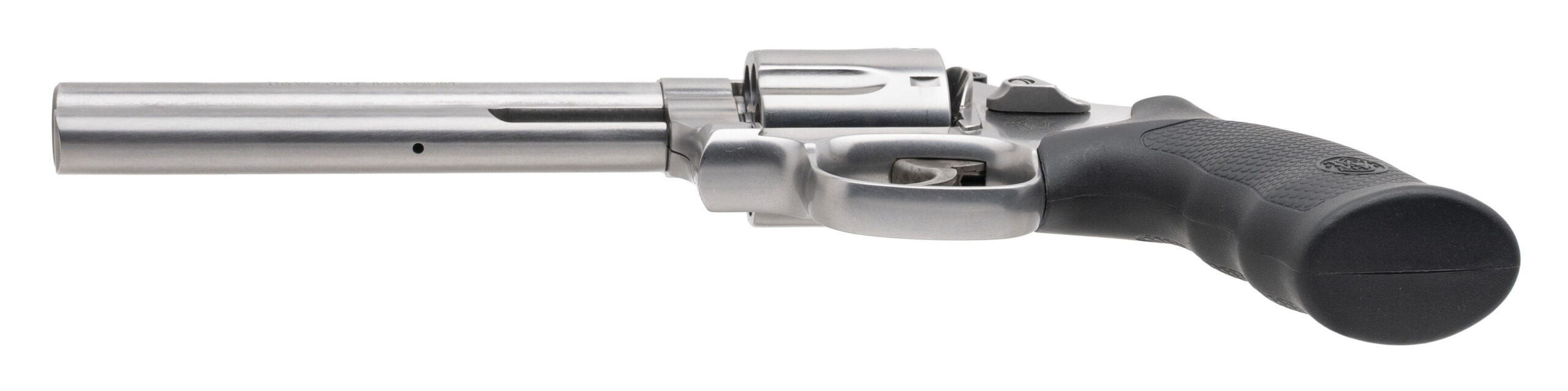 SN: DPY9981. Modern production, .357 Magnum with a 6" barrel. Bore is very good. Stainless steel 7-shot revolver with Hogue grips. Very good condition overall with case.