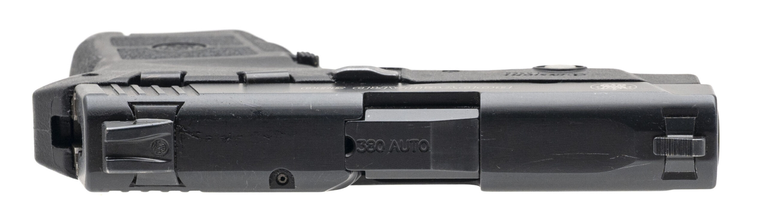 SN: EAJ7208. Modern production. Subcompact internal-hammer-fired pistol made by Smith & Wesson. 2¾" barrel chambered for .380 Auto. Good condition overall with handling marks in the black polymer frame and black slide finish. Double-action only firing mechanism with manual safety. Features integrated red aiming laser.