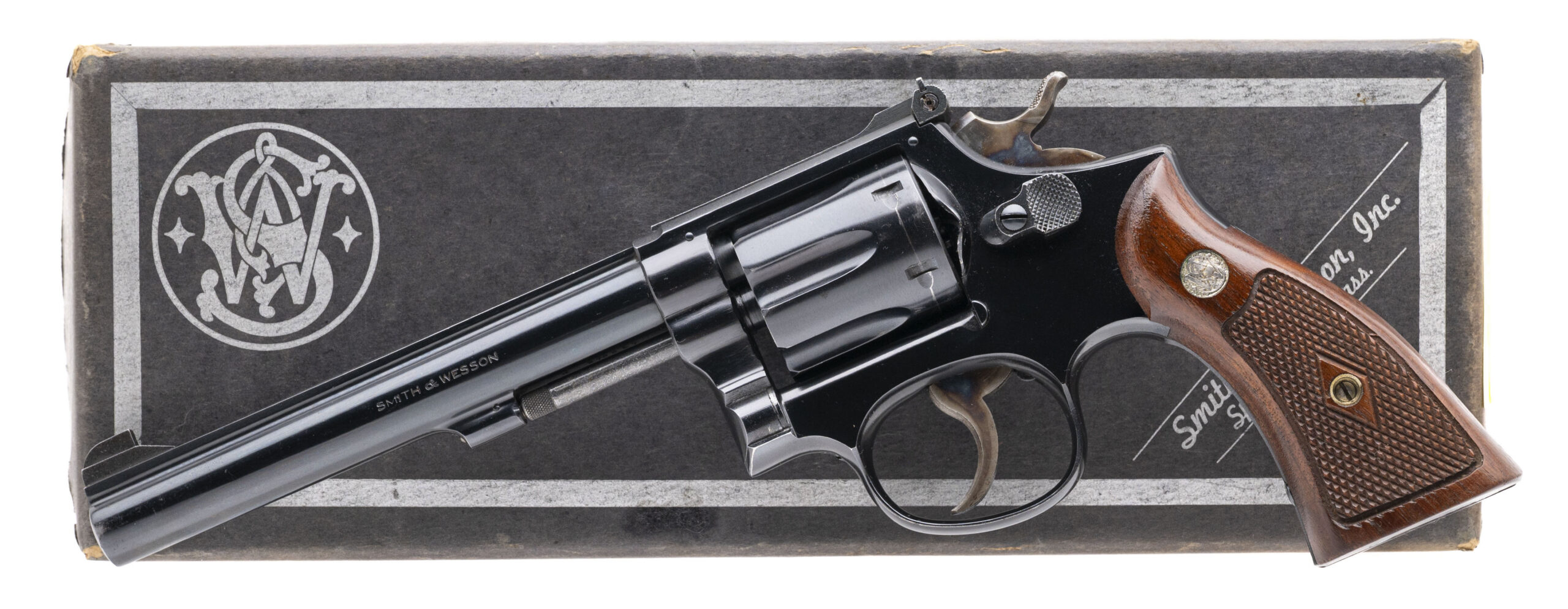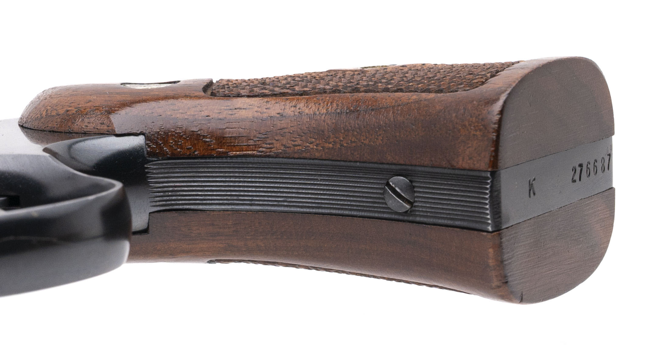 SN: K276687. 1956 production, .22lr with a 6" pinned barrel. Bore is excellent. Beautiful pre model 17 4-screw K22 Masterpiece revolver with blue finish and correct diamond checkered wood grips. Finish shows wear with most of the bluing present. Very good condition overall. Comes with factory box.