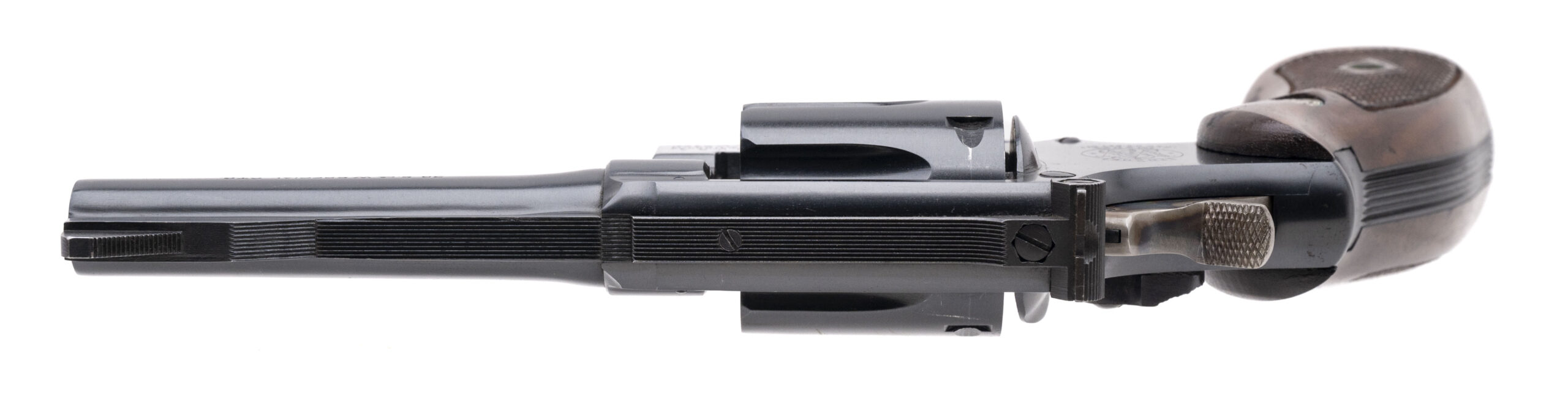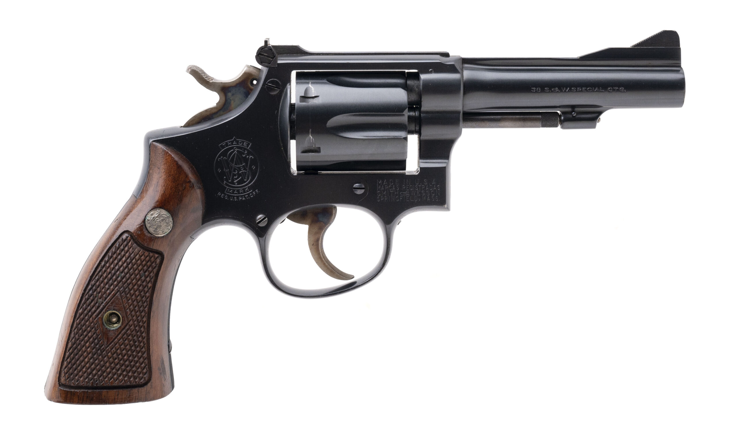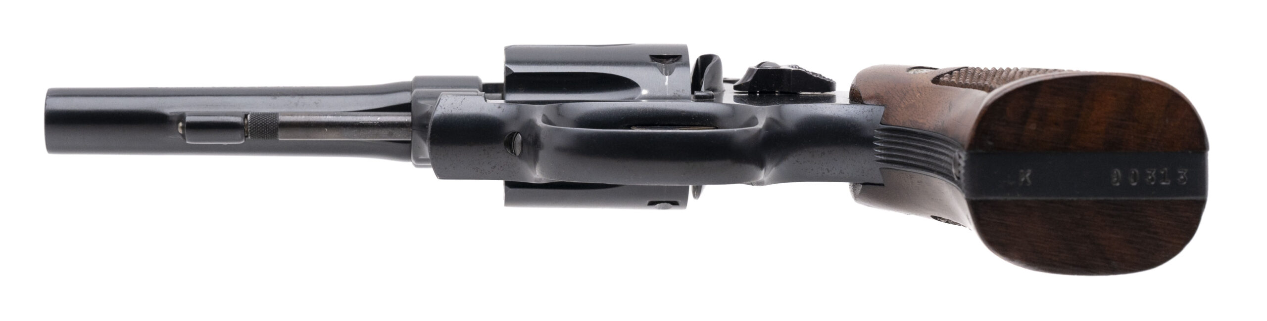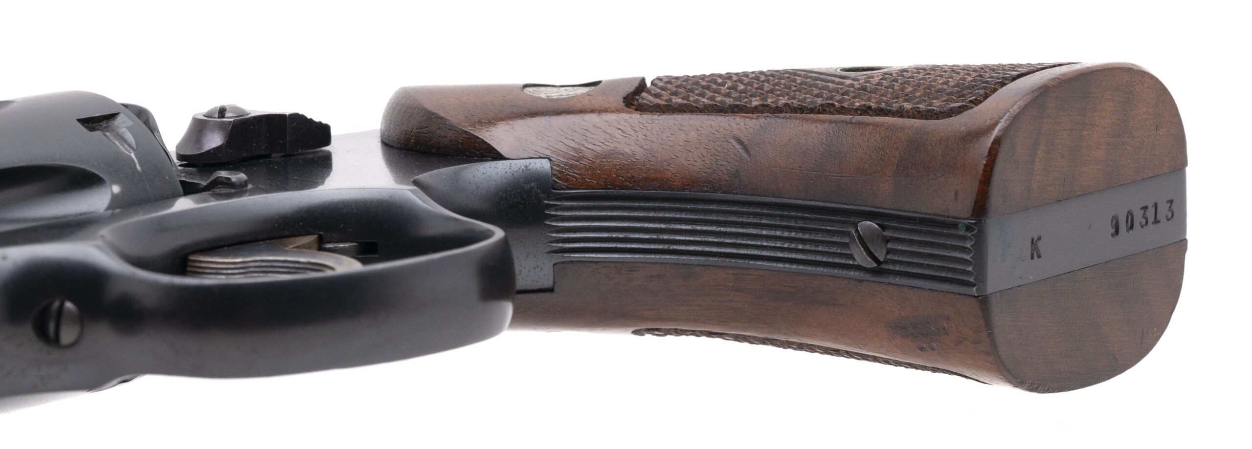 SN: K90313. Made in 1950, .38 Special with a 4" pinned barrel. Bore is bright with strong rifling. Original 5-screw pre-model 15 Combat Masterpiece revolver with color case trigger & hammer. Blue finish is in very good condition. Wood grips are very good. Overall condition is very good.