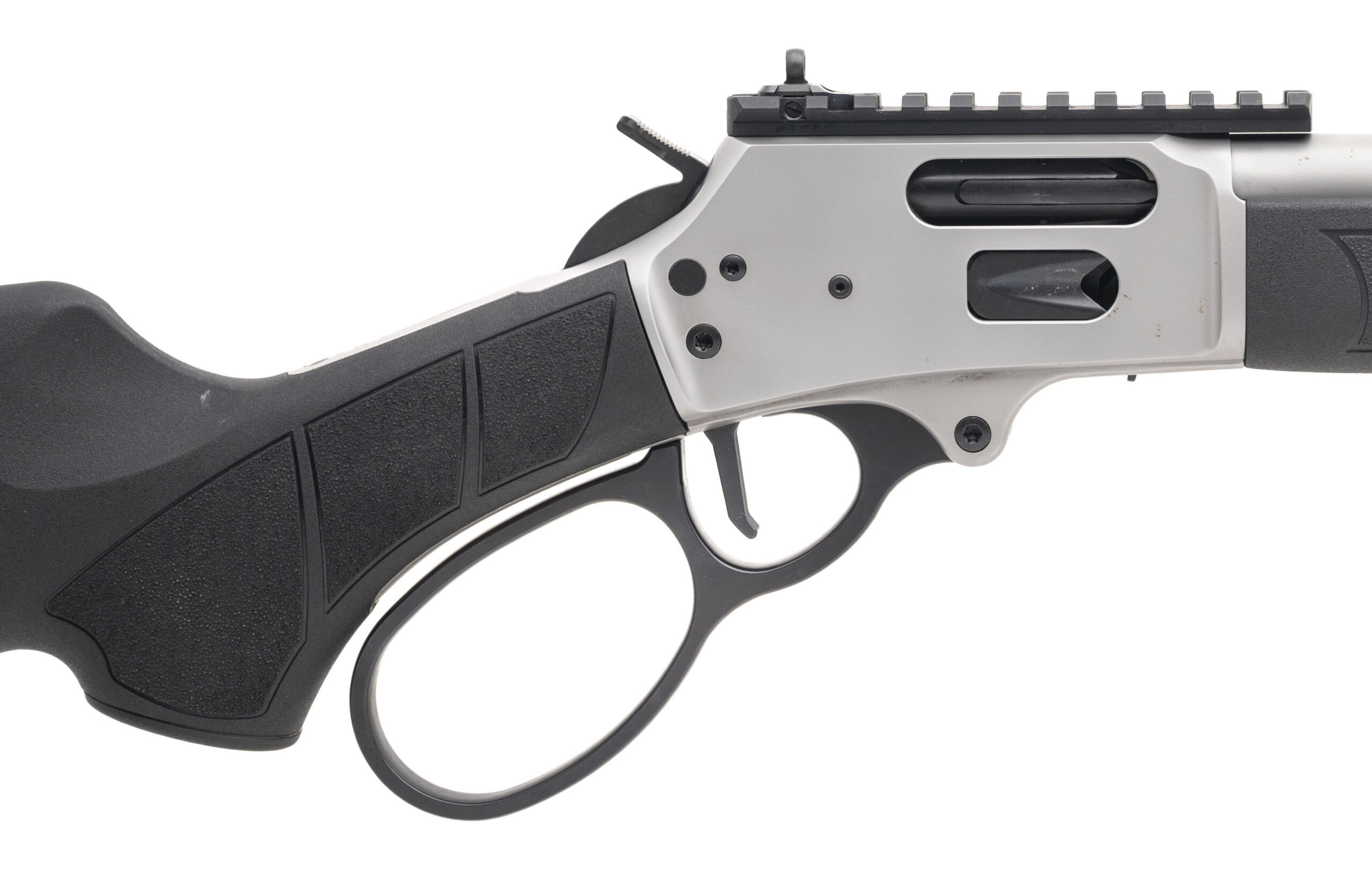 SN: LAS5476. Modern production lever action rifle chambered in 44 rem mag with a 19" threaded barrel, gold bead front sight, ghost ring rear sight with picatinny rail mount, side loading gate, cross bolt style safety and flat face trigger with large loop lever. Satin stainless steel metal finish and black synthetic furniture. Overall in excellent condition. Comes with original box.