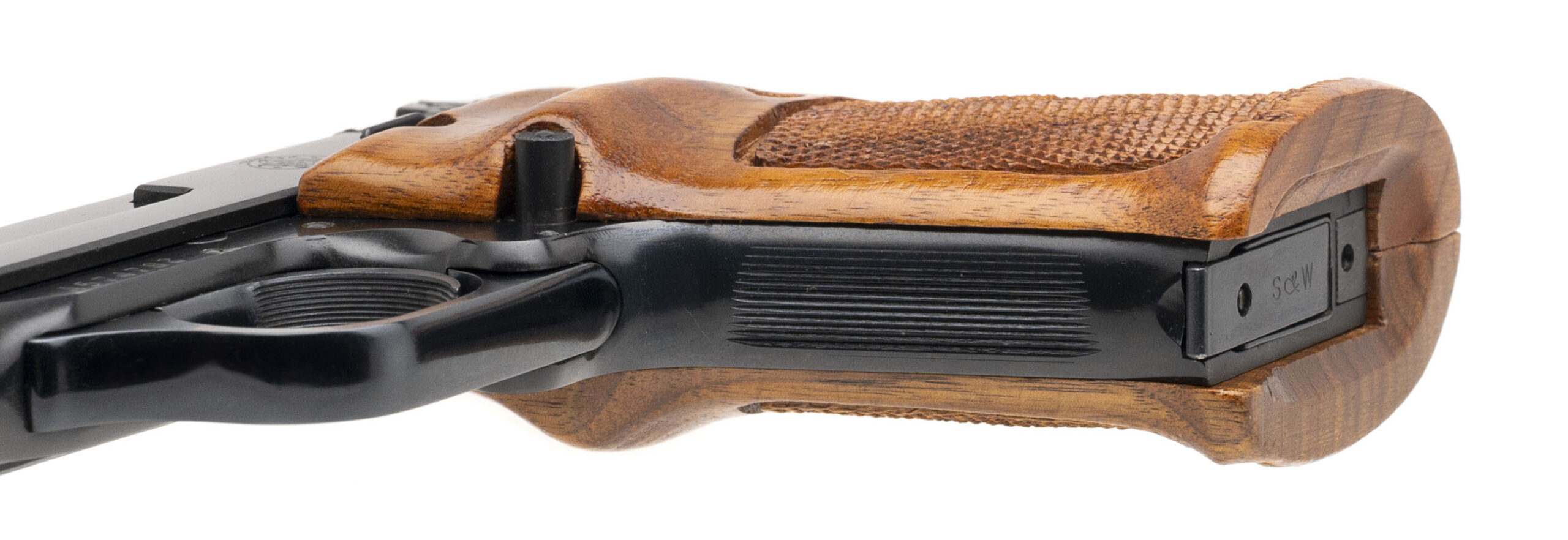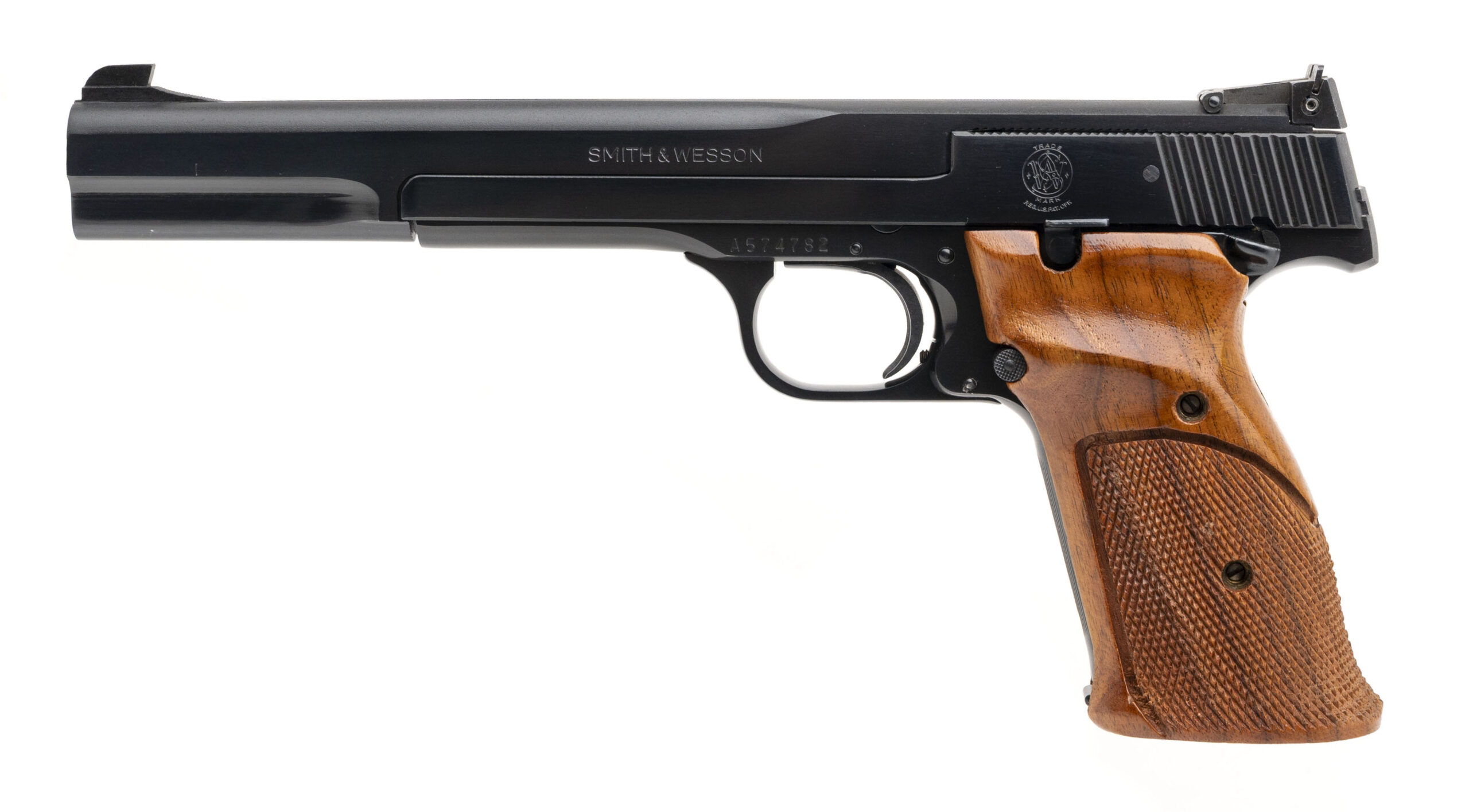 SN: A574782 made in 1979. 22 caliber semi-auto target pistol with a 7” fixed barrel and reciprocating slide, target sights with adjustable rear, blued finish and original wrap around checkered walnut grips in very good overall condition. Comes with original box and extra magazine.