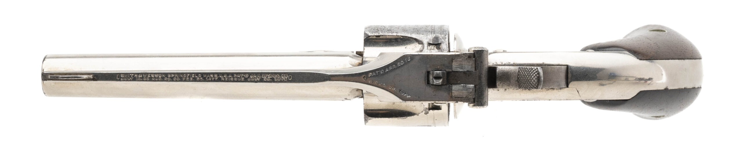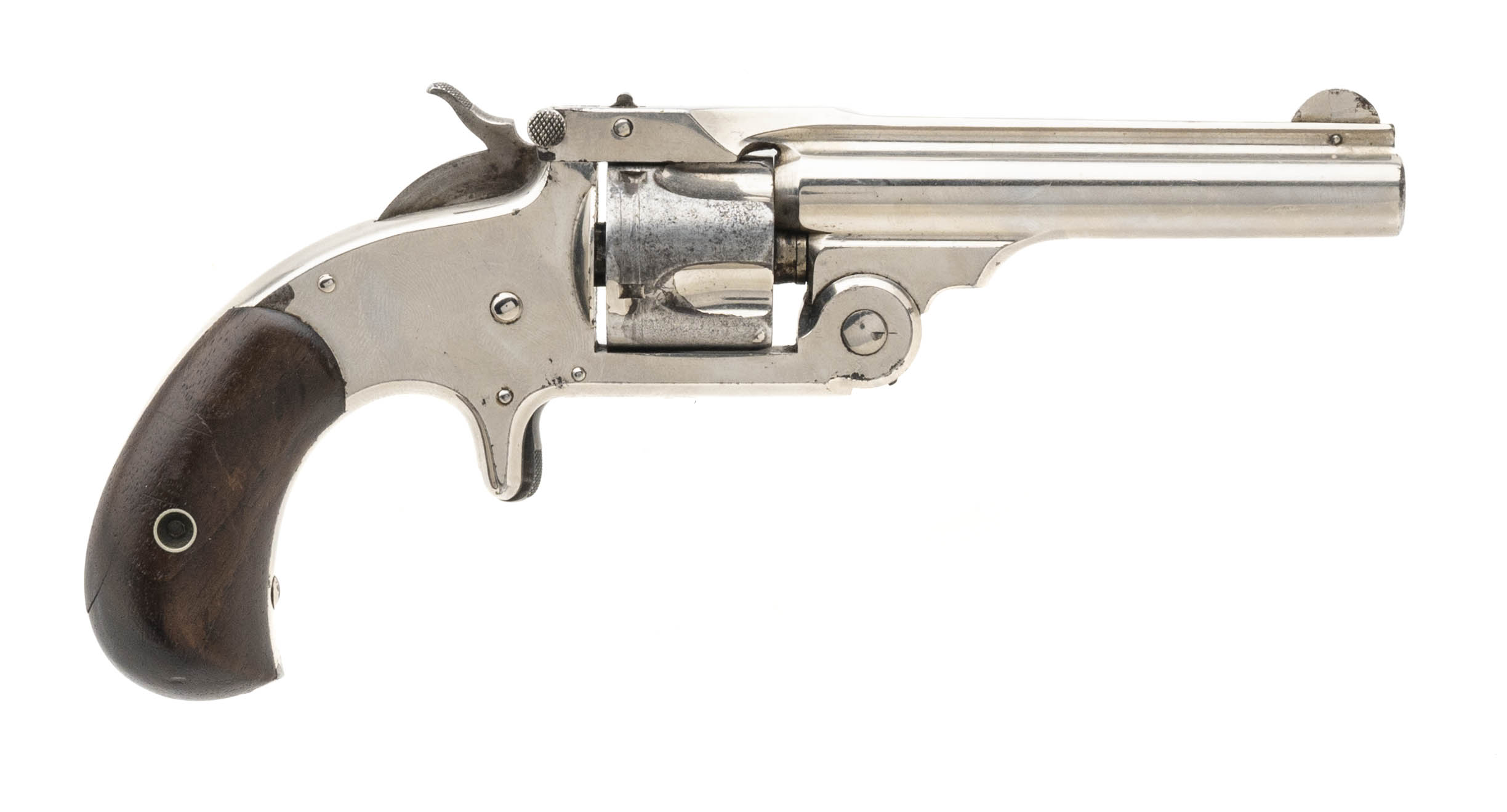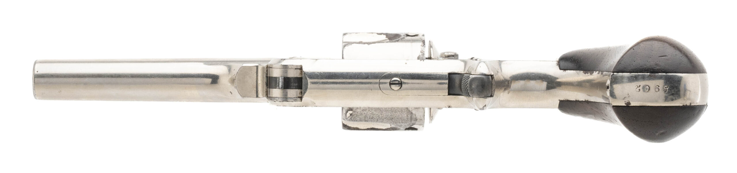 Serial No. 5902, circa early 1880’s, .32 S&W, 3 ½” round barrel. Bore is bright with frosting and scattered oxidation in the grooves, rifling still remains strong. 95% nickel finish is visible with most flaking noted on the cylinders edge. Factory stamping is sharp, serial numbers are matching. Two-piece wooden grips have light handling marks noted. Action indexes and functions correctly with a tight lock up.