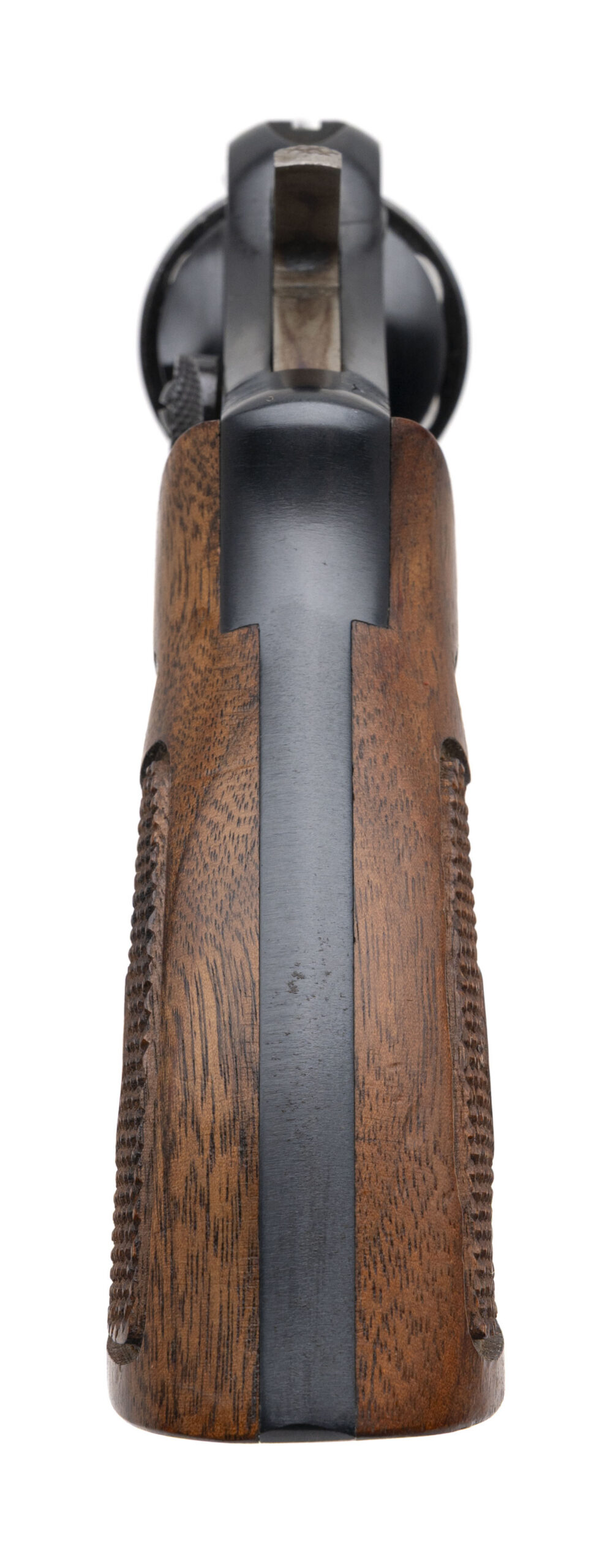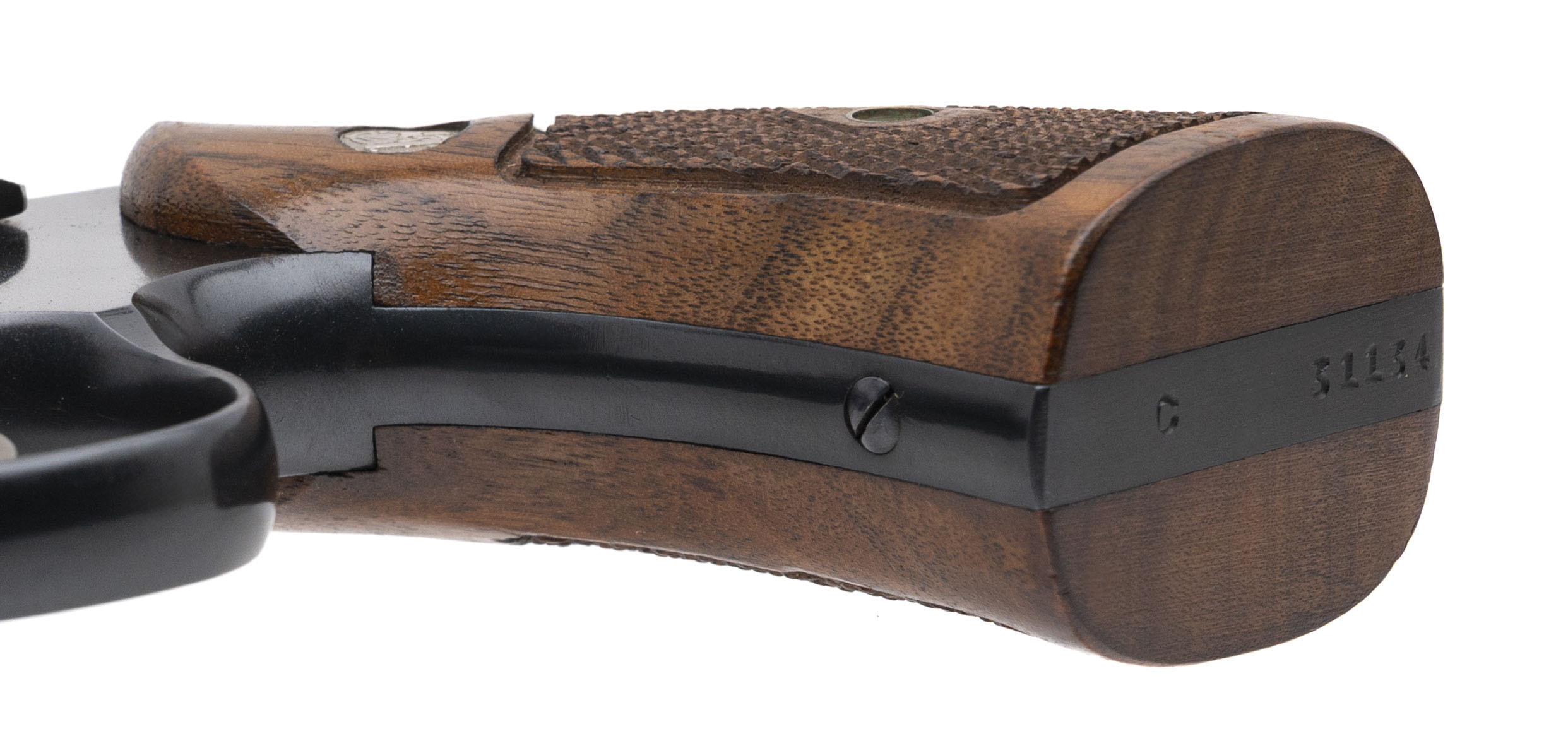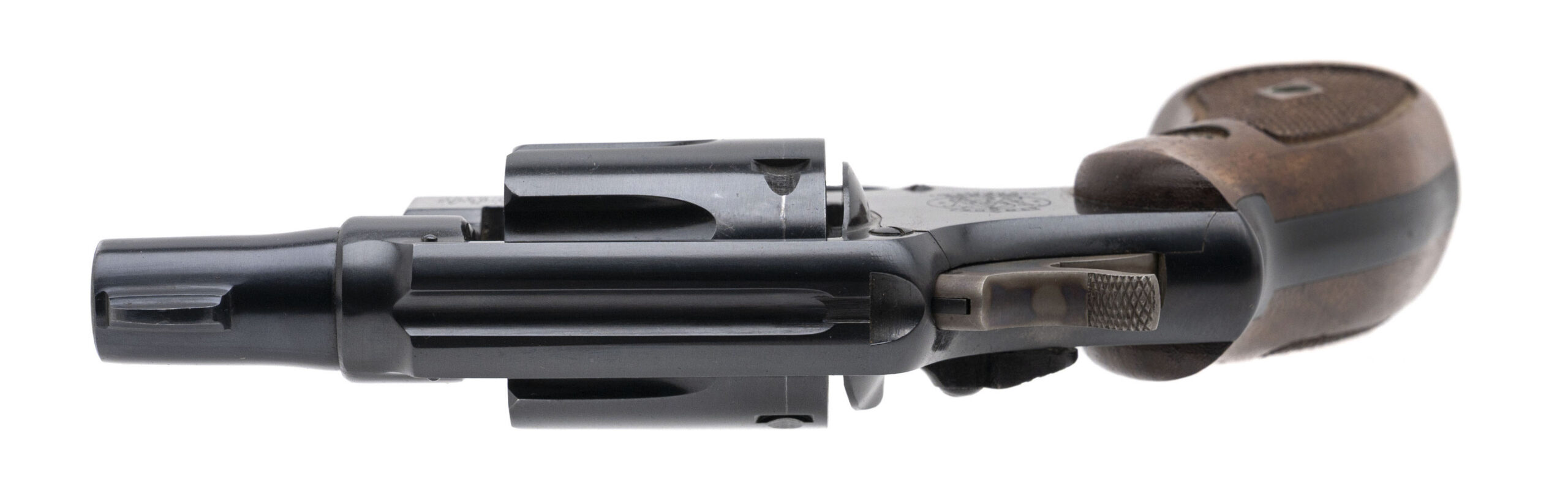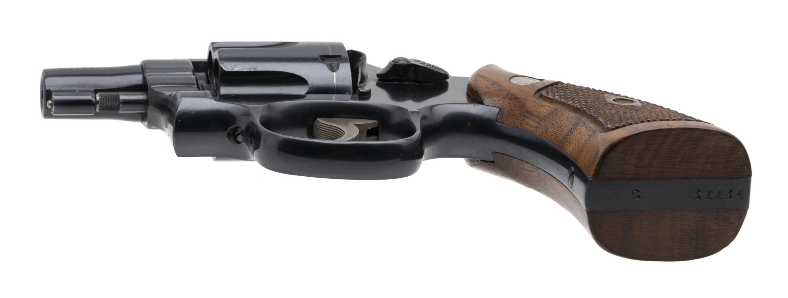 SN: C31134. 1948 production, .38 Special with a 2" pinned barrel. Bore is very good. Scarce 5-screw pre-model 10 snubnose revolver. Has the early round front sight and correct diamond checkered wood grips. Finish shows wear with most of the blueing present. Very good condition overall.