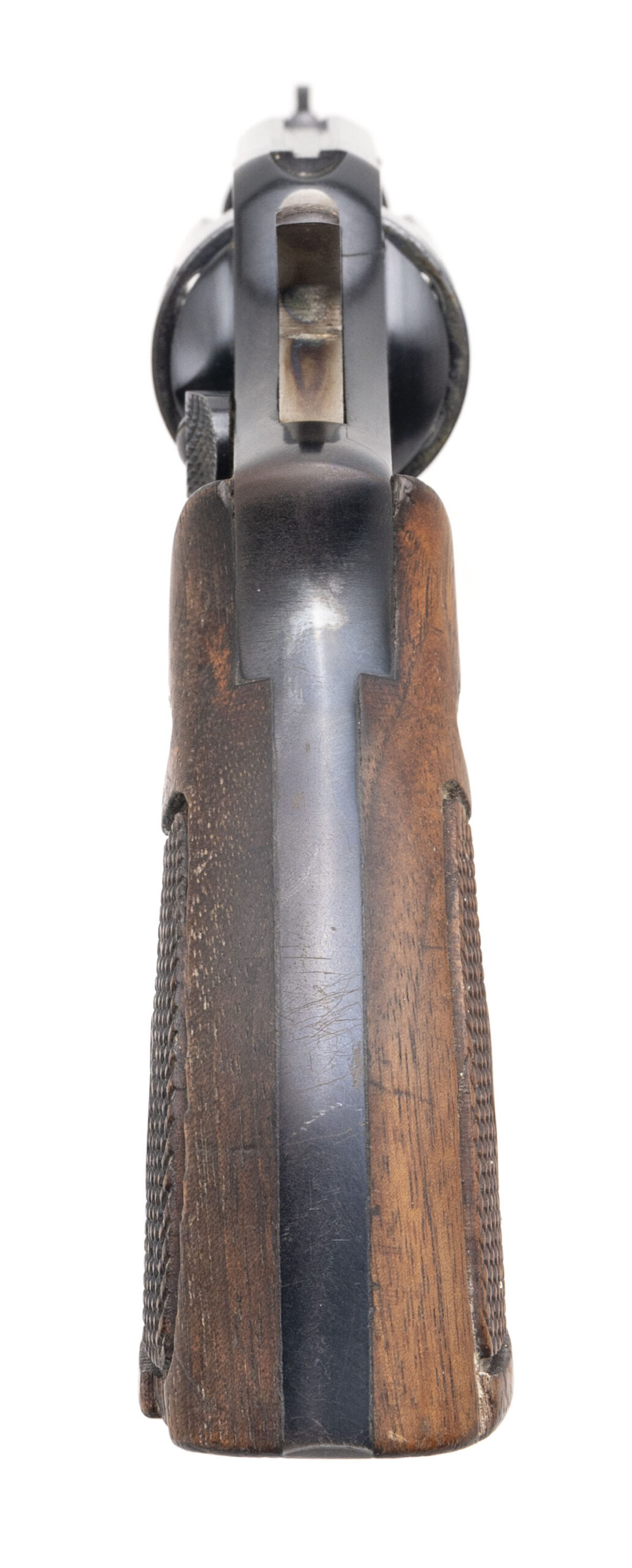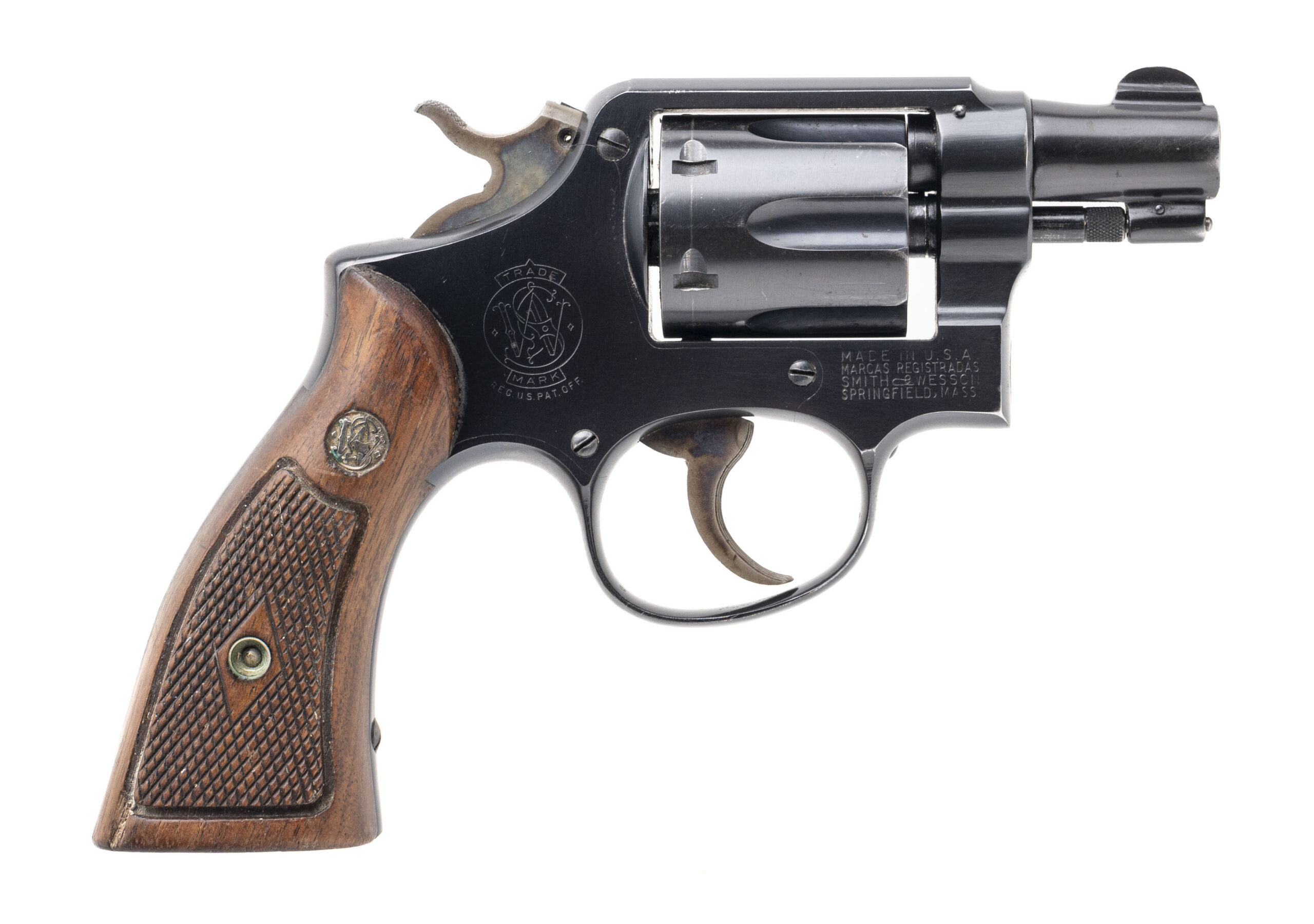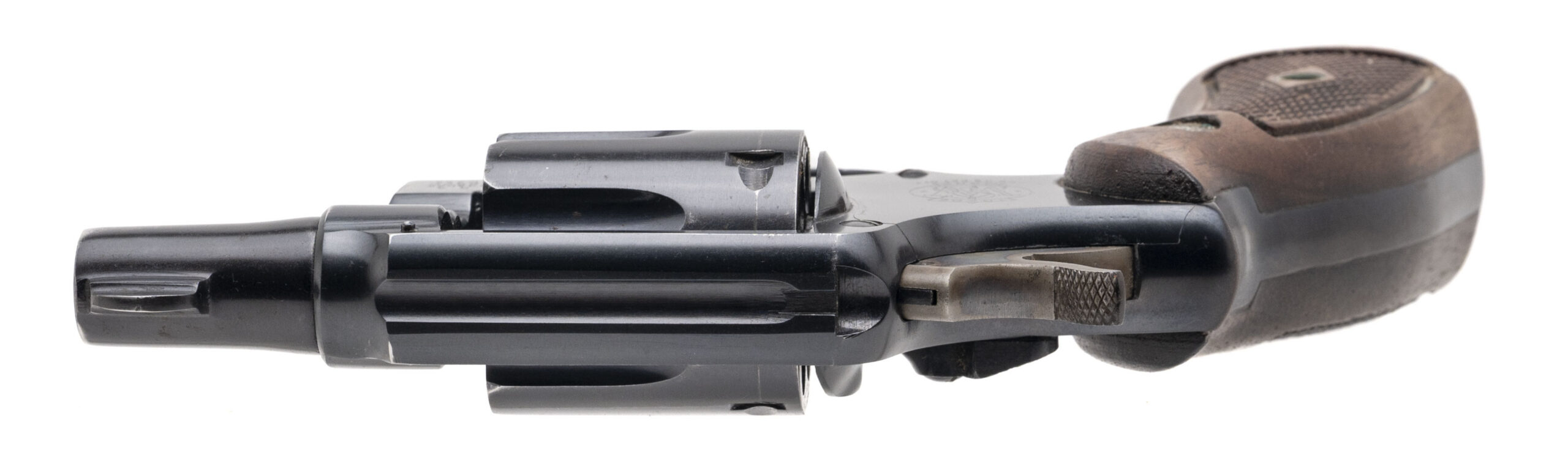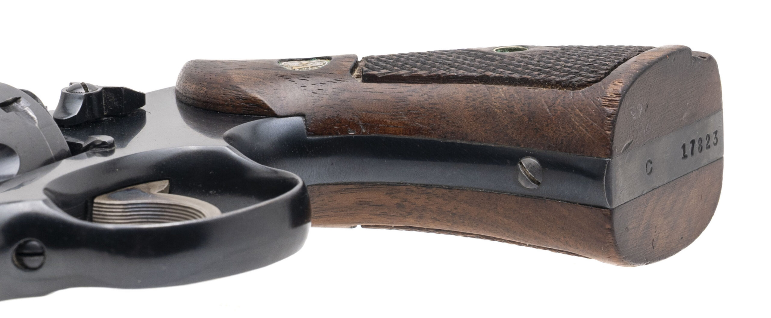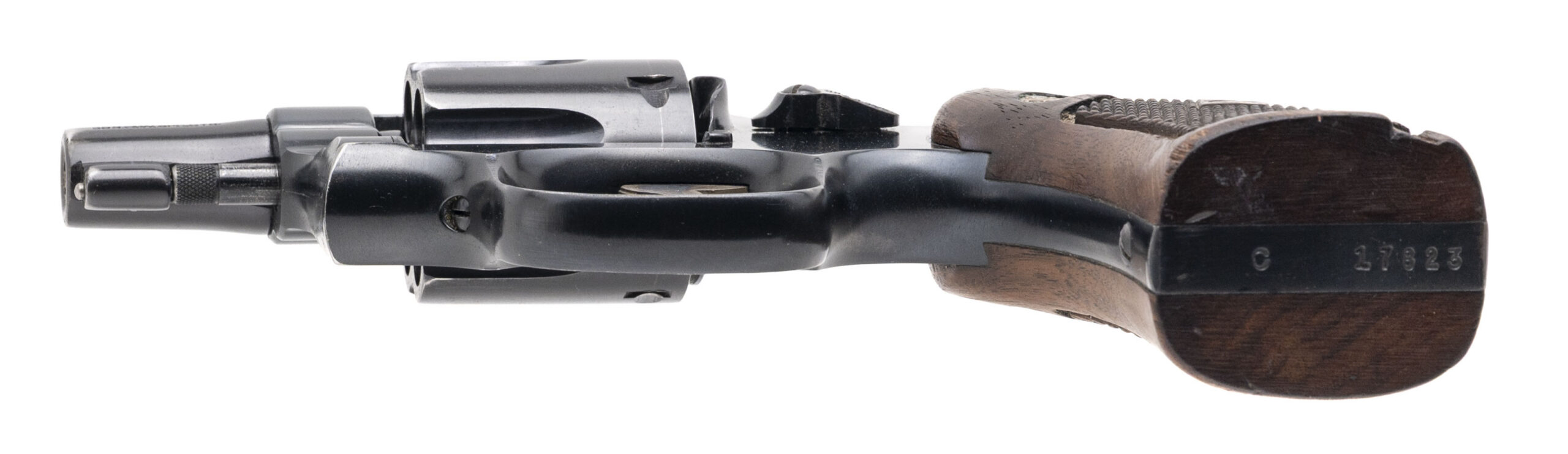 SN: C17823. 1948 production, .38 Special with a 2" pinned barrel. Bore is very good. Scarce 5-screw pre model 10 snubnose revolver with the early round fixed front sight and correct diamond checkered wood grips. Finish shows wear with most of the bluing present, and the left grip has a chip at the base of the wood. The overall condition is very good.