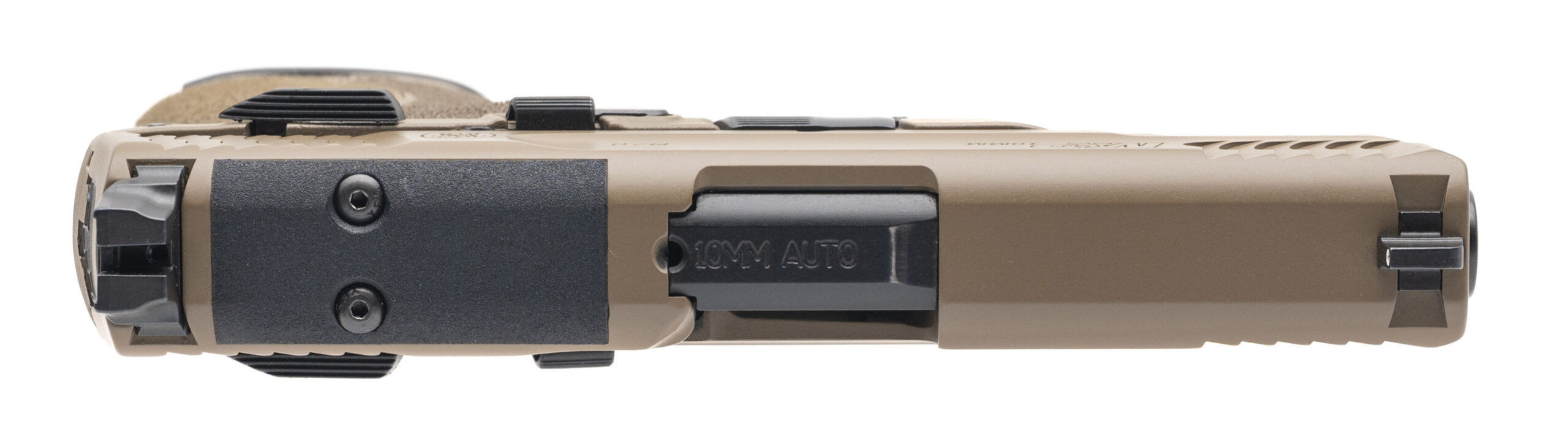 SN: NNH5408. Modern production, 10mm with a 4.25" barrel. Bore is very good. Full size striker-fired polymer frame pistol with an optics ready slide, 3 dot sights, ambidextrous manual thumb-safety & slide release, accessory rail, and FDE cerakote finish. Finish shows light handling marks. Overall condition is near excellent. Includes an additional magazine, and original box.