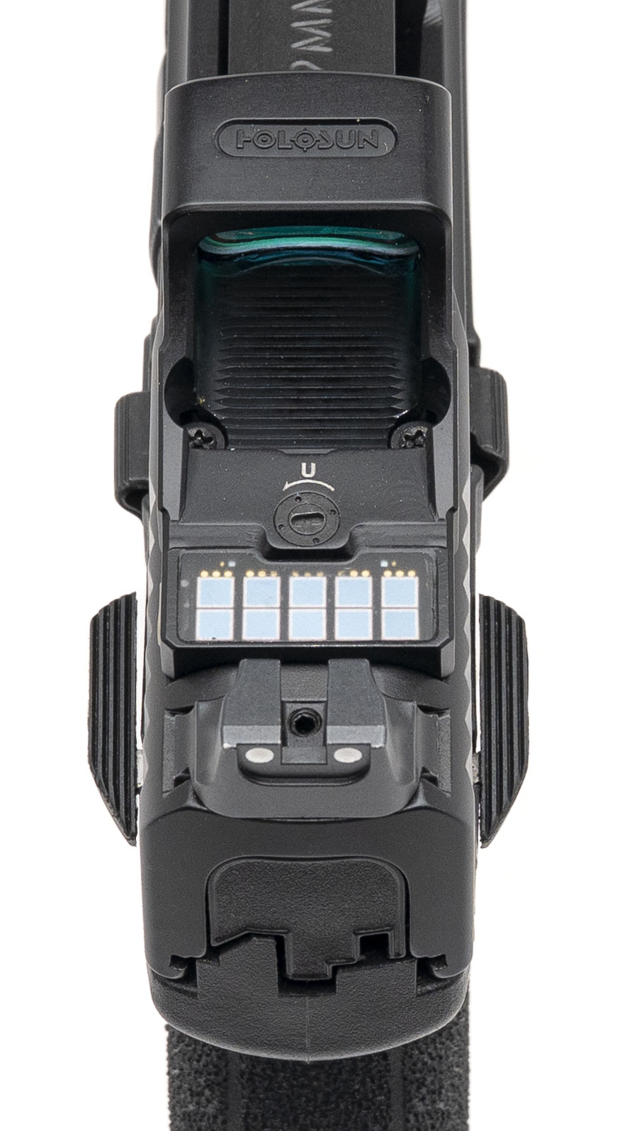 SN: NLV0489. Modern production, 9mm with a 3.6" barrel. Bore is excellent. Compact striker-fired pistol with a Holosun SCS MP2-GR green dot optic, co-witnessed 3-dot sights, ambidextrous manual thumb-safety, accessory rail, matte black finish, and black polymer frame. Includes an additional 15rd magazine, and original box. Overall condition is excellent.