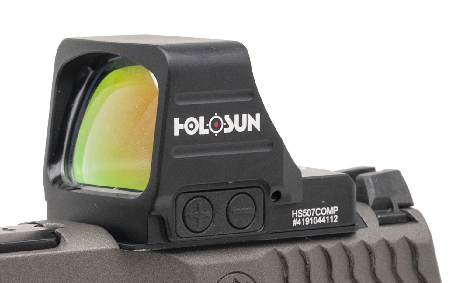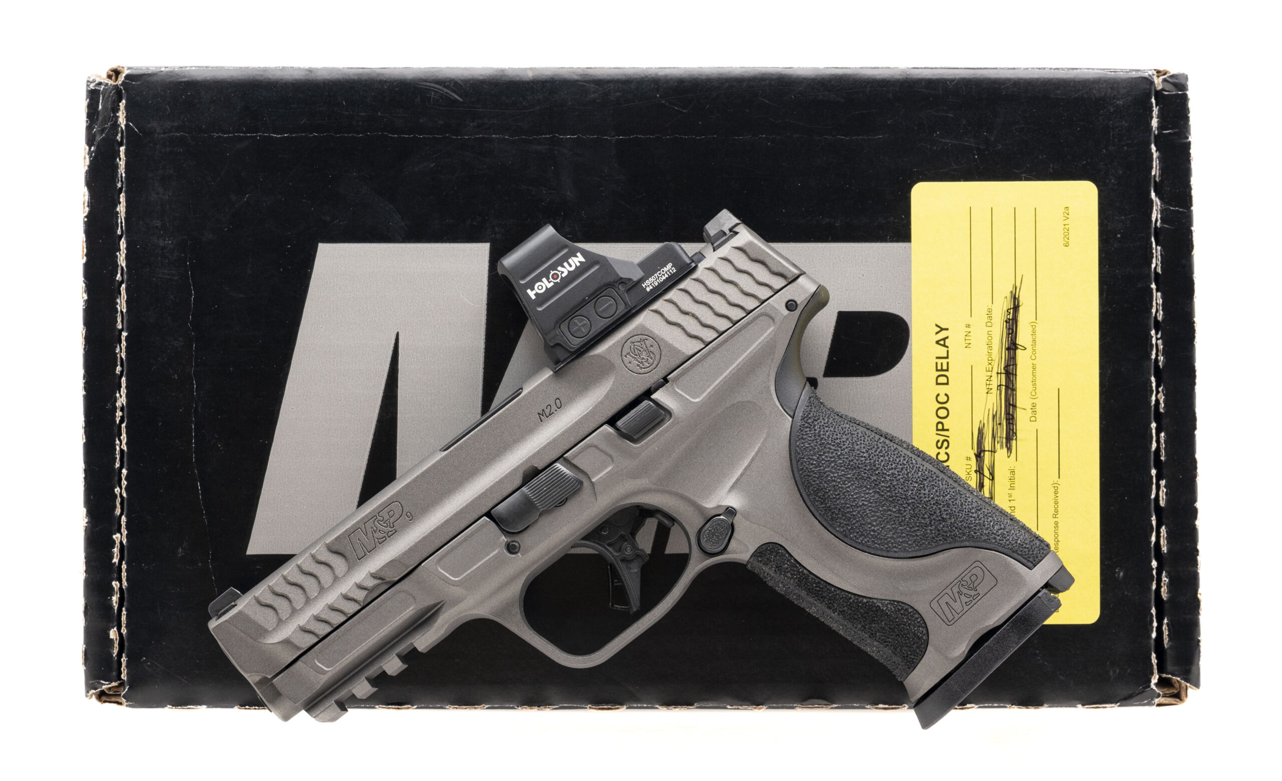 SN: SBS5361. Modern production, 9mm with a 4.25" barrel. Bore is very good. Compact alloy frame striker-fired pistol with a Holosun HS507COMP red dot sight, ambidextrous slide release, accessory rail, and tungsten gray cerakote finish. Includes original box. Overall condition is excellent.