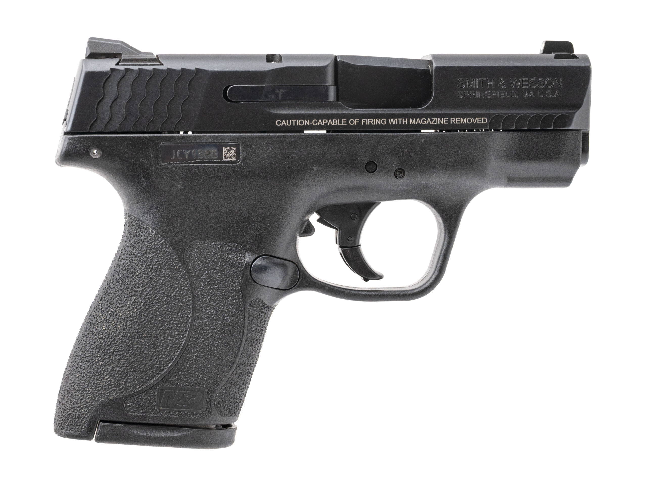 SN: JCY1395. Modern production, 9mm with a 3.1" barrel. Bore is excellent. Micro-compact striker-fired pistol with 3 dot sights, manual thumb-safety, matte black finish, and black polymer frame. Overall condition is excellent. Includes an additional magazine, and original box.
