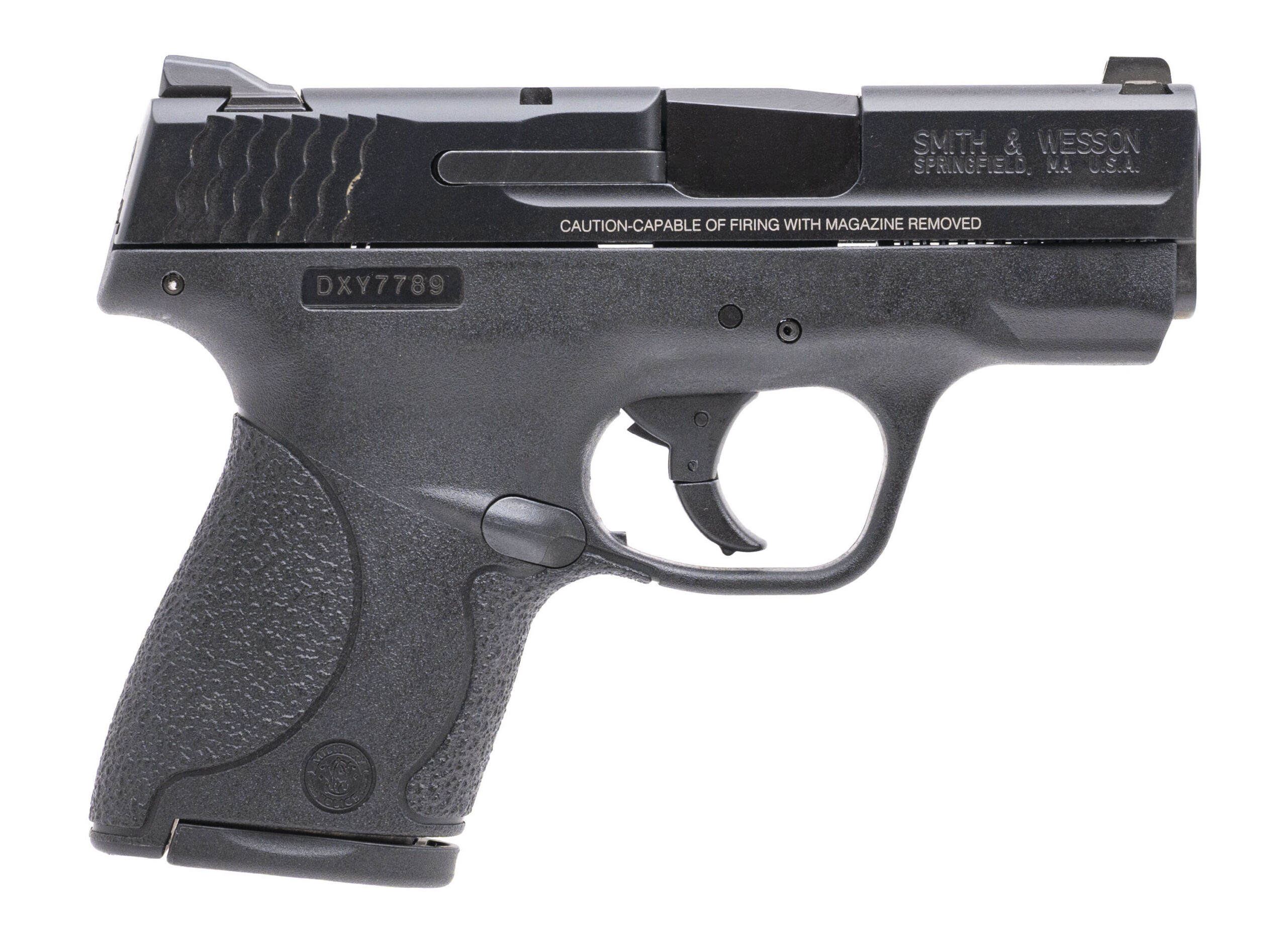 SN: DXY7789. Modern production, 9mm with a 3.2" barrel. Bore is very good. Sub-compact striker fired pistol with a manual safety. Overall condition is very good.