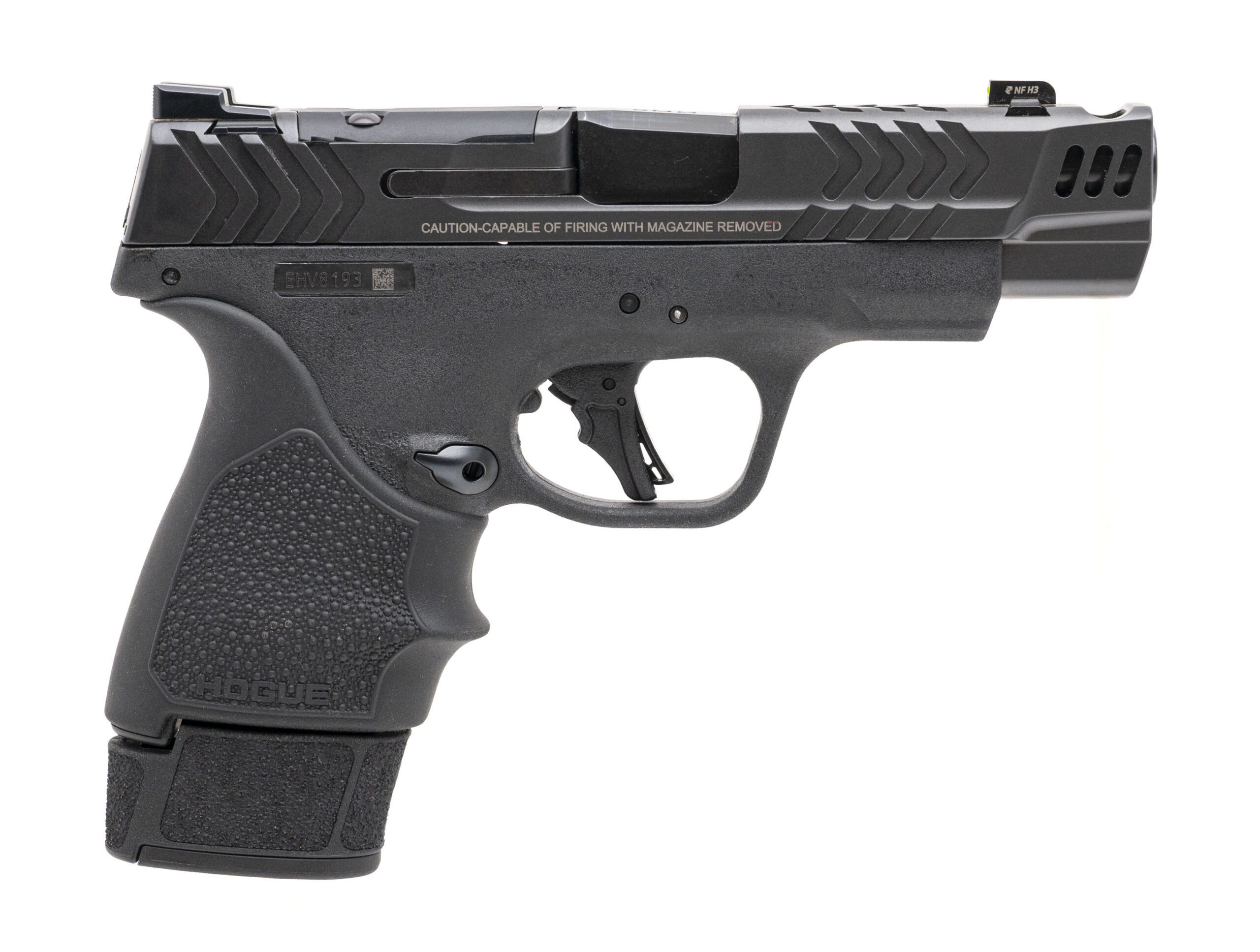 SN: EHV8193. Modern production, 9mm with a 4" ported barrel. Bore is very good. Performance Center tuned striker fired pistol with an optic cut, tritium front sight, and polymer frame w/Hogue rubber grip sleeve. Very good condition overall.