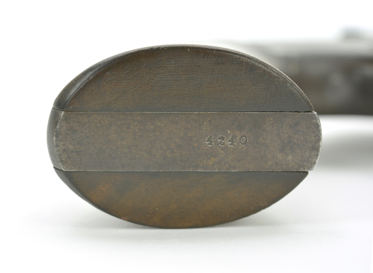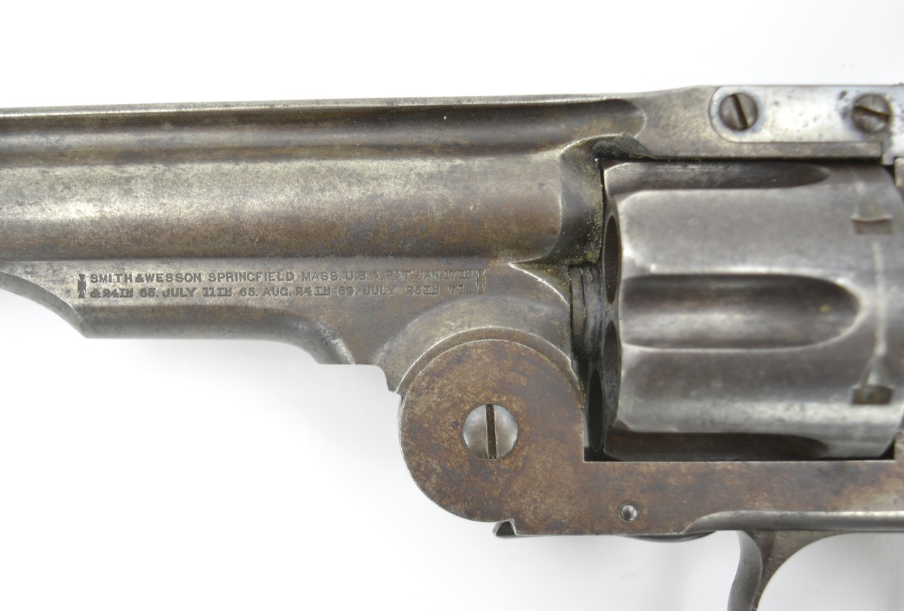 Smith & Wesson Schofield Revolver. 5” barrel. Gun looks to have been made originally at 5”, but there is a faint U.S. marking on the butt. Nice sharp gun with a gray to brown patina. Nice clear markings beside the U.S. on the butt. Bore has pitting with visible rifling. Action works perfect.