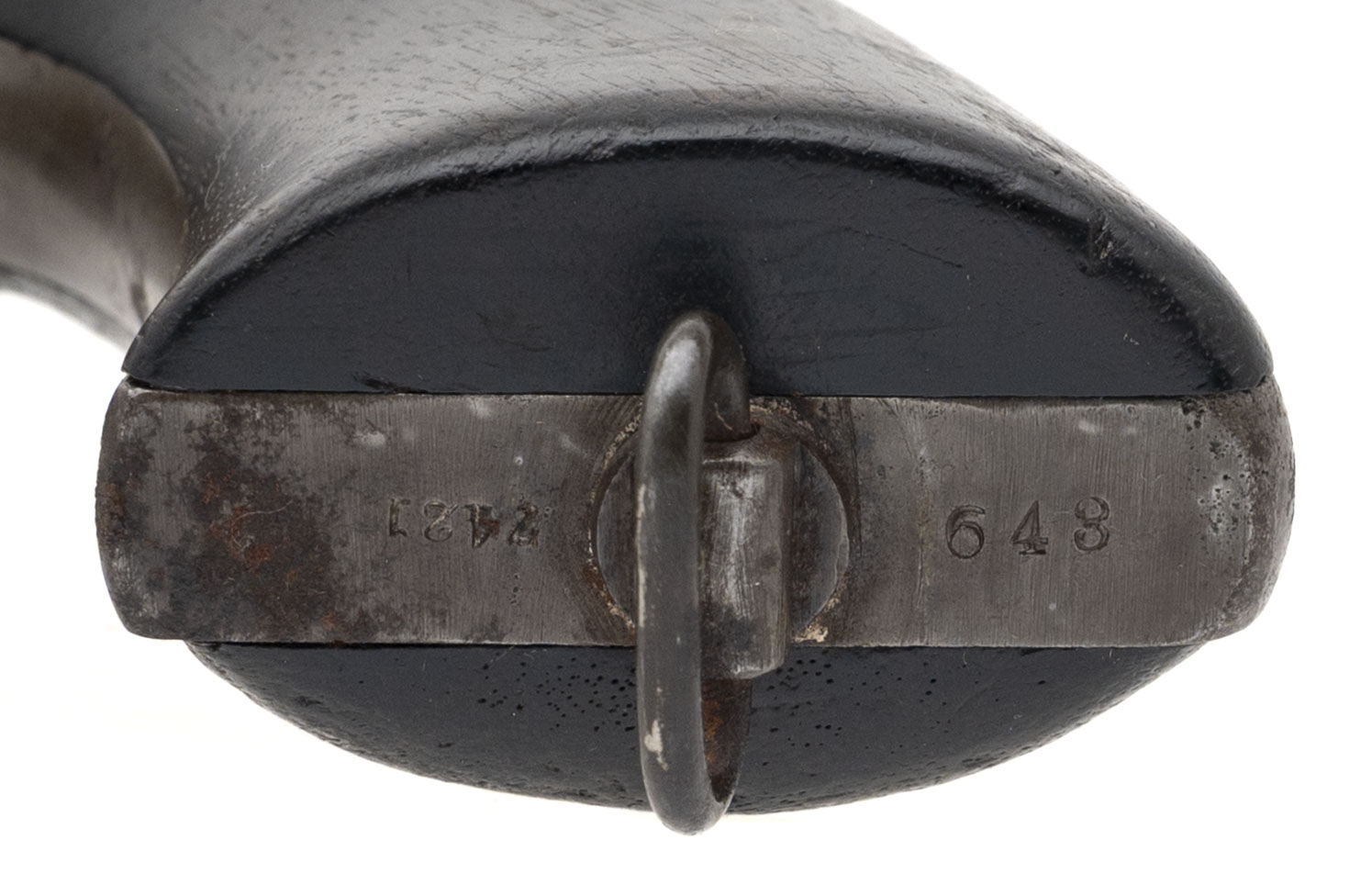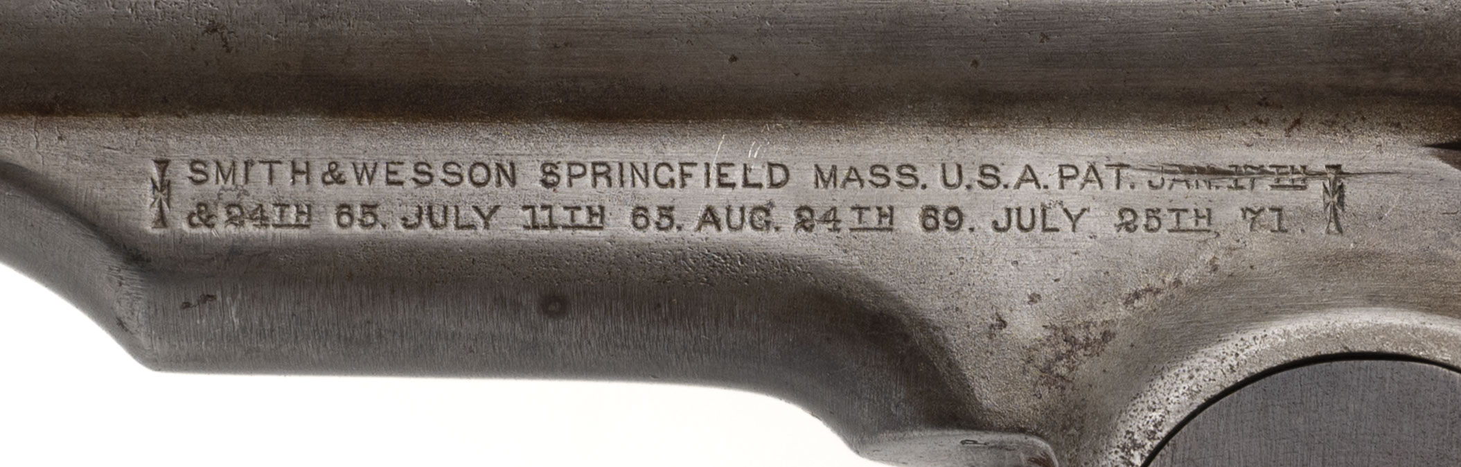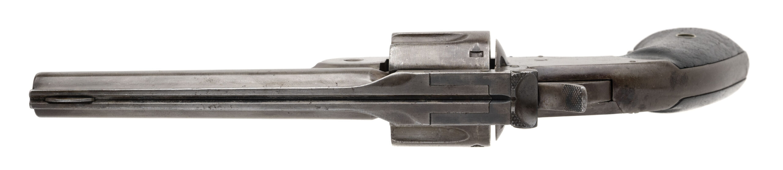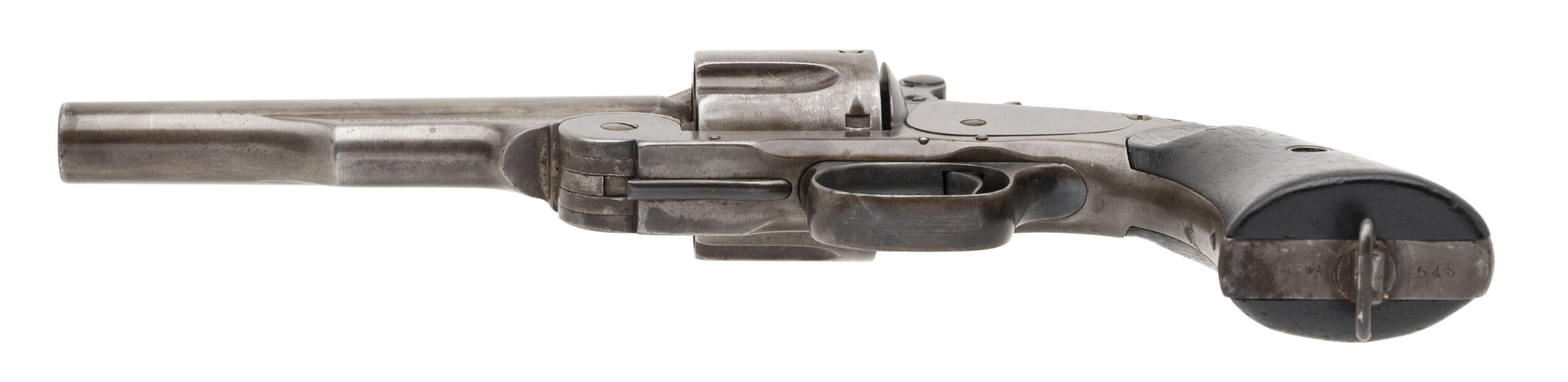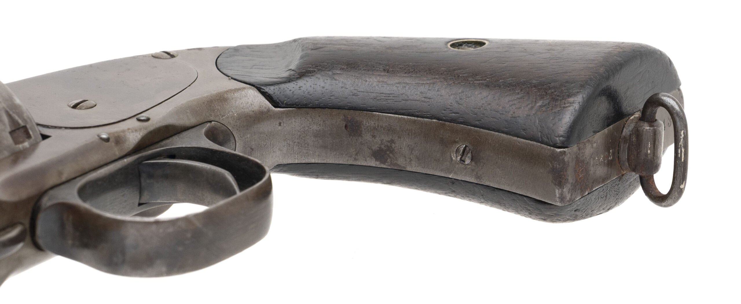 Serial number 7421. Made in 1875. 45 Schofield caliber with a 5” barrel. This gun has a gray to light brown patina. The action revolves, but does dot completely lock up. The grips show heavy carry use. The Wells Fargo marking on this gun does not appear to be authentic.