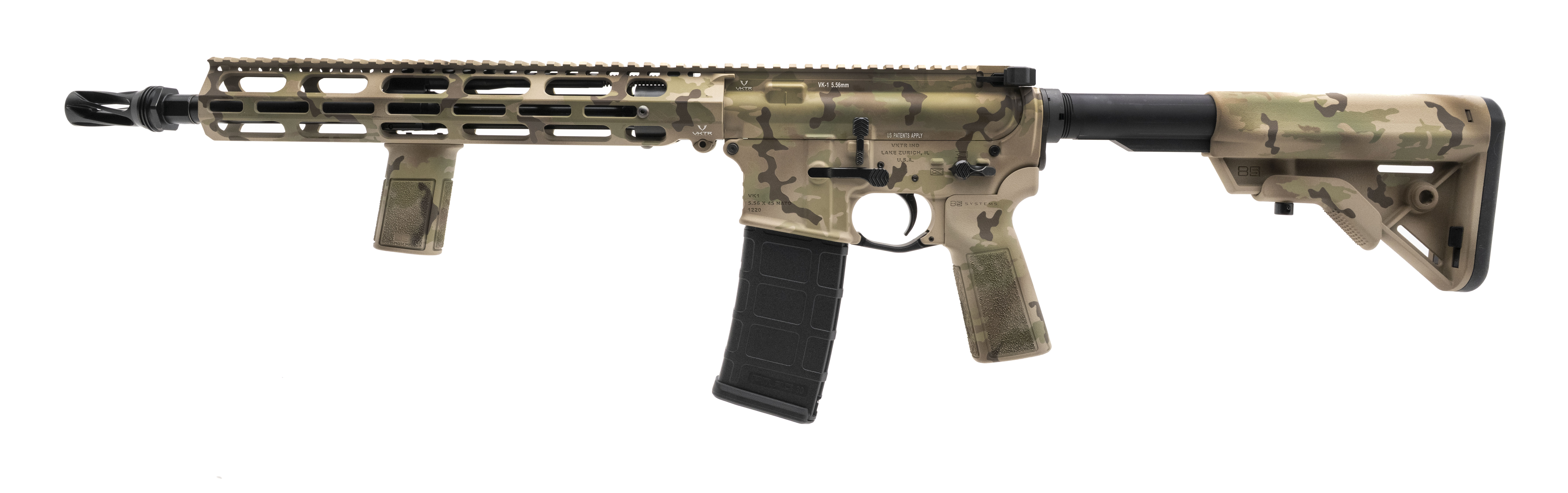 VKTR VK-1 5.56 NATO with an 13.7" Hammer Forged Pinned & Welded Barrel with an HUXWRX QD-XL Muzzle Device. Operational Field Camo (Multicam/OCP) Finish, Piston Driven Operating System. Heavy Duty Buffer Retainer and Patented Billet Ambi Controls also a Precision machined one-piece patented bolt carrier with correct timing, revised cam path, finished in thin, dense chrome. Patented enhanced cam path for consistent lock up, shot after shot. Match performance right out of the gate. NEW.