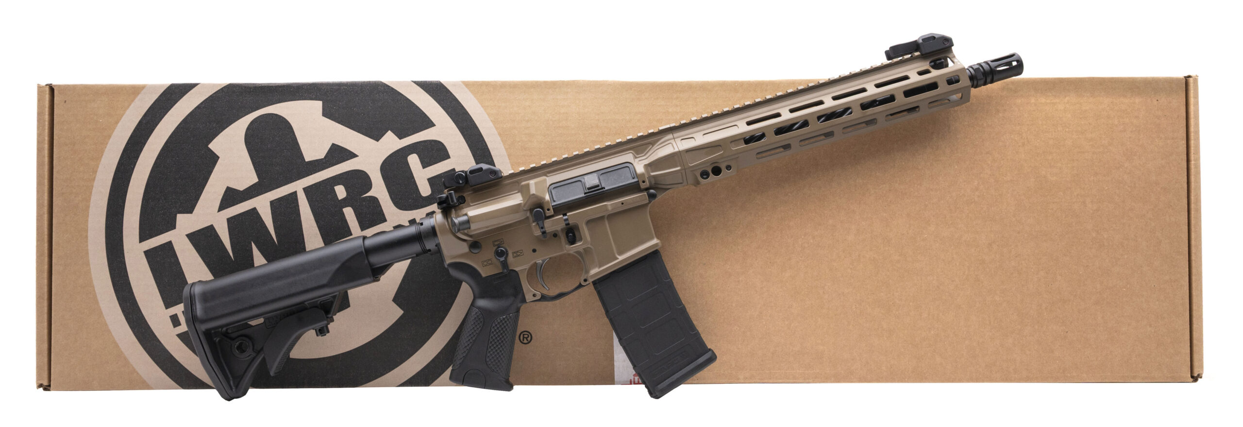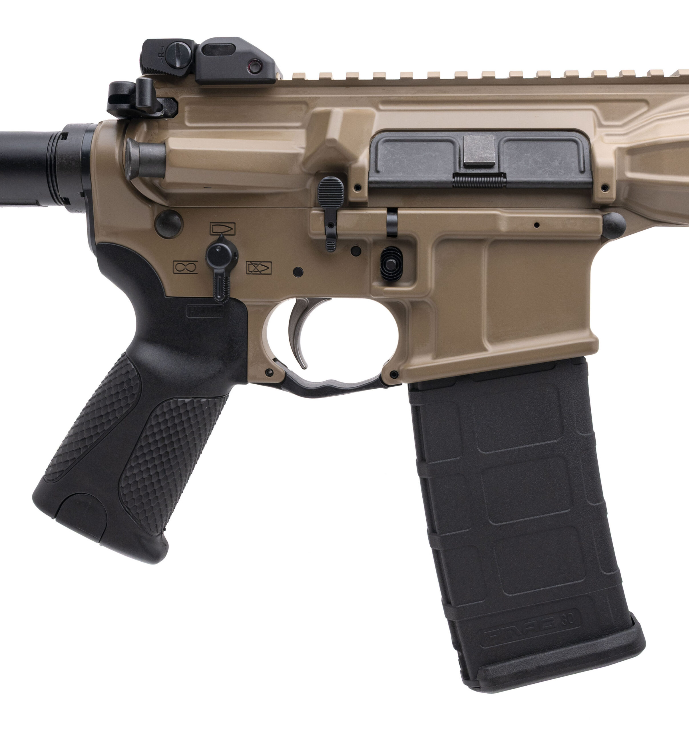 Semi-Automatic Tactical Rifle with a 12.7" Spiral Fluted Barrel. Short Barrel Rifle (SBR), FDE Cerakote Finish, Polymer Grip w/Rubber Scaled Texturing, Piston Driven Gas System, Flip-Up Iron Sights, and Full Ambidextrous Controls. Includes 1-30rd Magazine. NEW. UPC: 850069802035 (CLASS III ITEM)(ALL NFA RULES APPLY)(STOCK PHOTO)