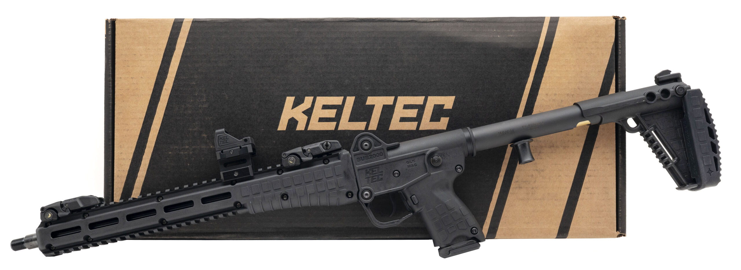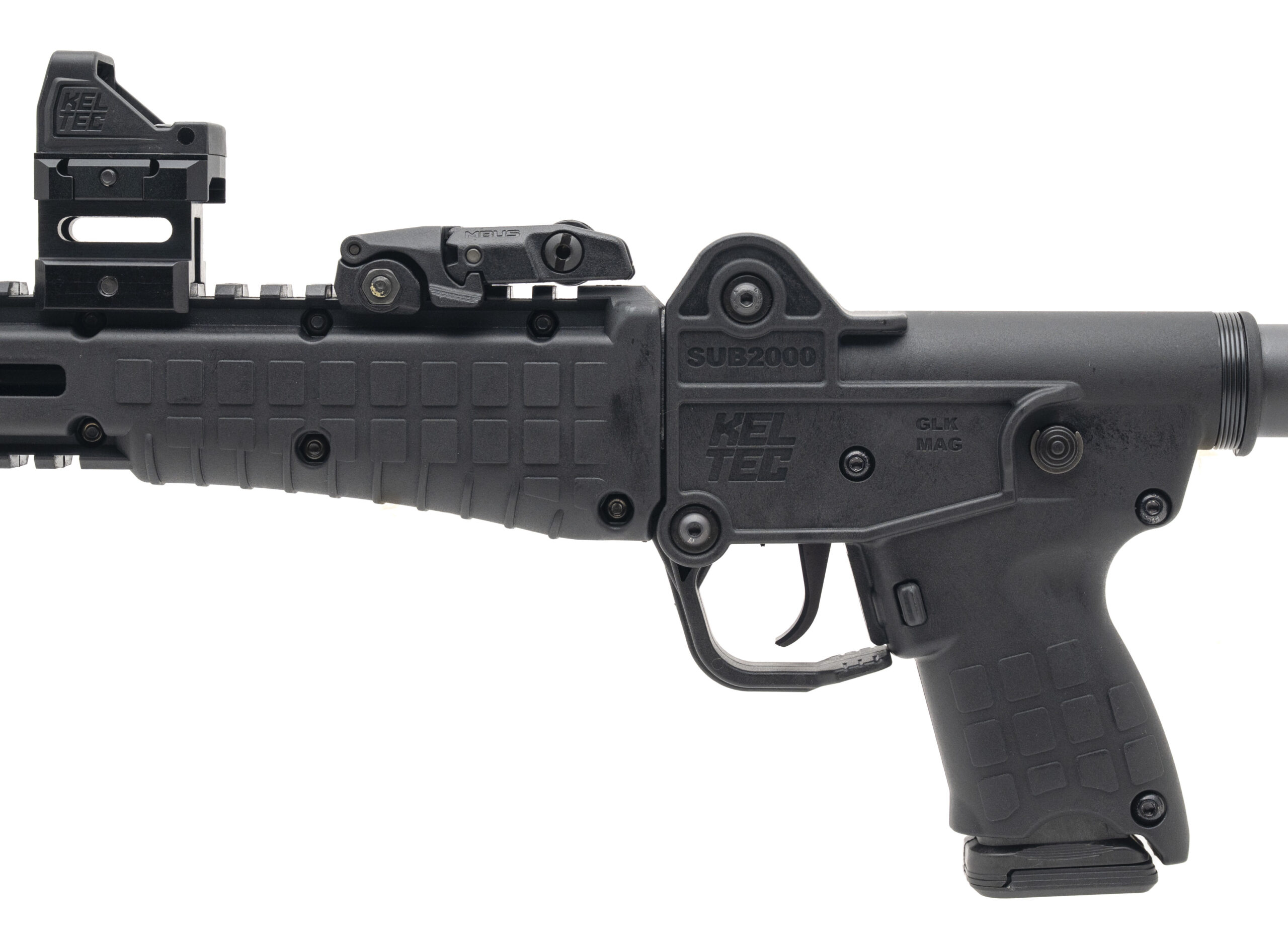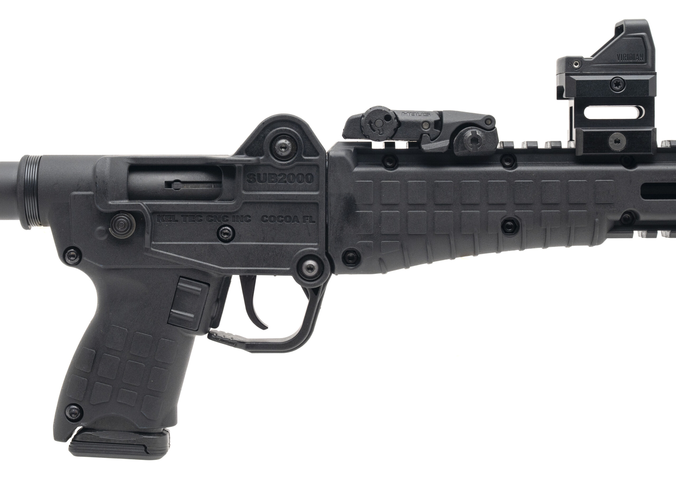 Semi-Auto Kel-Tec Sub2000 GEN3 Carbine 9mm with an 16.25" Threaded Barrel. Has Magpul Flip Up Sight Set, Viridian RFX11 Brass Bolt and Missouri Tactical Butt Pad. Accepts ONLY Glock 19 Magazine, Collapsible/Folding Stock. NEW. UPC: 640832010275