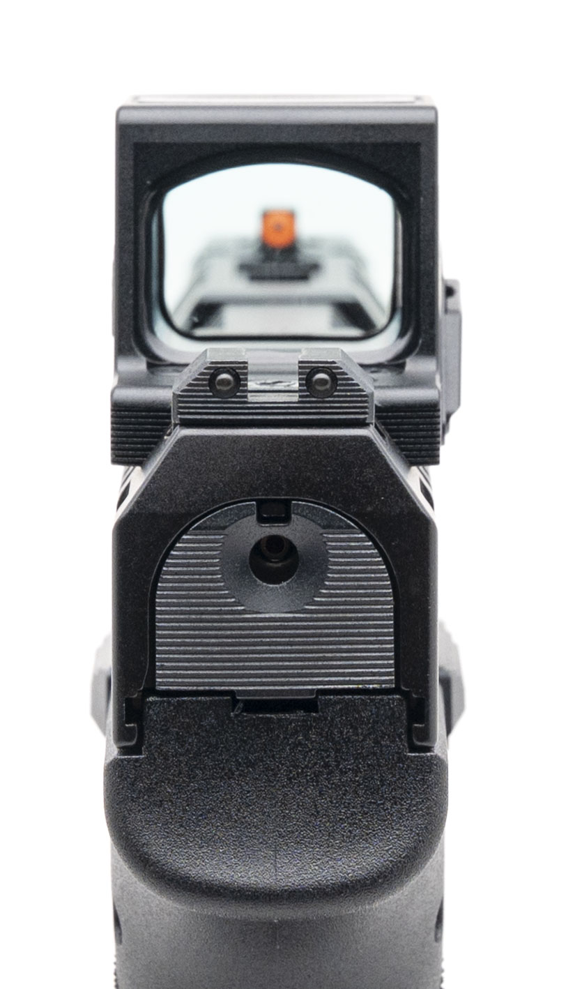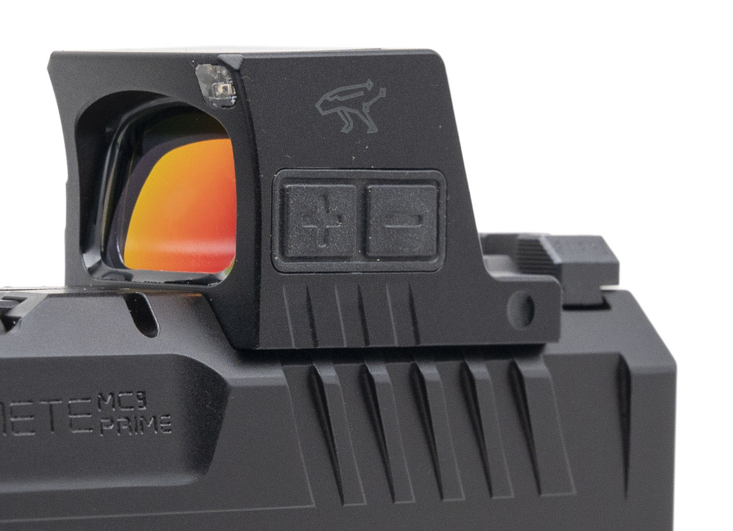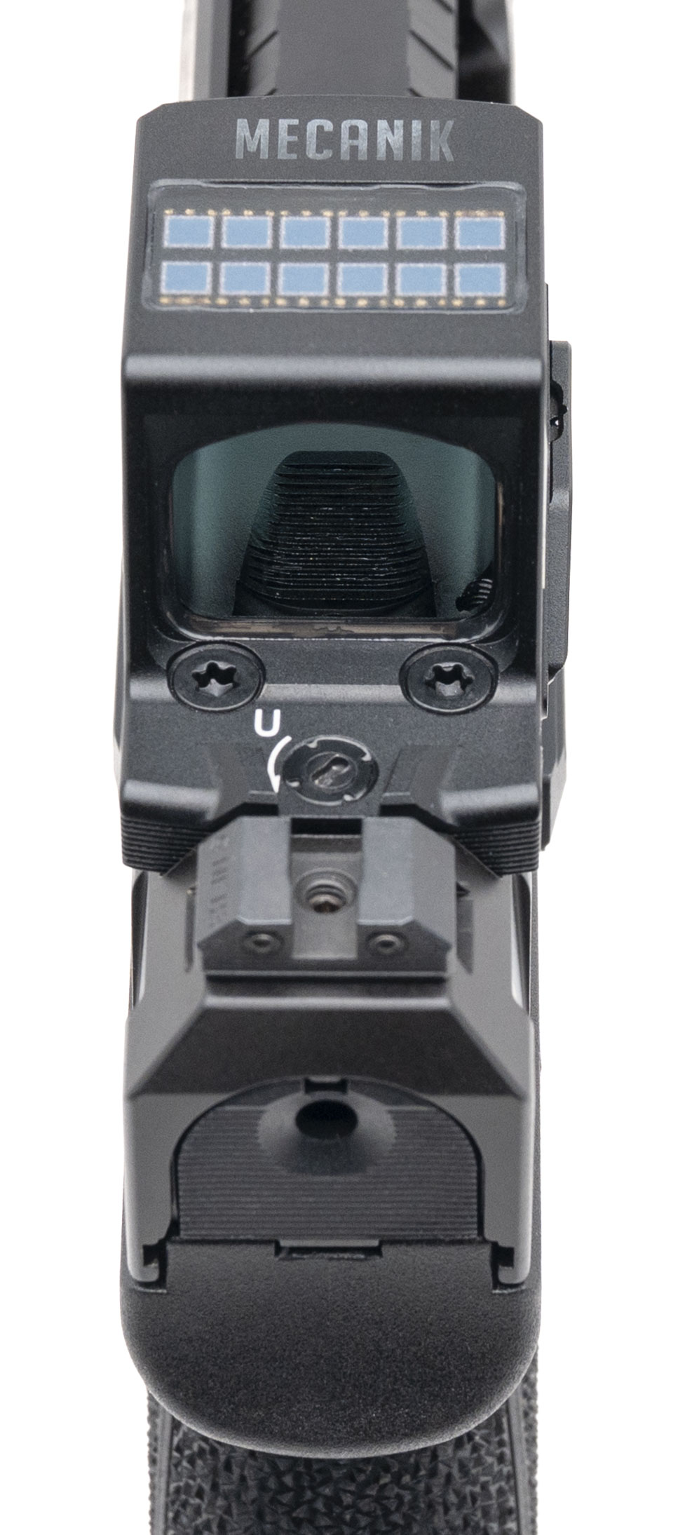 Striker Fired Pistol with a 3.64" Ported Barrel. Compact, MeCanik MO4 Red Dot Sight, Flat Face Trigger, Nitride Finish, Polymer Frame, Ported Slide, Night Sights, and Flared Magwell. Includes 2-17rd Magazines, and a Holster. NEW. UPC: 787450948730